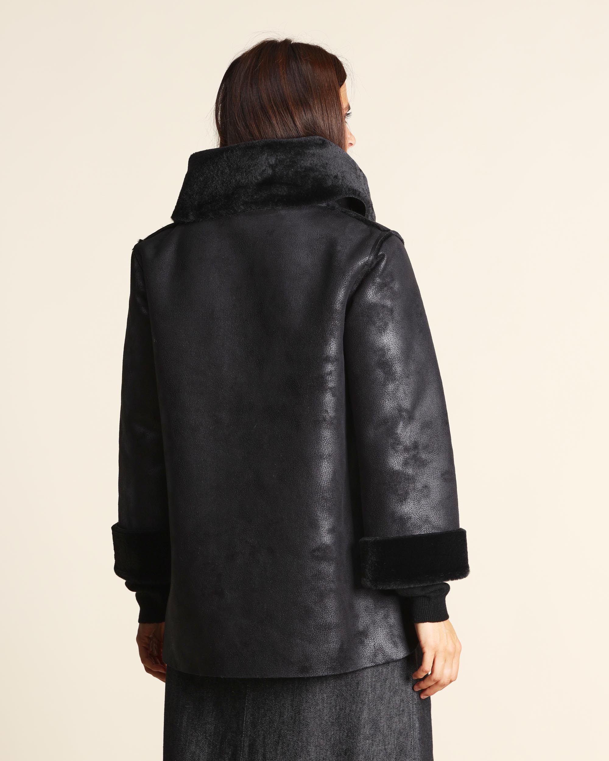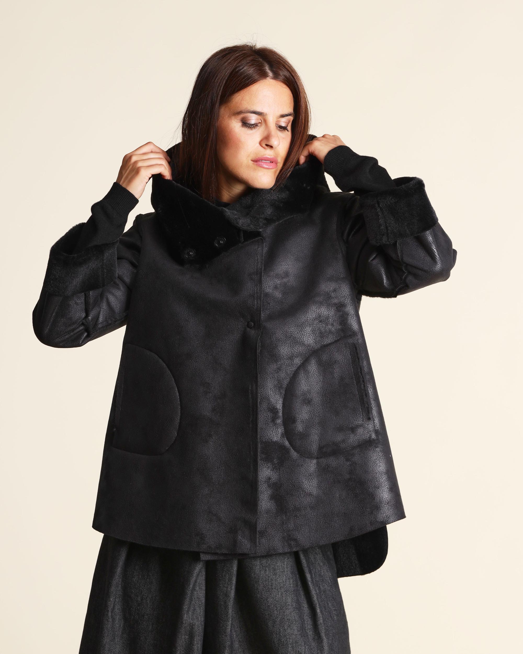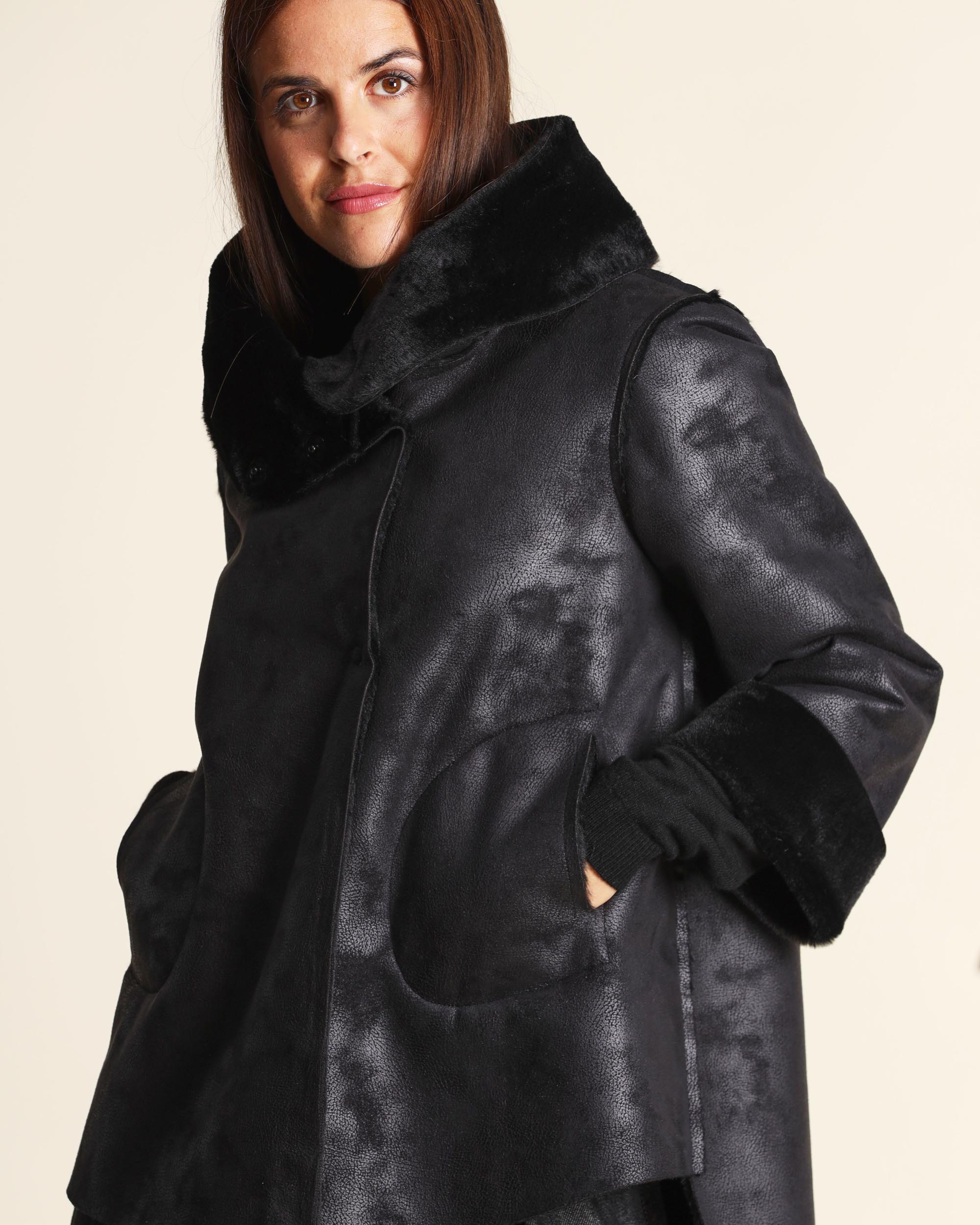 Giaccone nero in eco montone, collo alto, chiusura con bottoni automatici, linea morbida, maniche lunghe, tasche a filetto, made in Italy, la modella indossa una tg.42, la modella ha le seguenti misure: altezza 178, seno 86,vita 65, fianchi 93, collezione donna Collection Privèe Autunno Inverno 2025/26