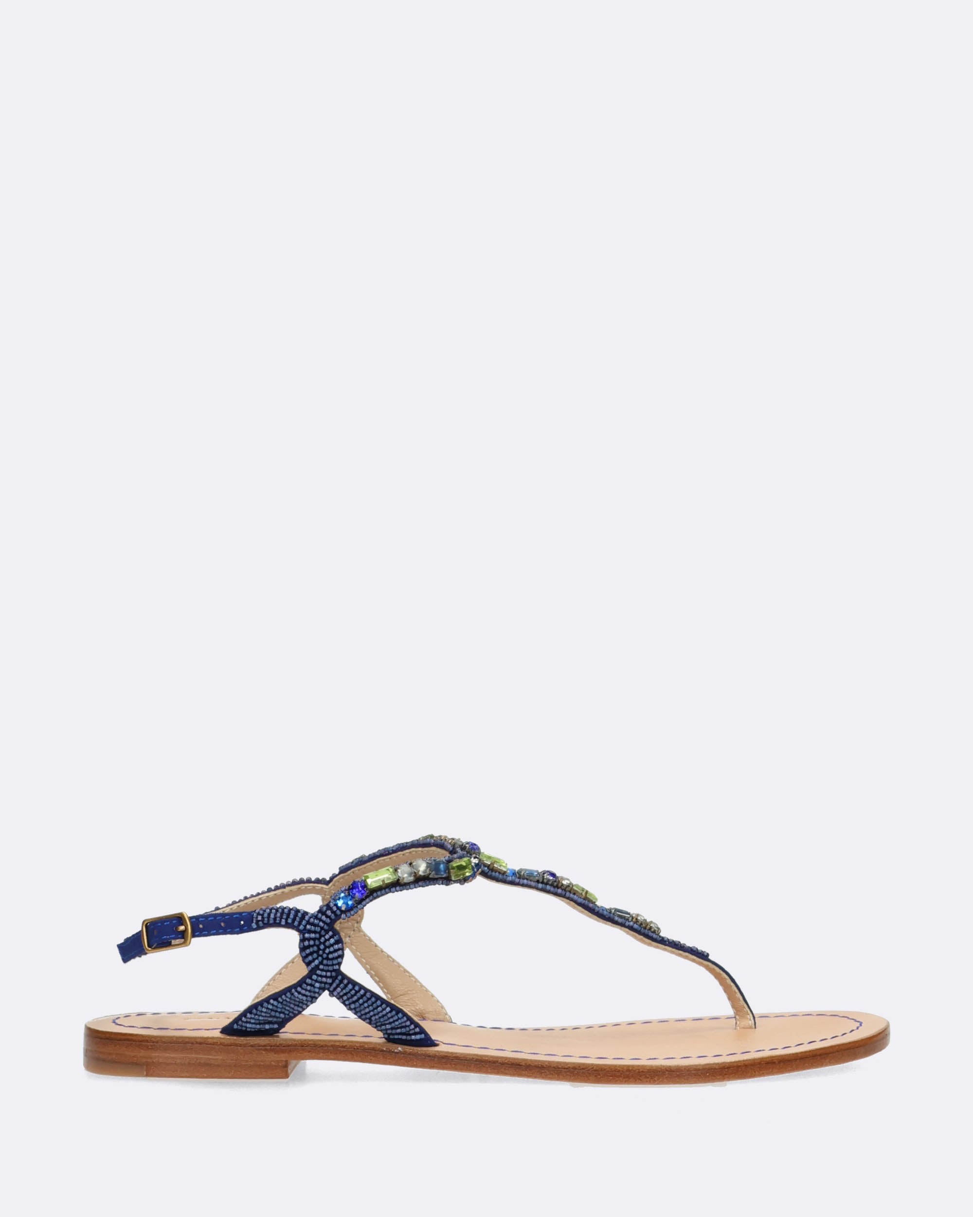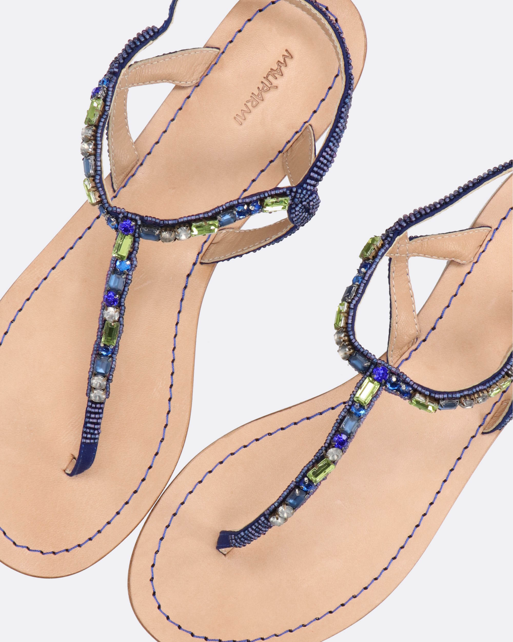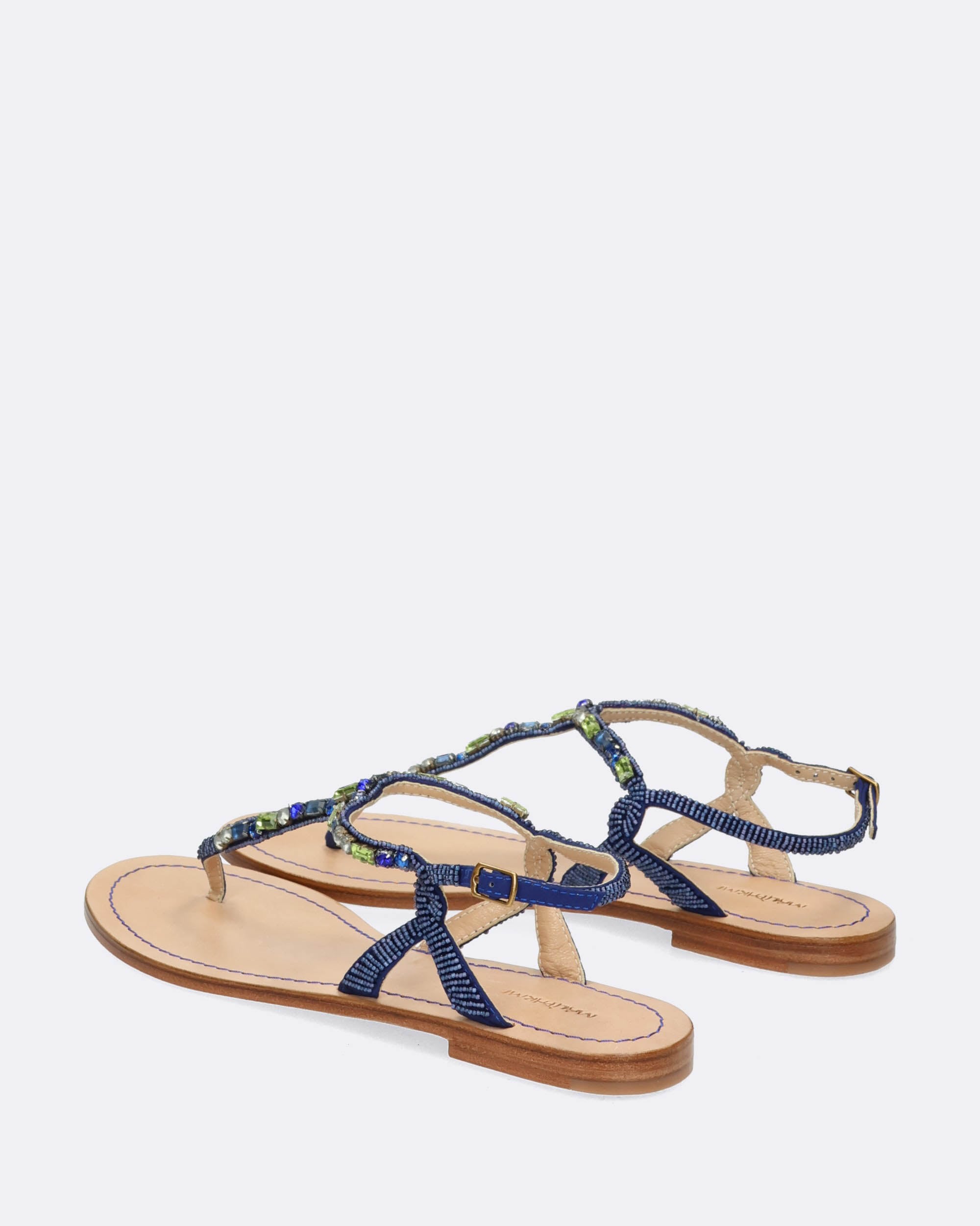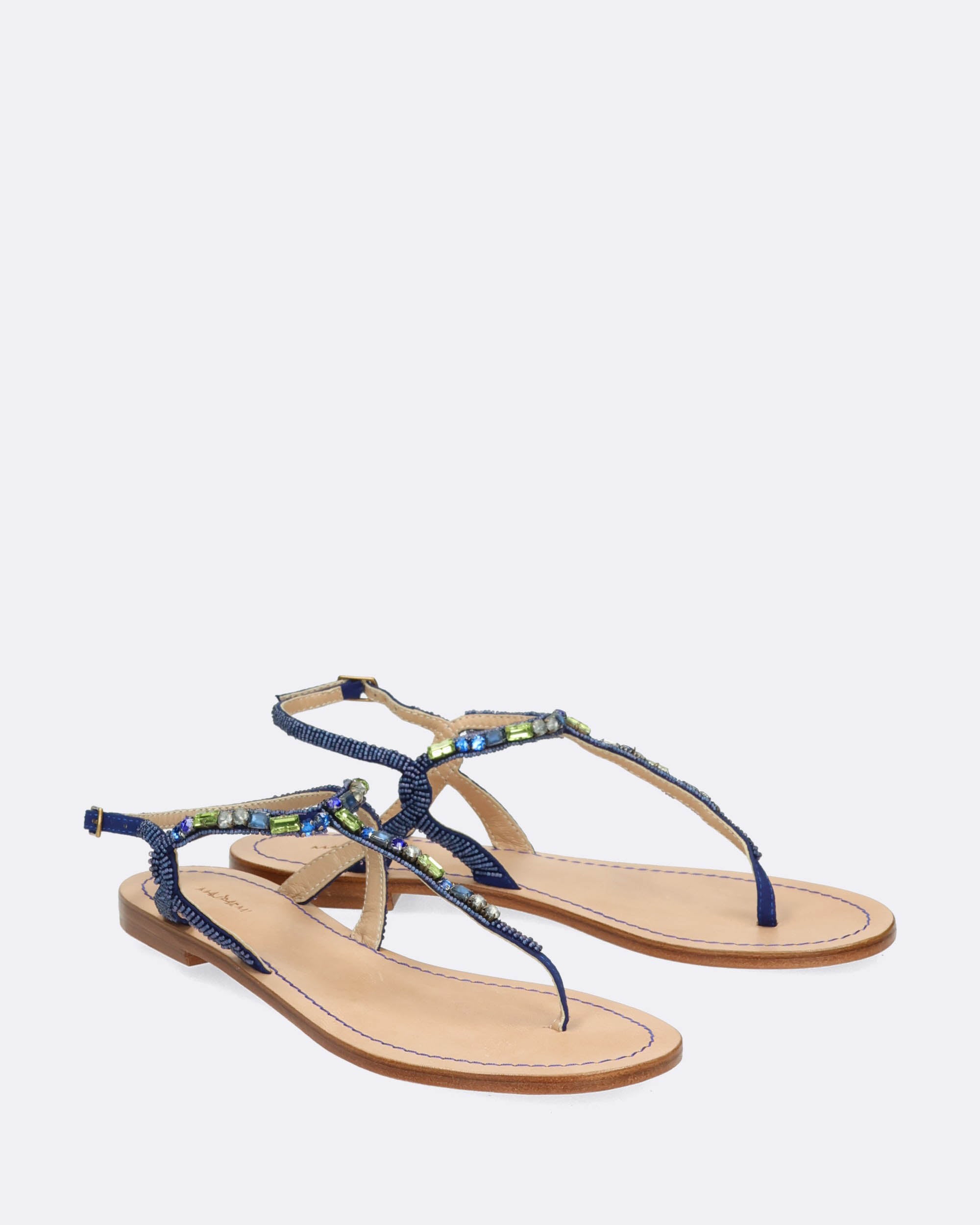 Sandali bassi gioiello infradito argento e blu, ricami fatti a mano con perline, sottopiede in pelle, suola in cuoio con logo Maliparmi, punta tonda, tacco 10mm, cinturino regolabile con fibbia, collezione donna Maliparmi Primavera Estate 2025
