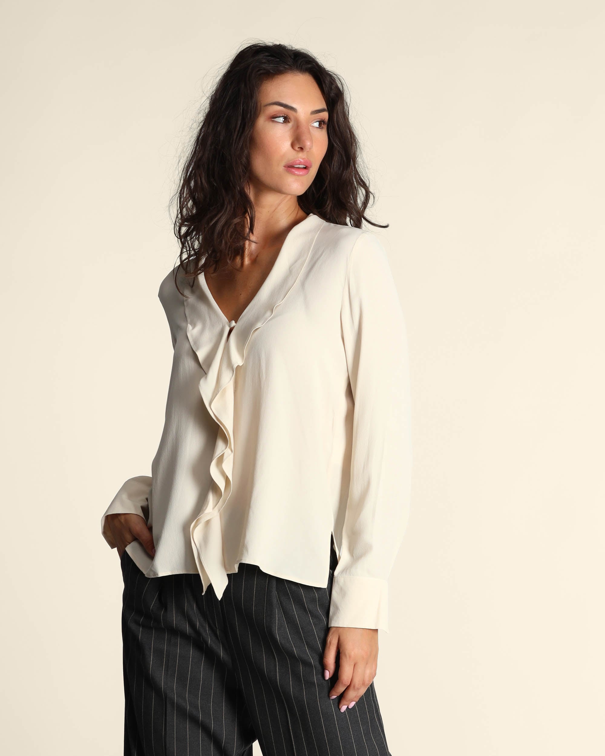 Blusa color burro in crepe di misto seta, scollo a V con apertura a goccia e bottone ricoperto, maniche lunghe con polsino, dettaglio di ruches, linea dritta, spacchi laterali, la modella indossa una tg.42, la modella ha le seguenti misure: altezza 178, seno 86,vita 65, fianchi 93, collezione donna Emme by Marella Autunno Inverno 2025/26