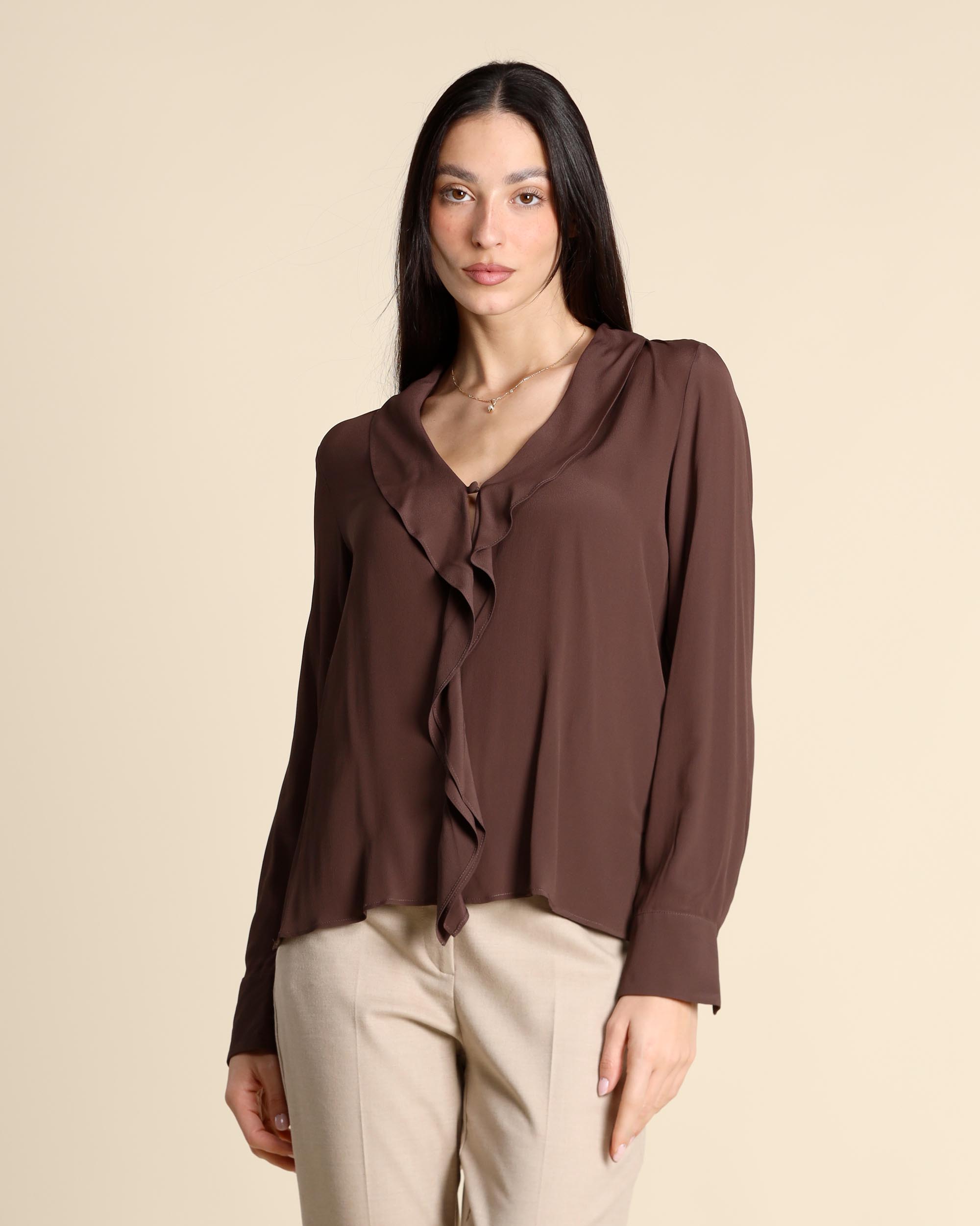 Blusa testa moro in crepe di misto seta, scollo a V con apertura a goccia e bottone ricoperto, maniche lunghe con polsino, dettaglio di ruches, linea dritta, spacchi laterali, la modella indossa una tg.42, la modella ha le seguenti misure: altezza 175, seno 86,vita 65, fianchi 93, collezione donna Emme by Marella Autunno Inverno 2025/26