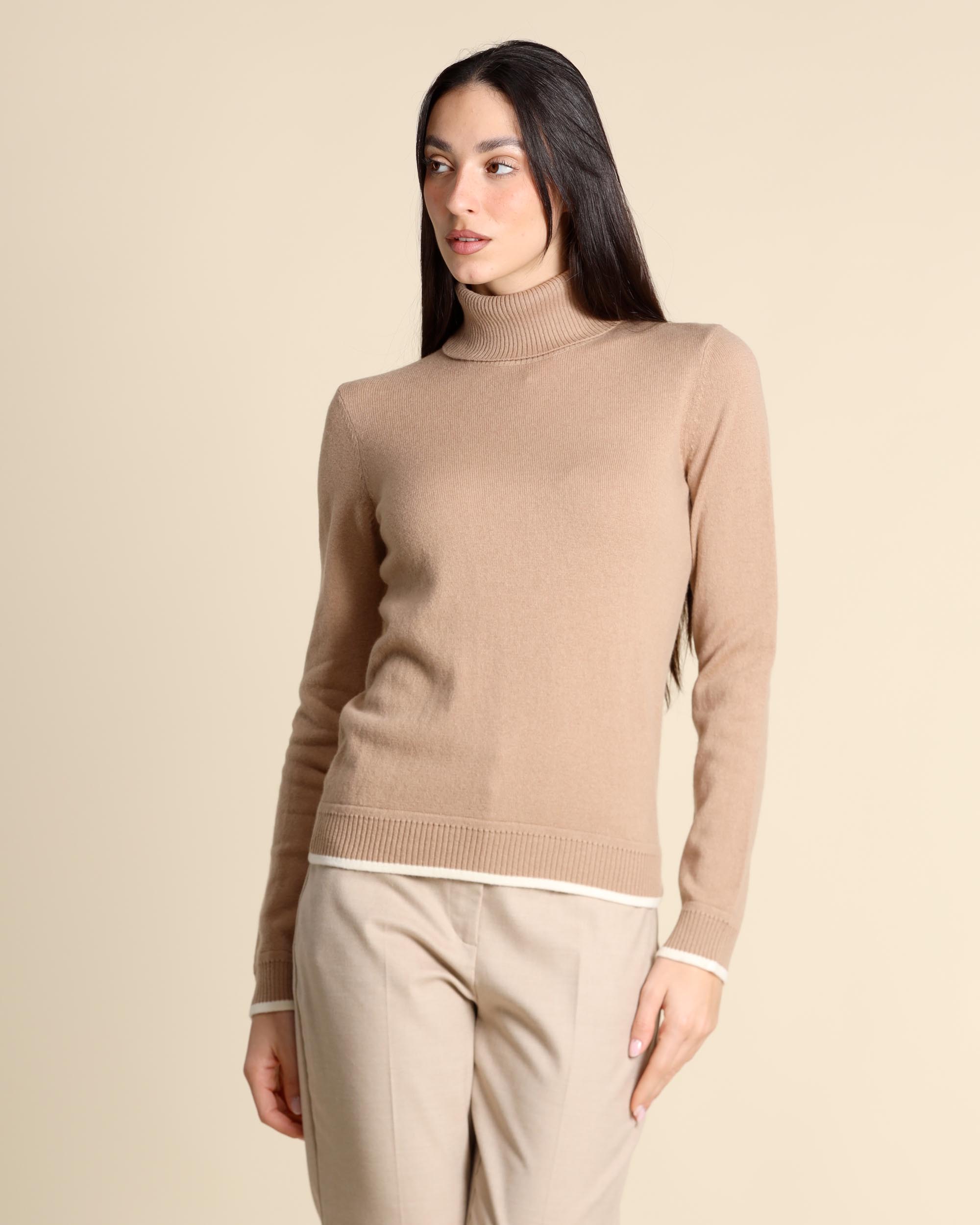 Maglia cammello in lana e cashmere, collo alto, maniche lunghe, linea dritta, dettaglio di profili color panna, la modella indossa una tg.S, la modella ha le seguenti misure: altezza 177, seno 84, vita 63, fianchi 94, collezione donna Pennyblack Autunno Inverno 2025/26