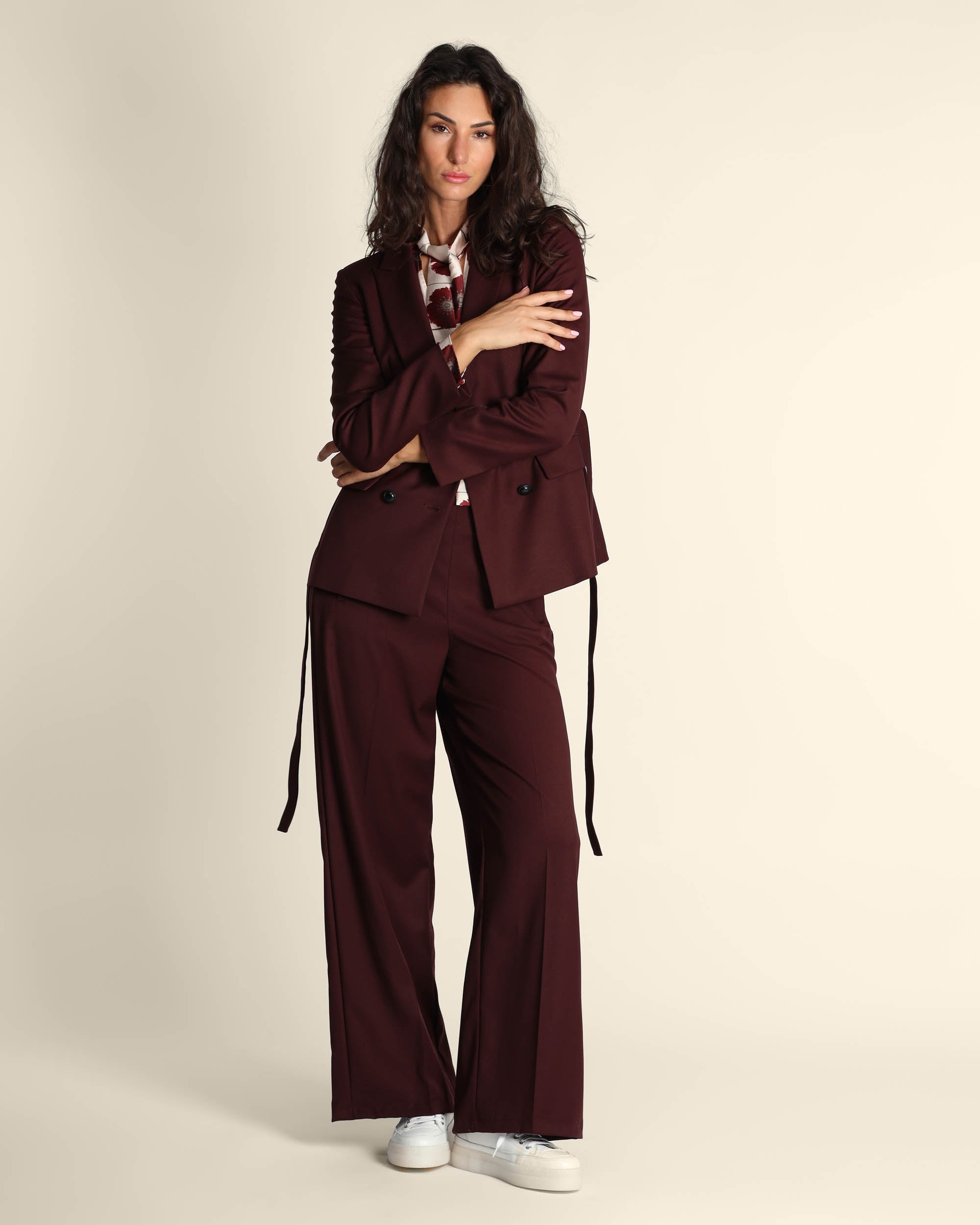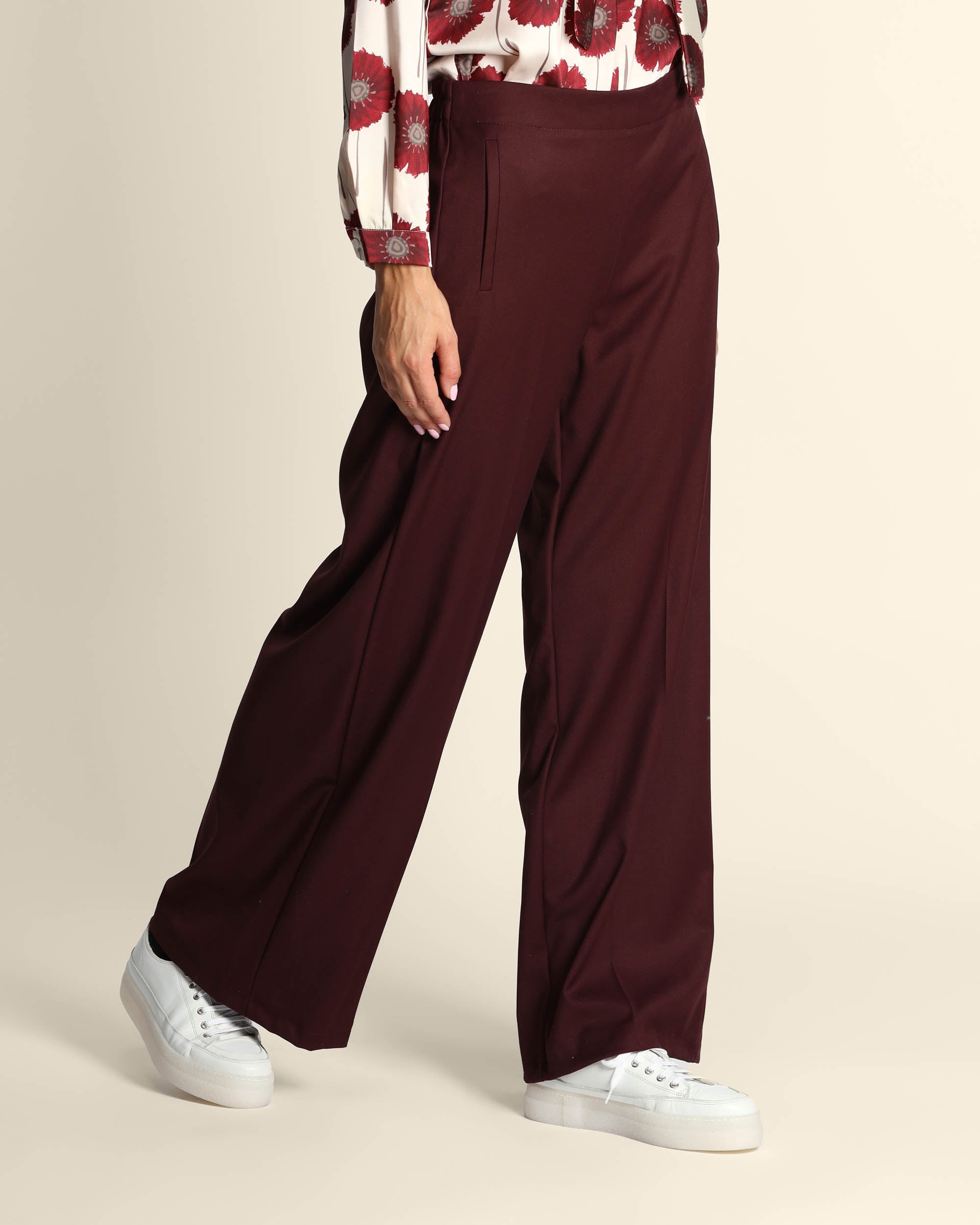 Pantaloni bordeaux in misto viscosa stretch, vita elastica, linea ampia, tasche a filetto, piega stirata danti e dietro, la modella indossa una tg.42, la modella ha le seguenti misure: altezza 178, seno 86,vita 65, fianchi 93, collezione donna Emme by Marella Autunno Inverno 2025/26