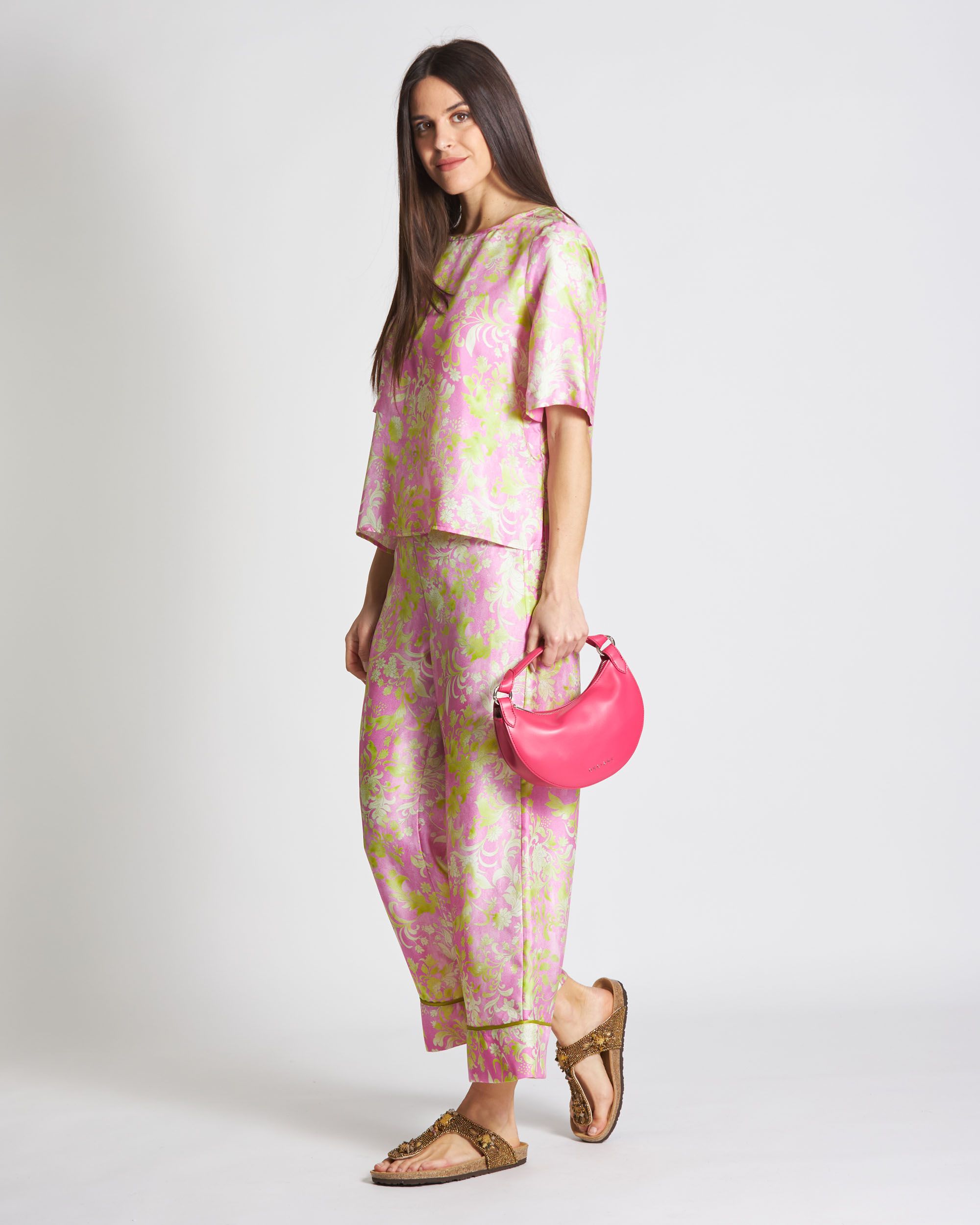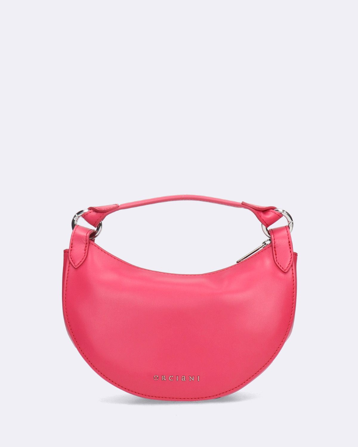 Mini bag Dumpling a mezzaluna in pelle color lampone, manico a mano, tracolla removibile a catena, chiusura con zip, portacarte interno, finiture palladio, larghezza 24cm, altezza 16cm, profondità 10cm, made in Italy, collezione donna Orciani