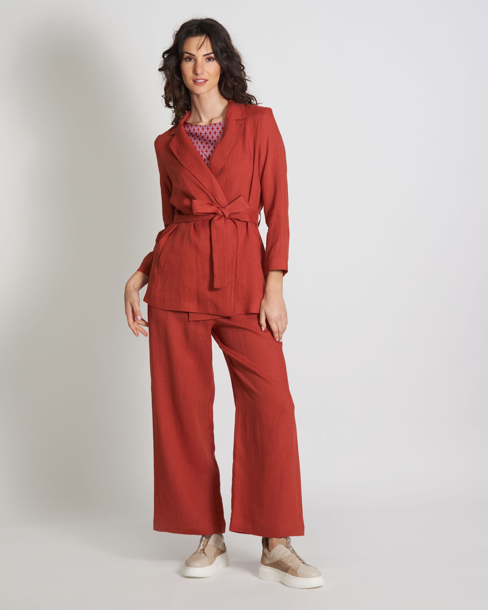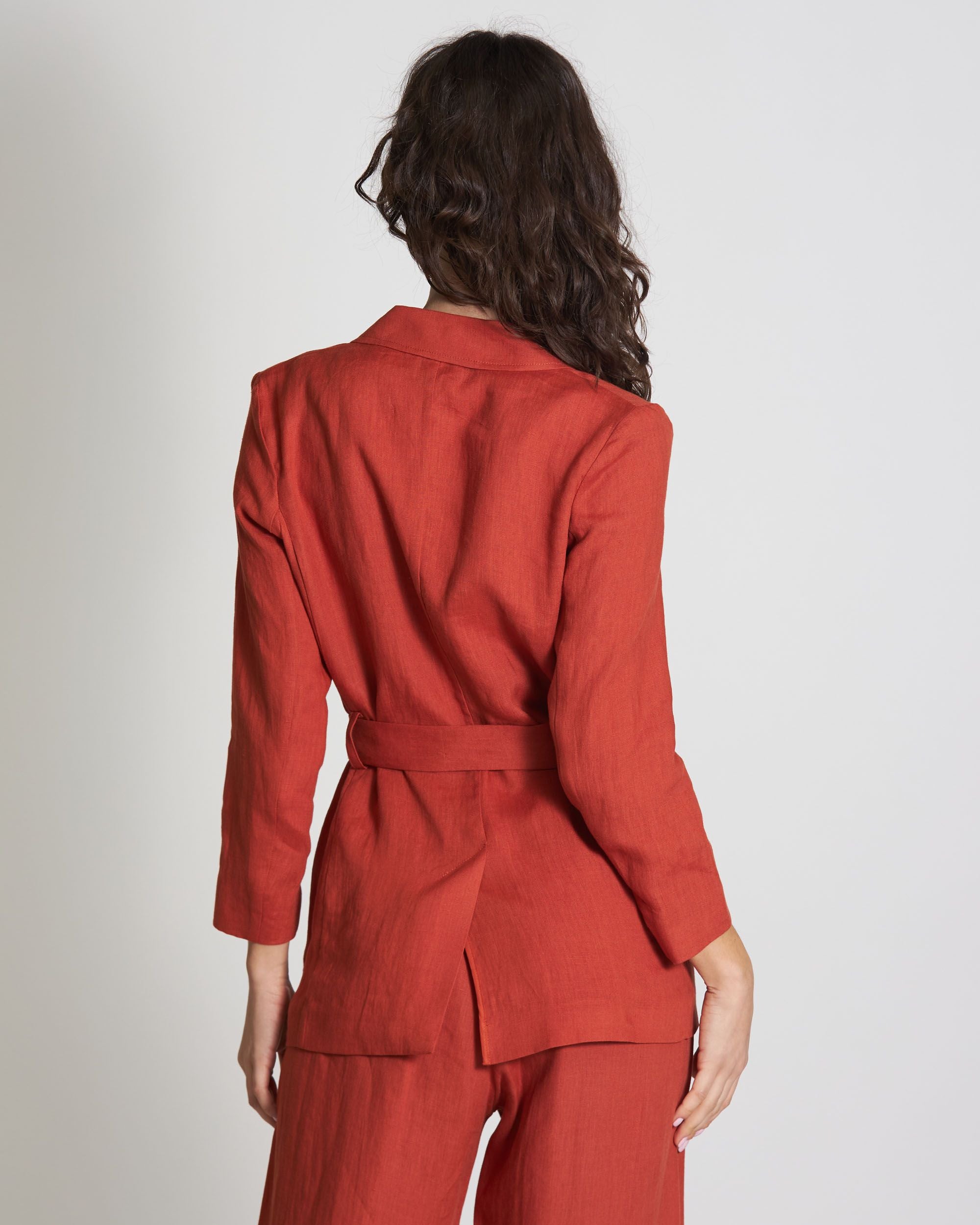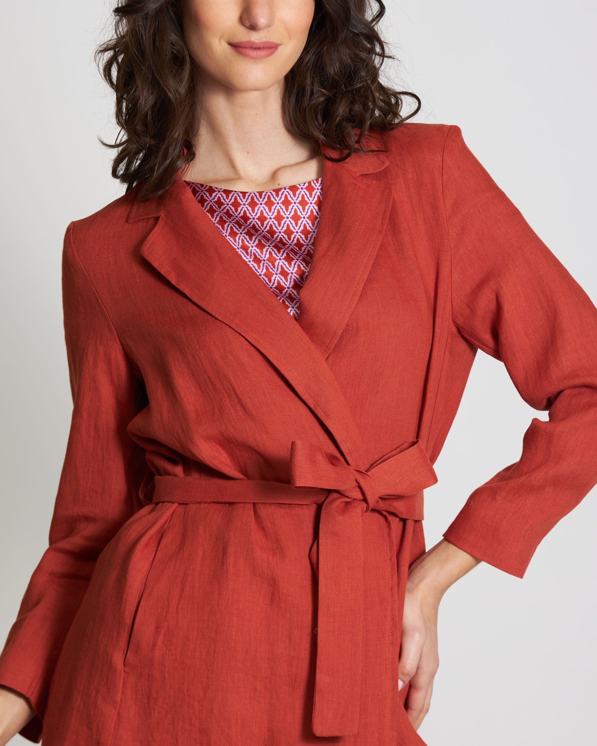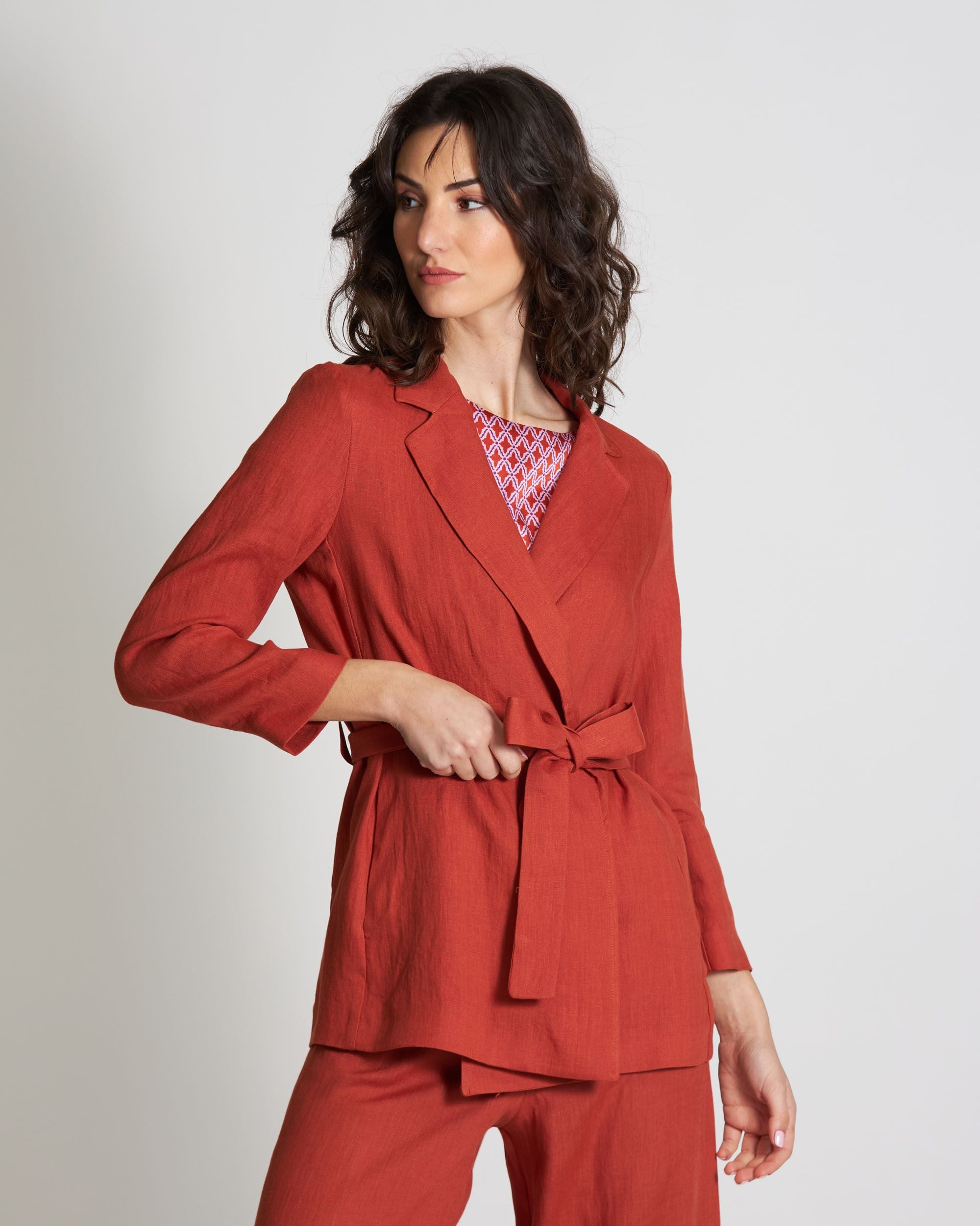 Giacca color zafferano in lino, collo a rever, maniche lunghe, chiusura con cintura, tasche inserite sul fianco, spacco sul dietro, linea morbida, sfoderata, Elisa indossa una tg.S, Elisa ha le seguenti misure: altezza 179, seno 84, vita 63, fianchi 94, collezione donna Niù Primavera Estate 2024