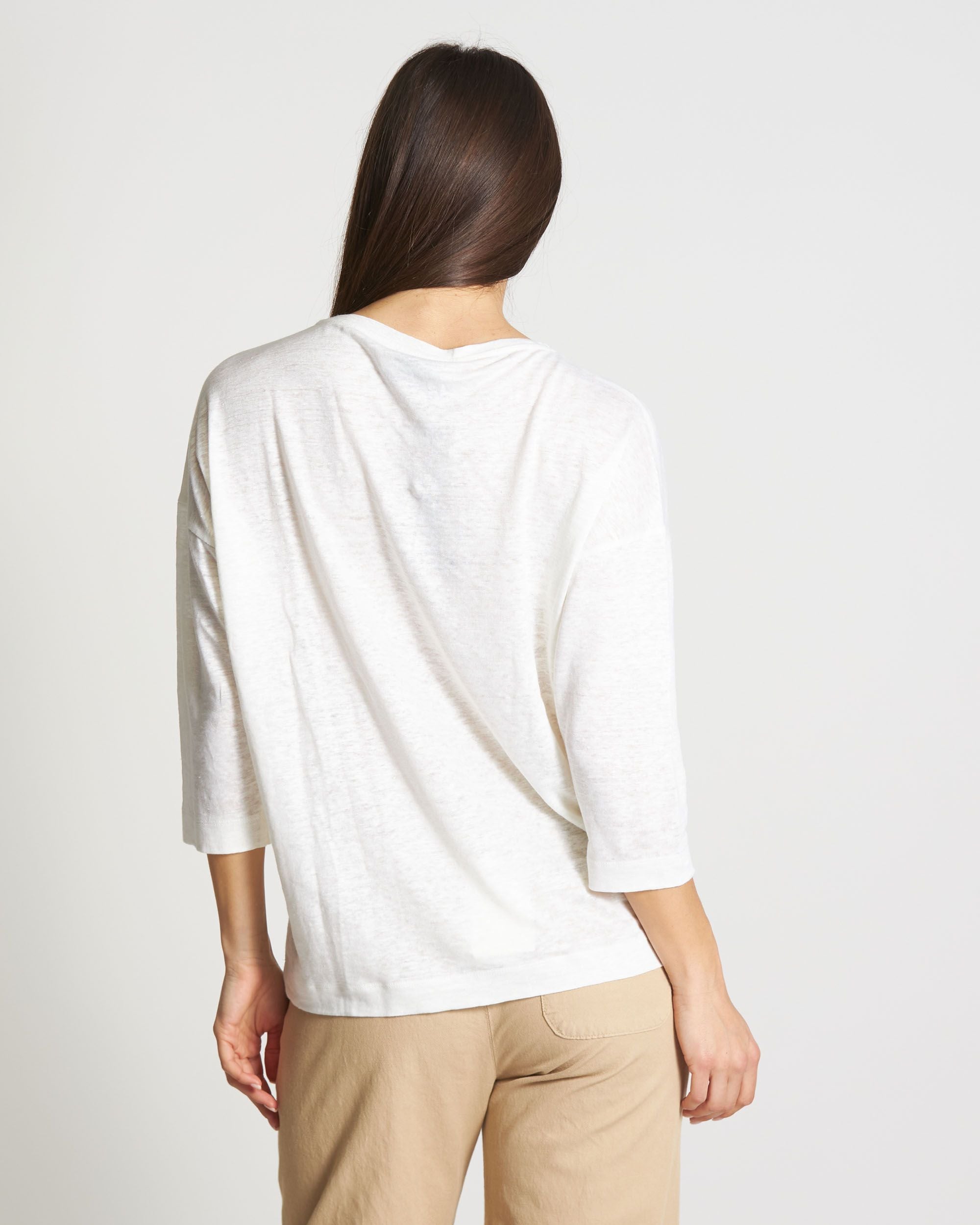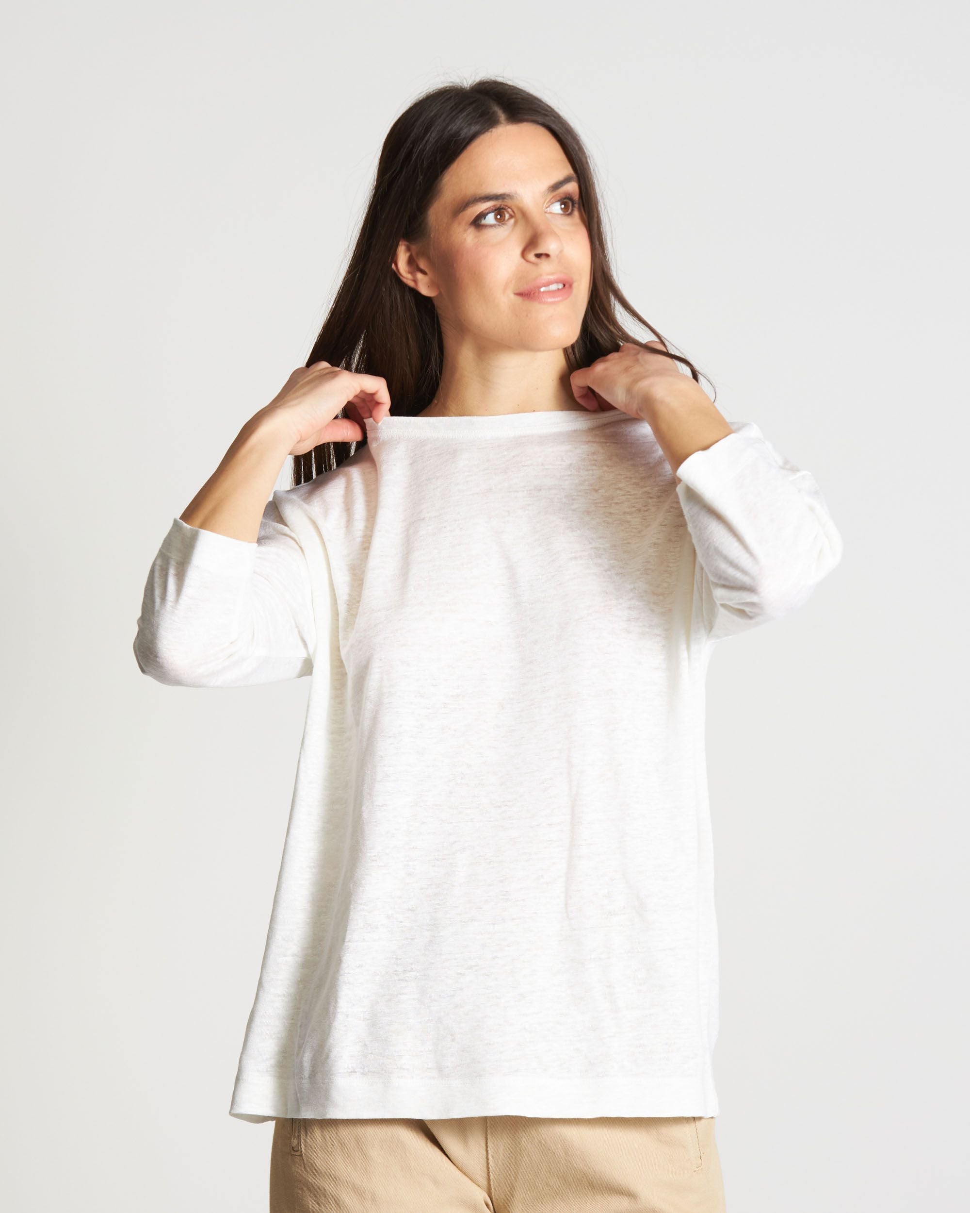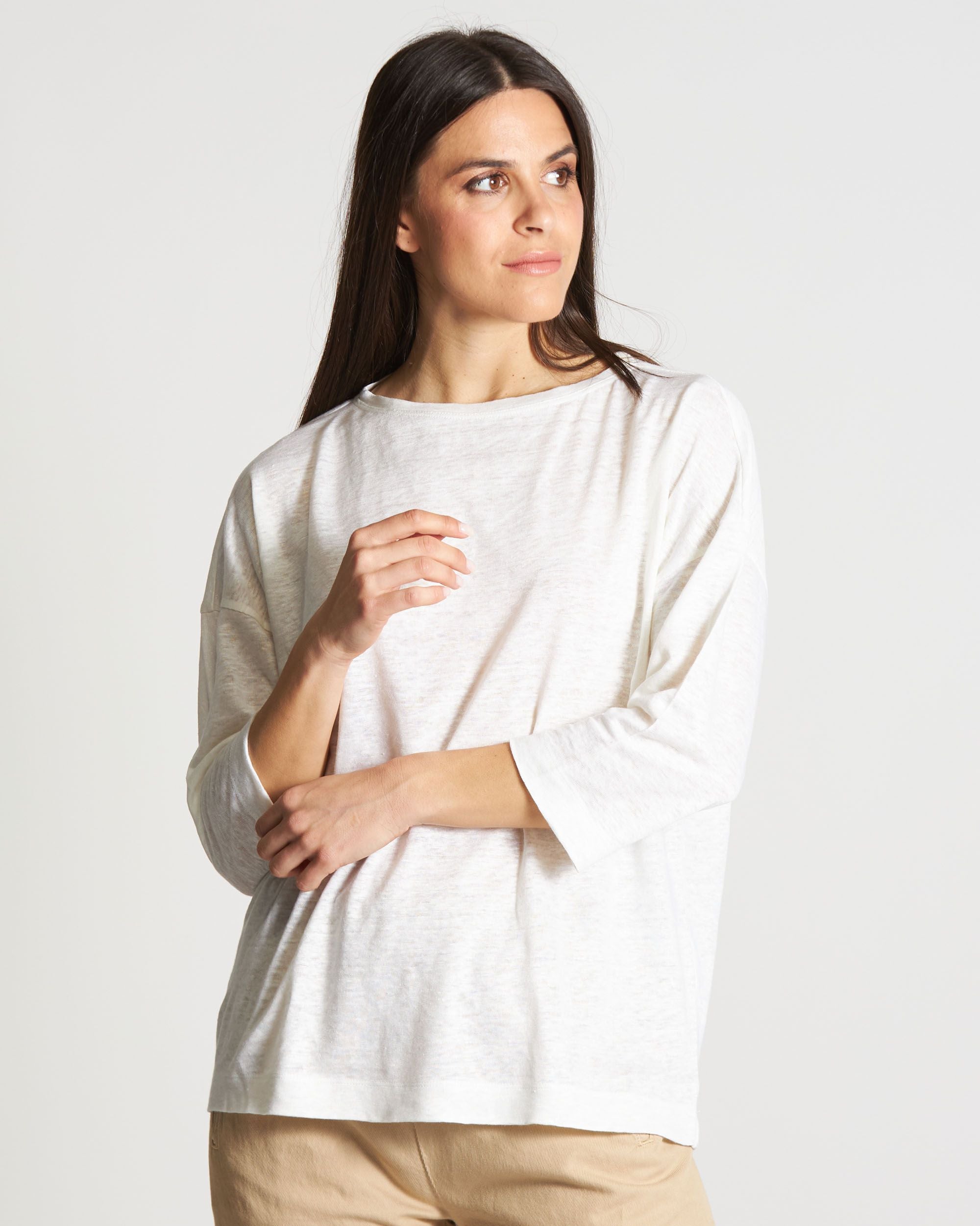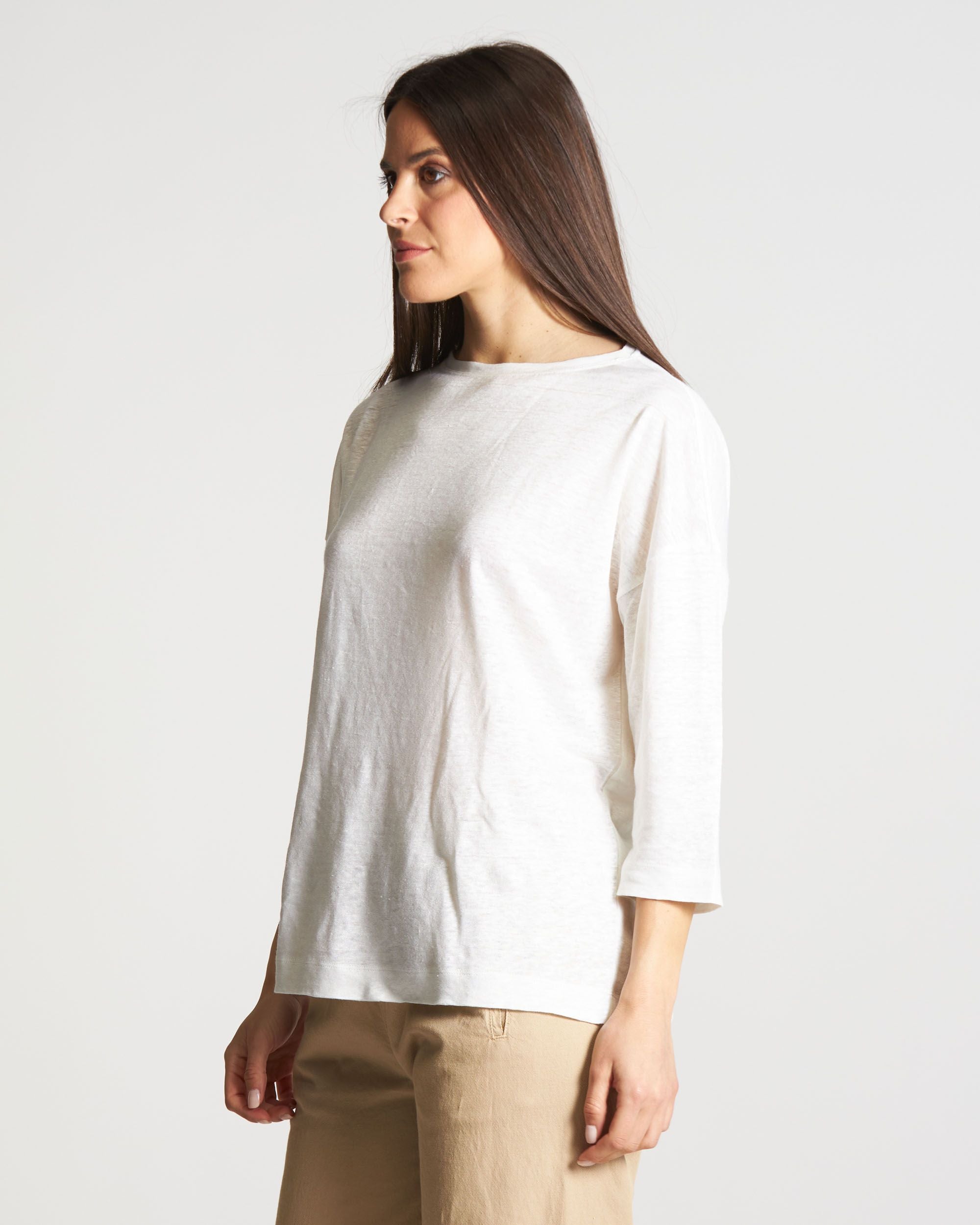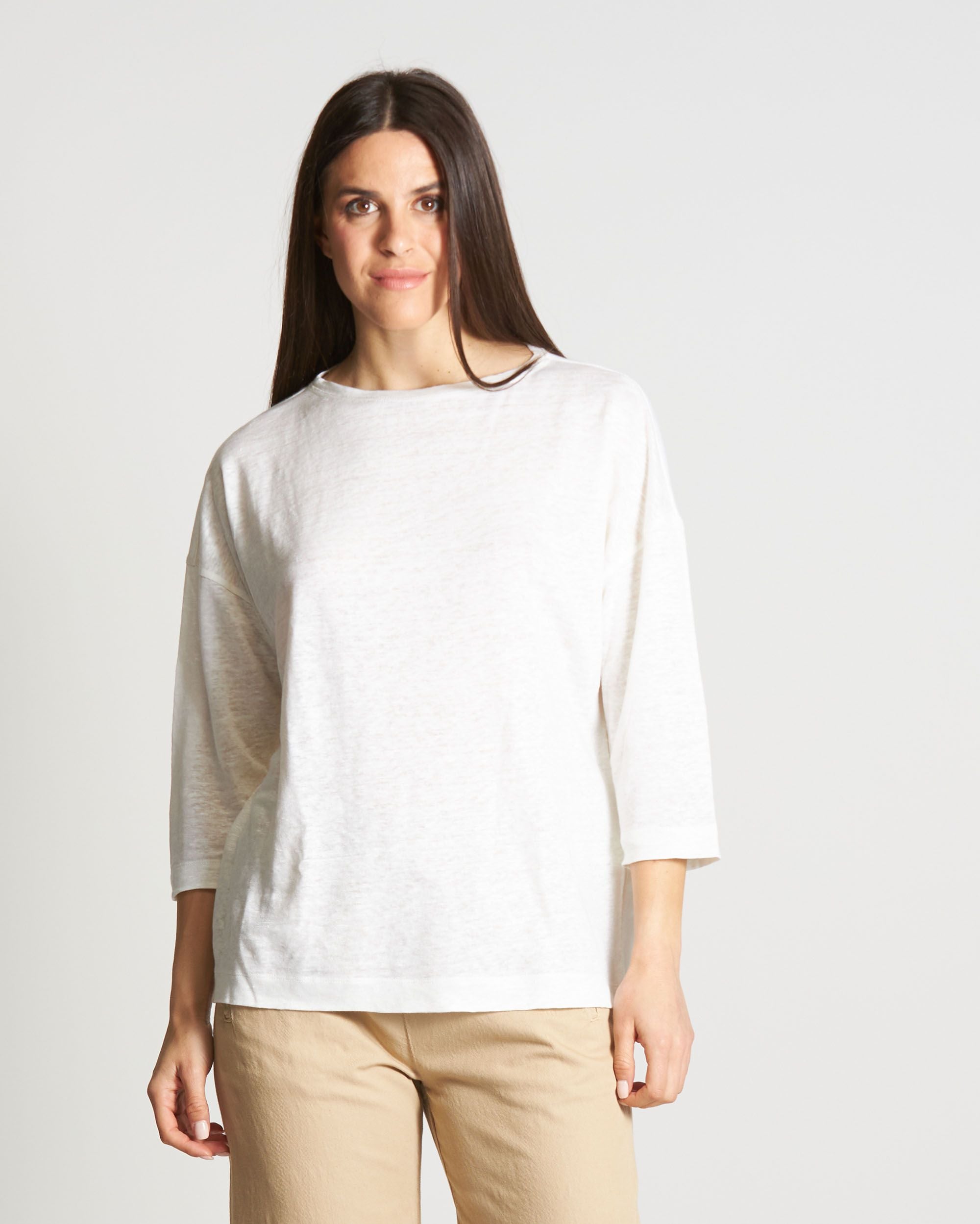 Maglia bianca in jersey di lino, scollo tondo, maniche tre quarti, giro sceso, linea ampia, Veronica indossa una tg.S, Veronica ha le seguenti misure: altezza 177, seno 87,vita 65, fianchi 93, collezione donna Niù Primavera Estate 2024