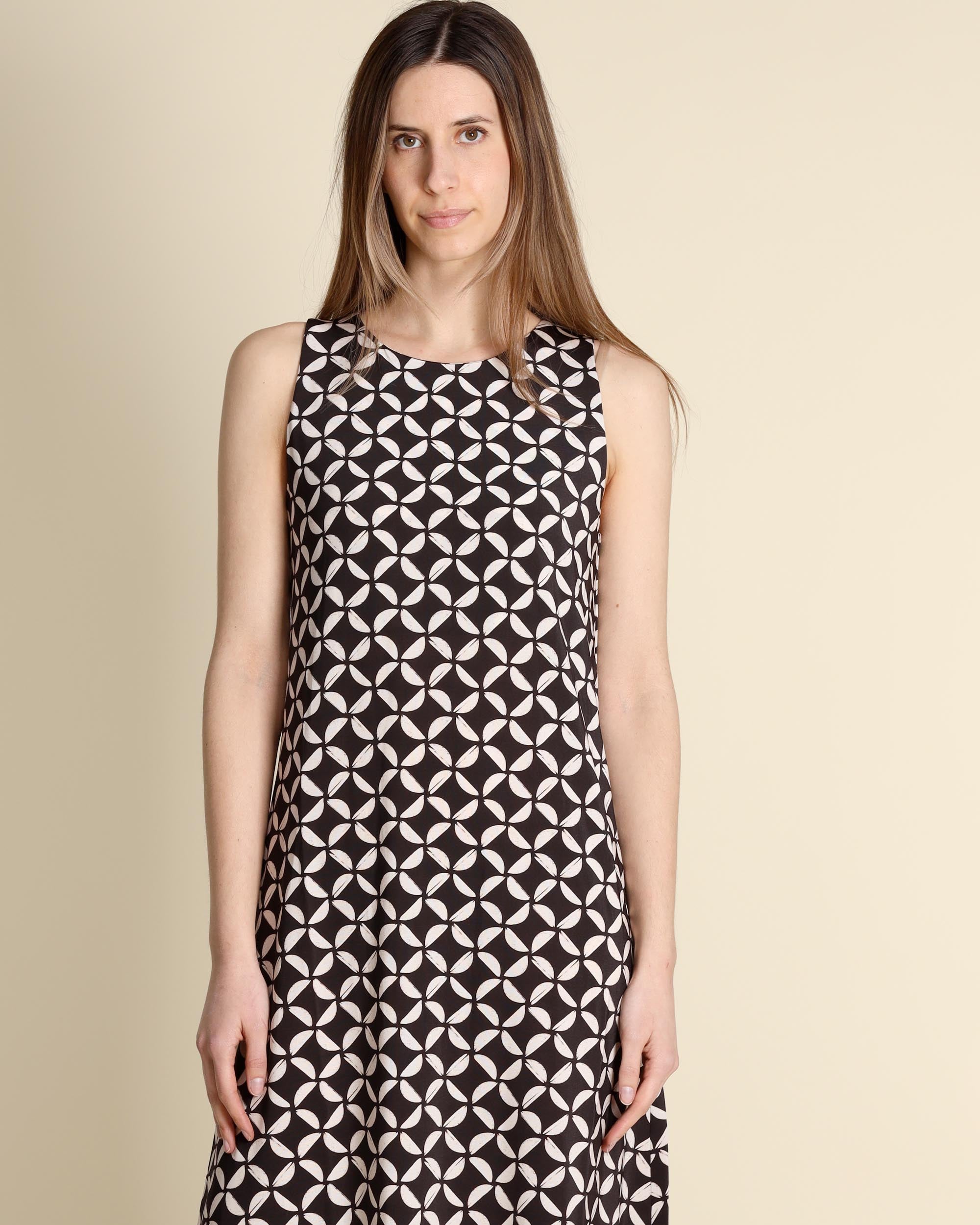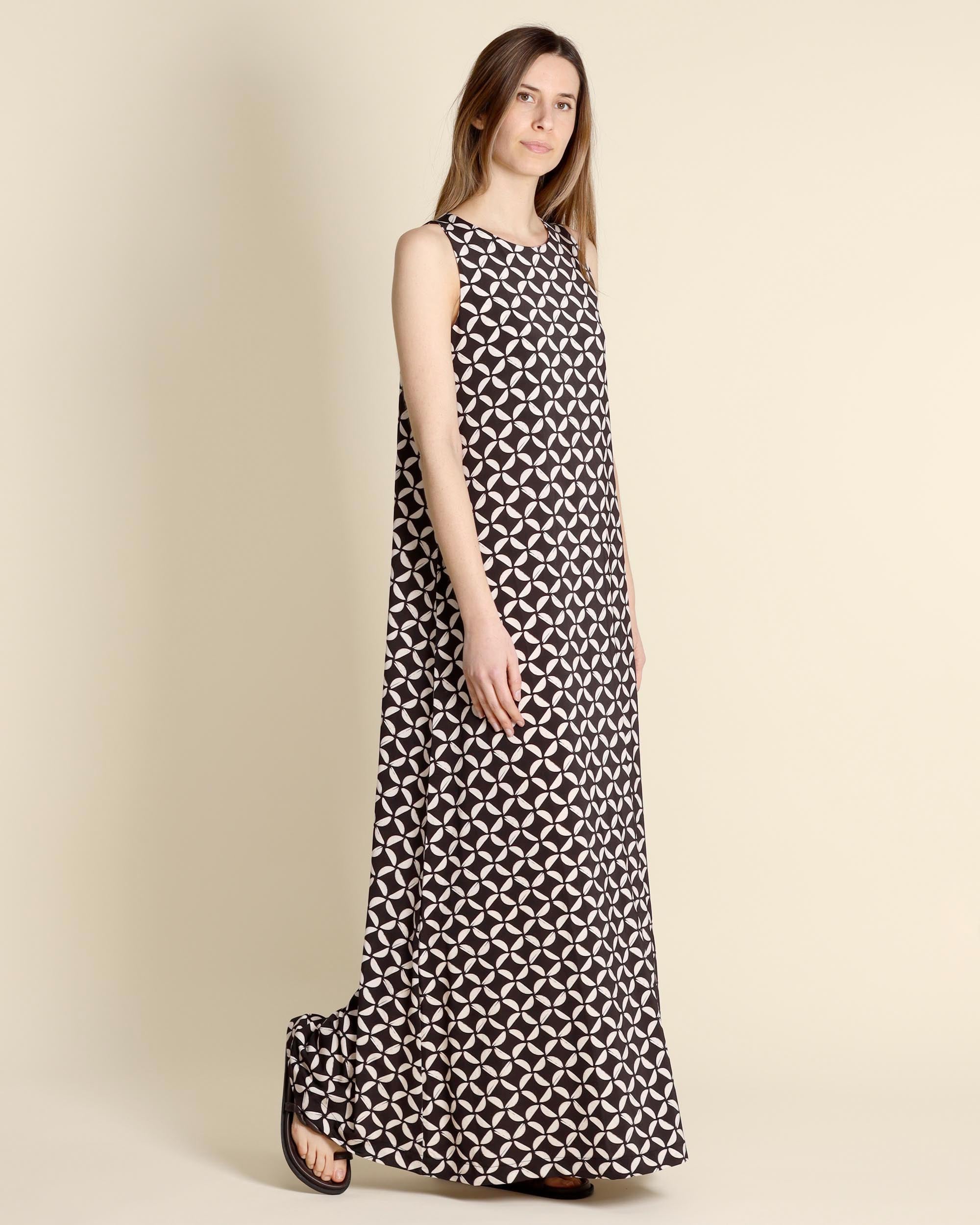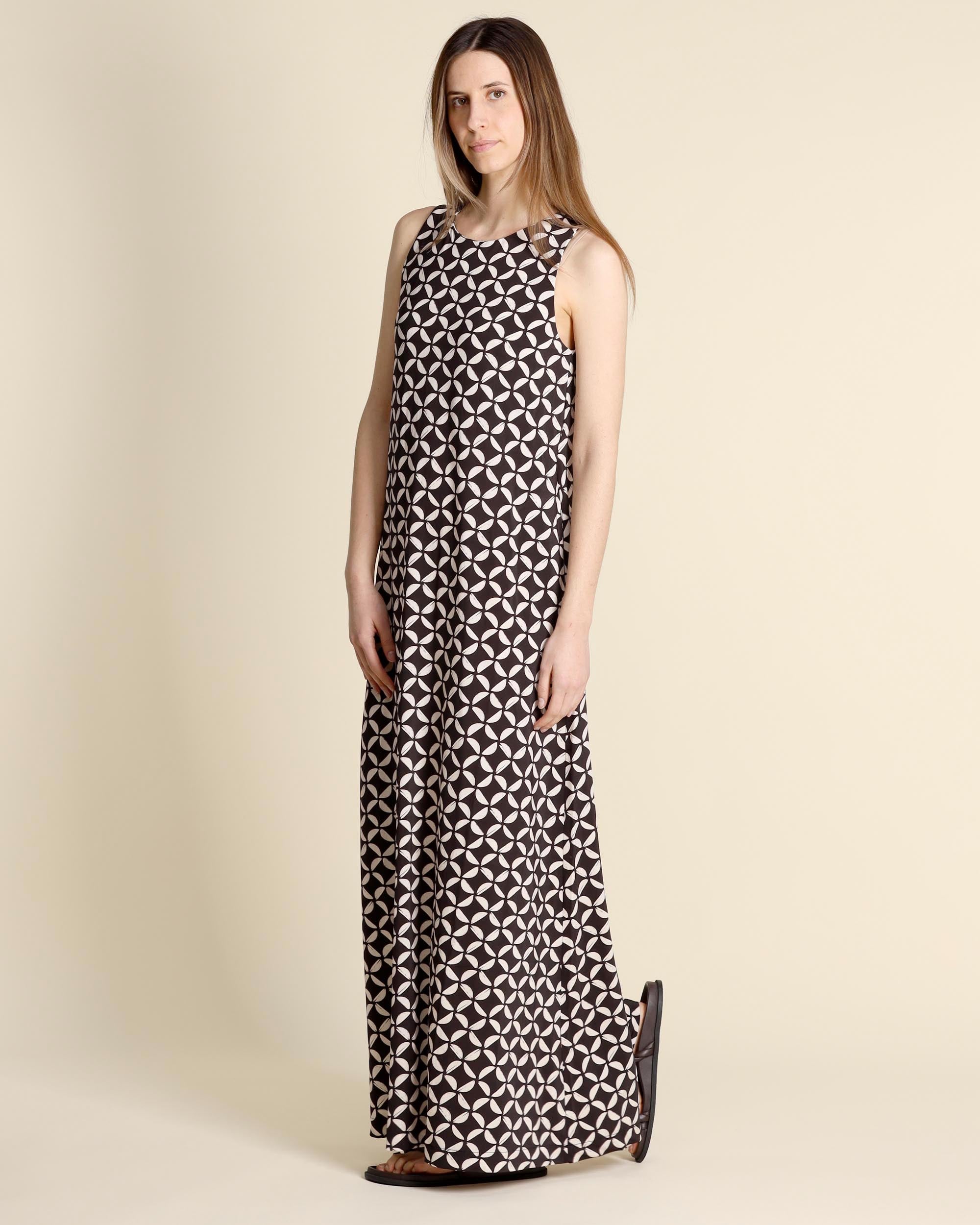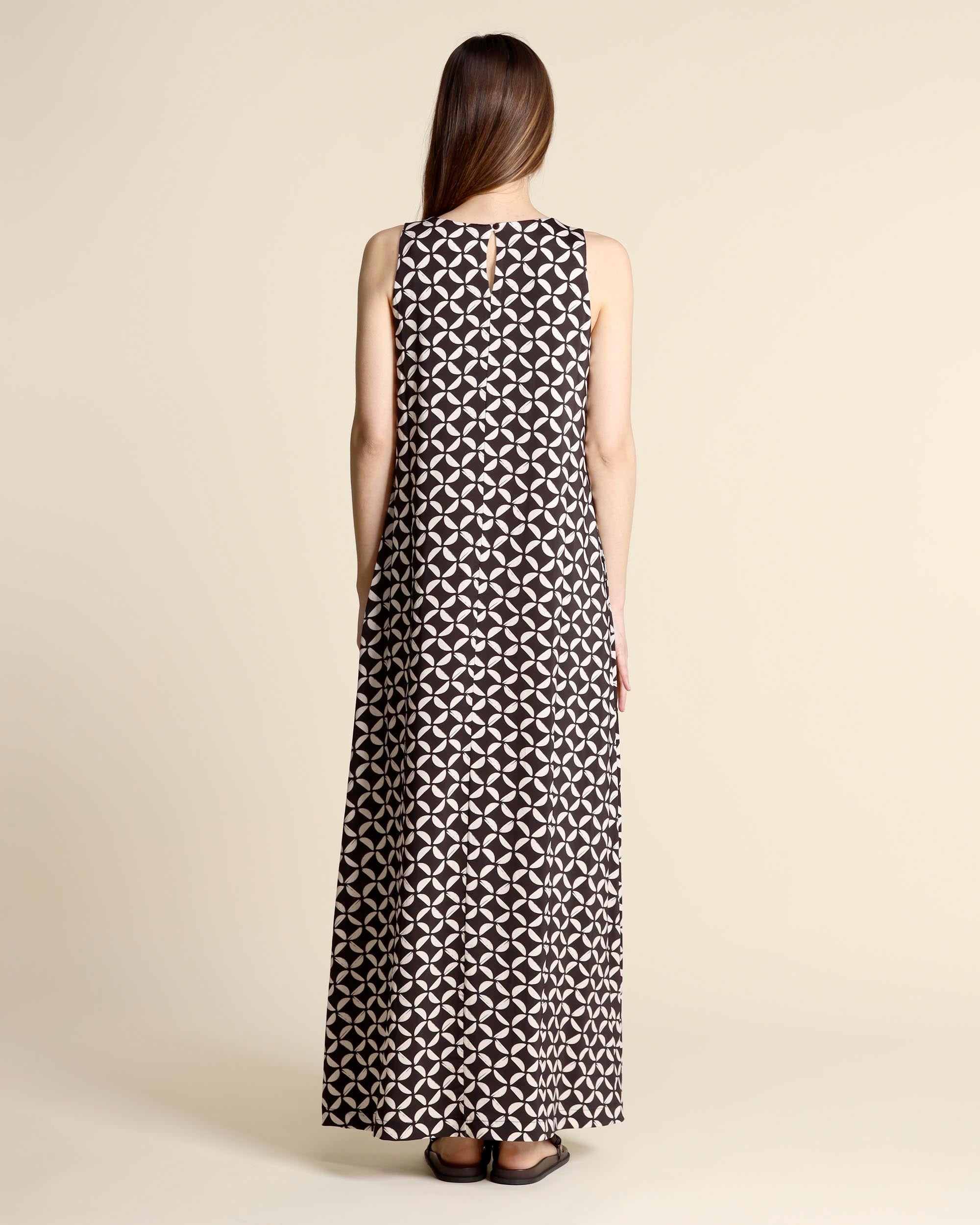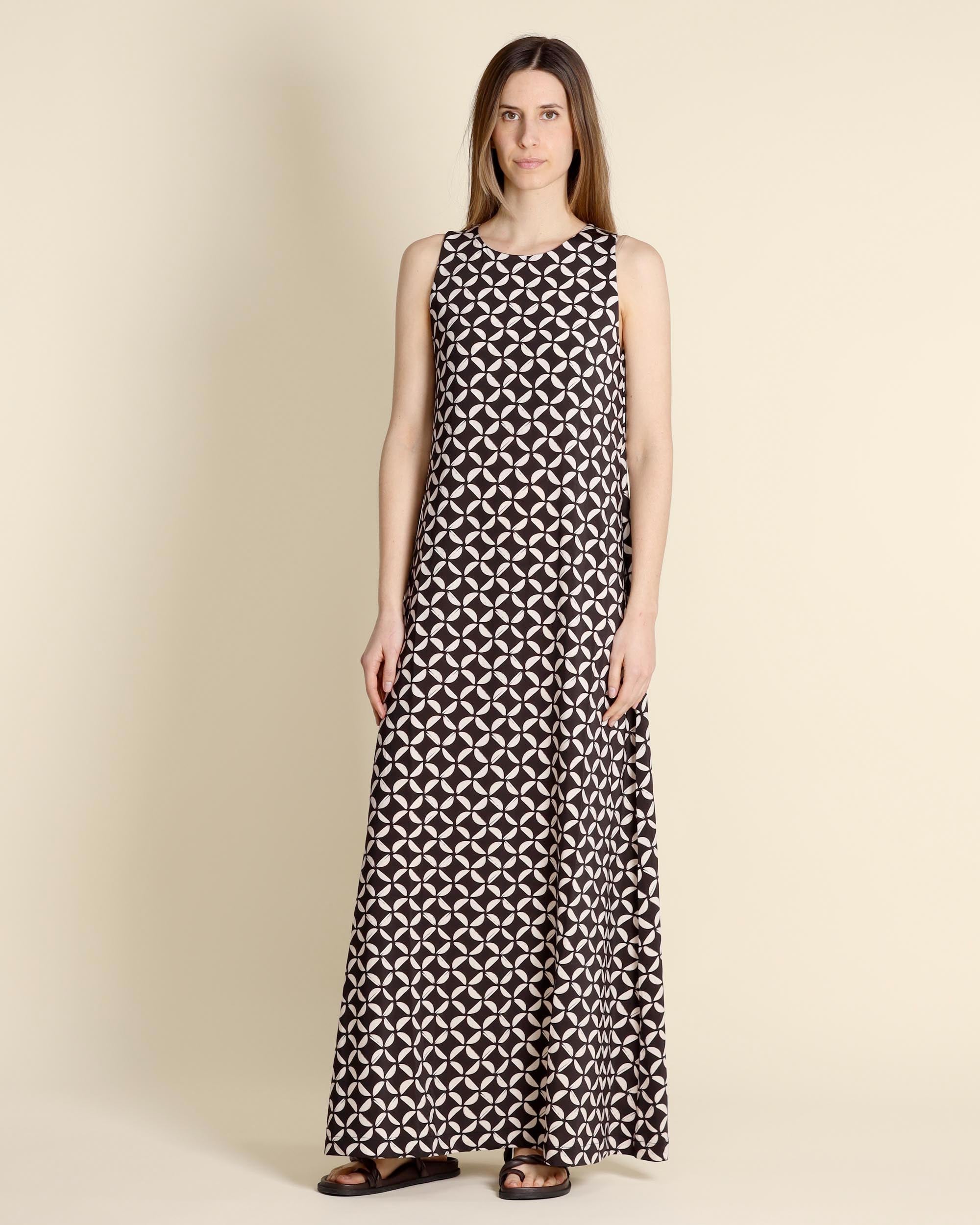 Abito lungo marrone scuro a fantasia in jersey di viscosa stretch, scollo tondo, linea svasata, senza maniche, tasche inserite sul fianco, sfoderato, la modella indossa una tg.S, la modella ha le seguenti misure: altezza 177, seno 86,vita 65, fianchi 93, collezione donna Niù Primavera Estate 2026