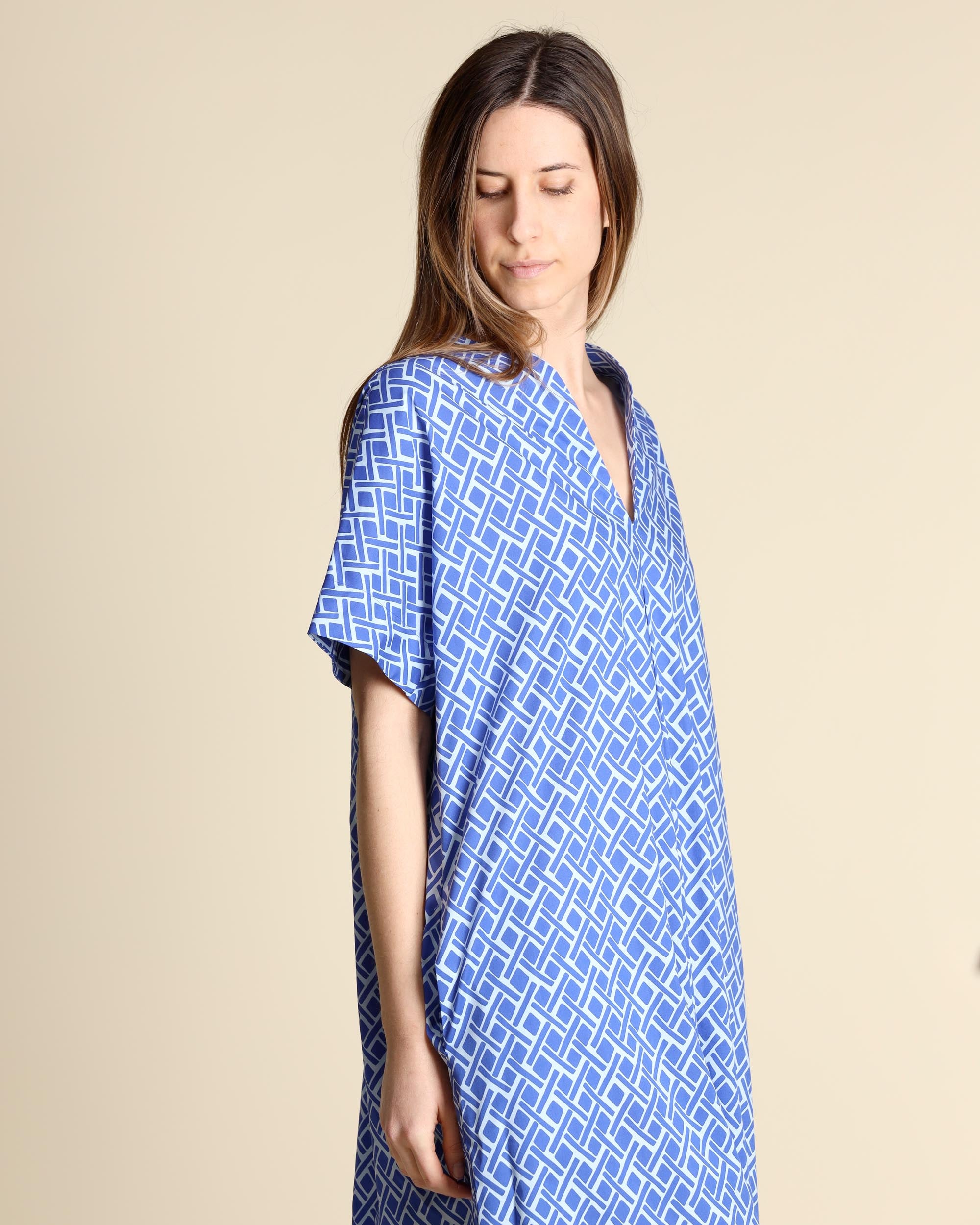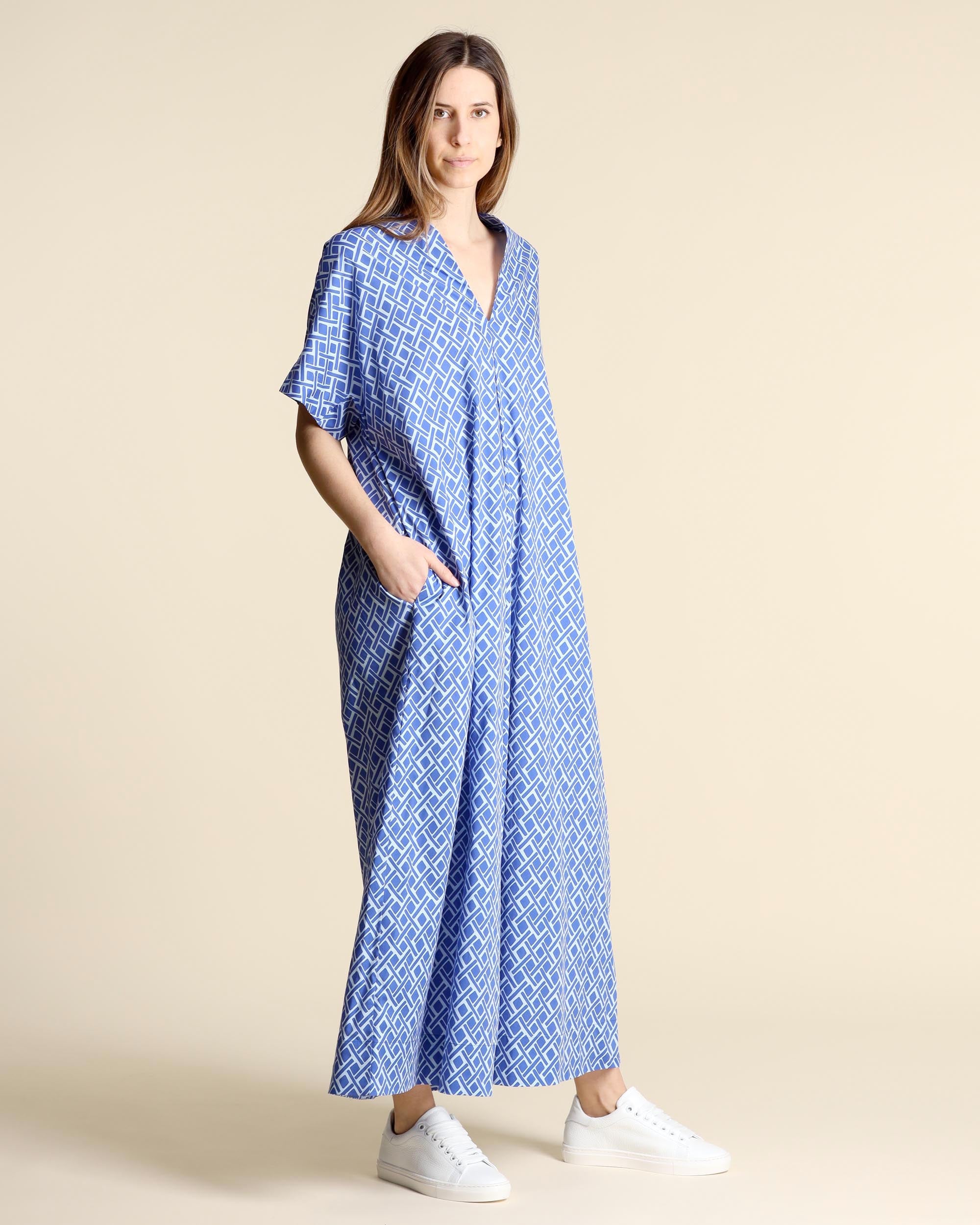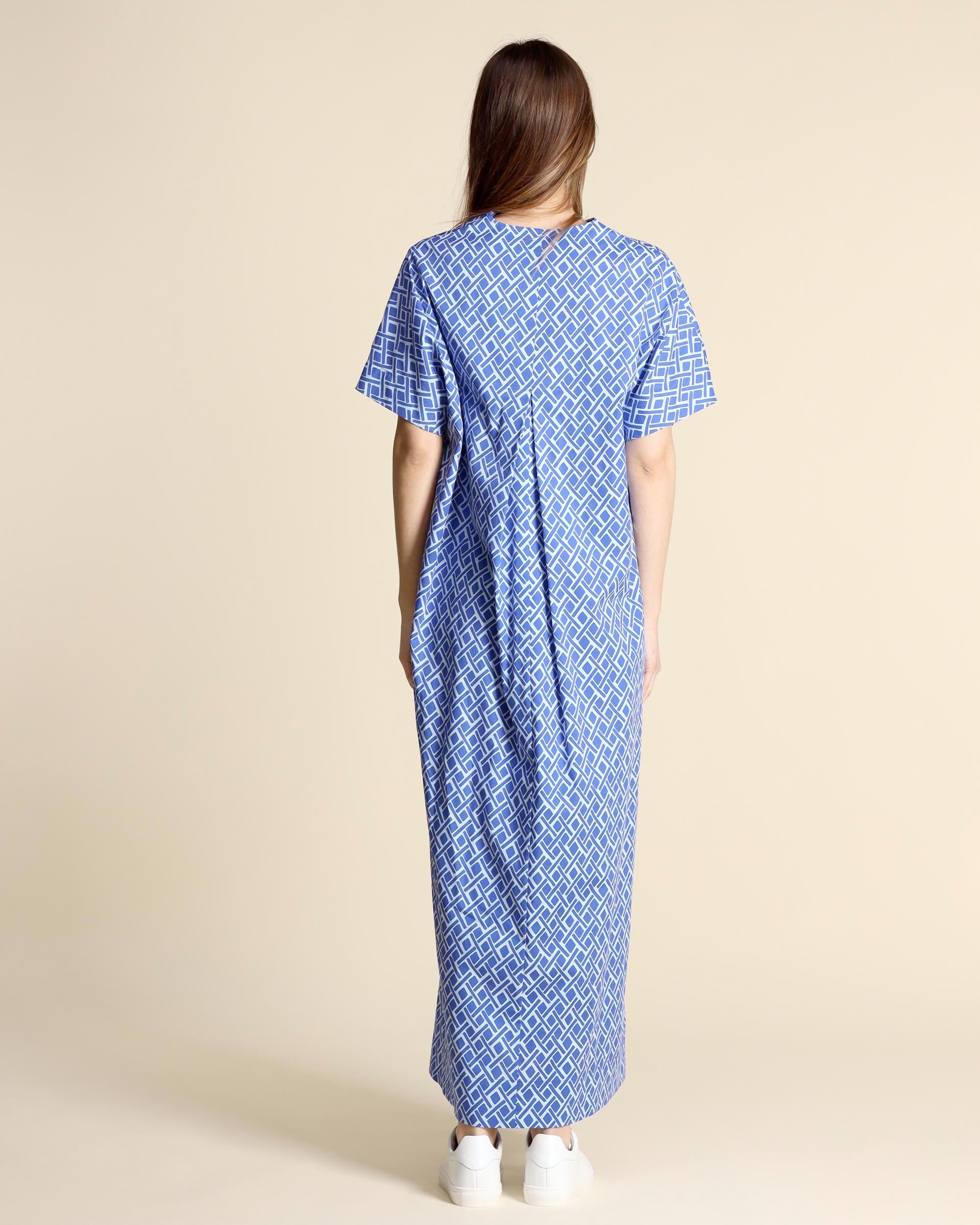 Abito lungo azzurro e bluette in popeline di cotone stretch, maniche corte, scollo a V, tasche inserite sul fianco, linea svasata, sfoderato, la modella indossa una tg.S, la modella ha le seguenti misure: altezza 177, seno 86,vita 65, fianchi 93, collezione donna Niù Primavera Estate 2026