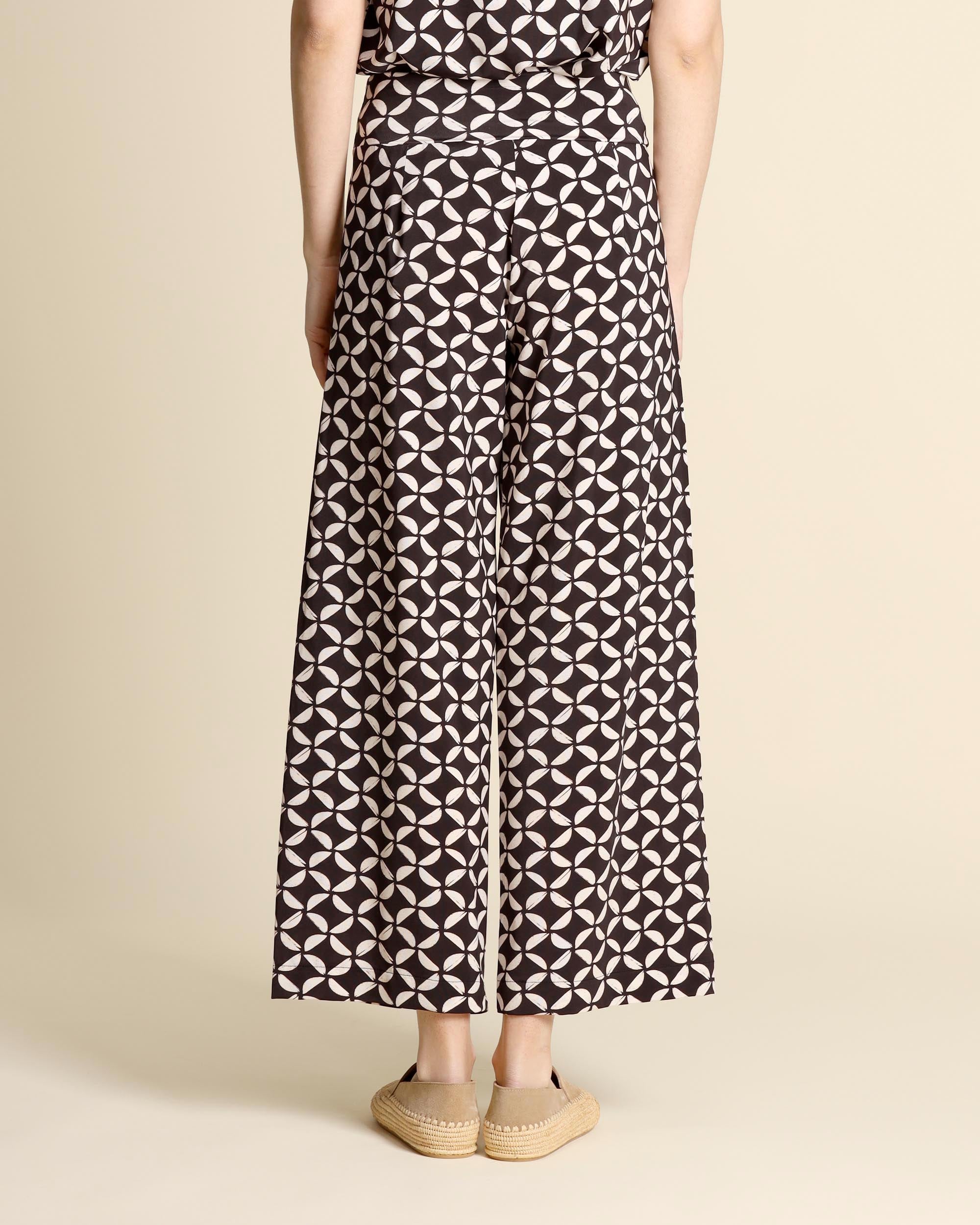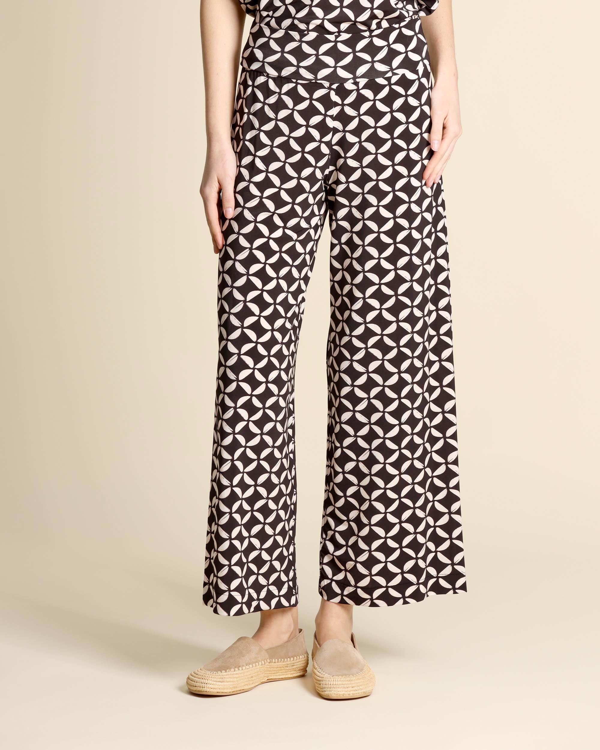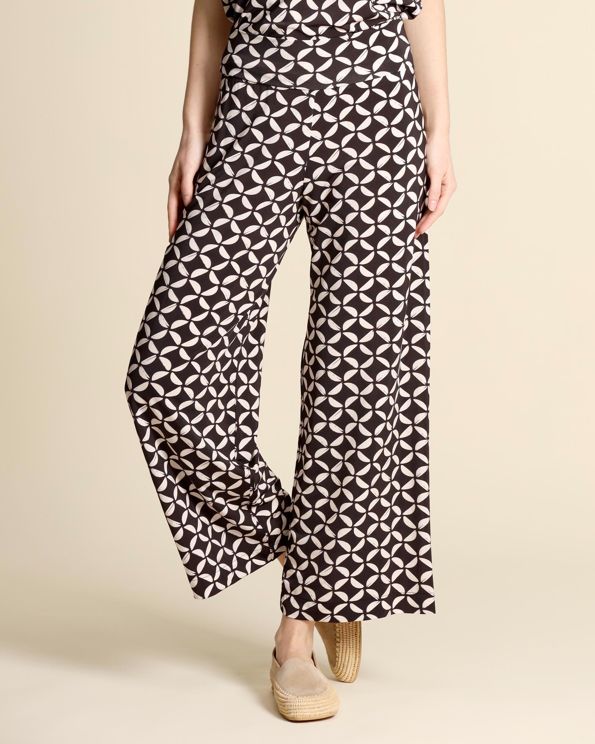 Pantaloni in jersey marrone scuro a fantasia, vita con fascione elastico, linea ampia, la modella indossa una tg.S, la modella ha le seguenti misure: altezza 177, seno 86,vita 65, fianchi 93, collezione donna Niù Primavera Estate 2026