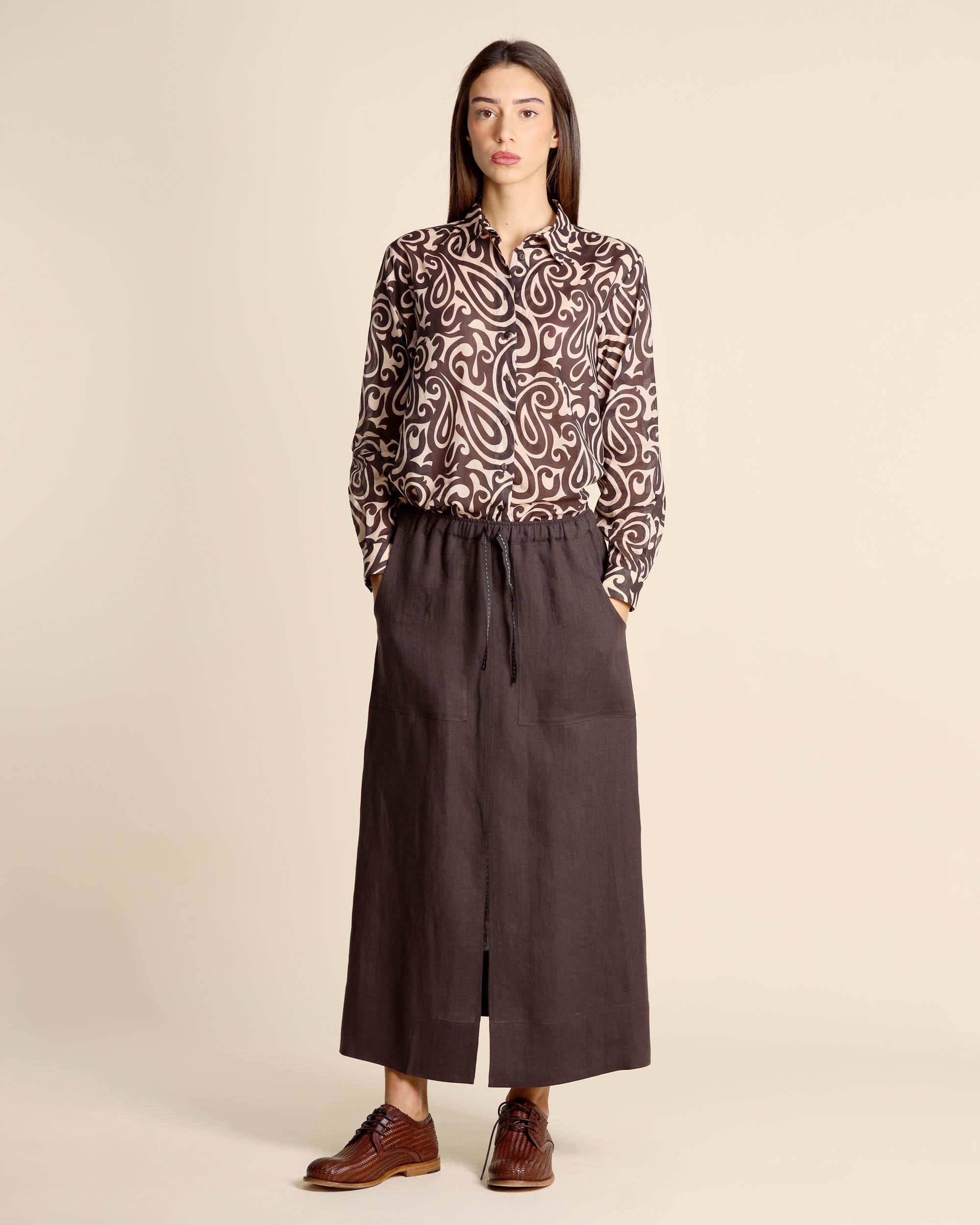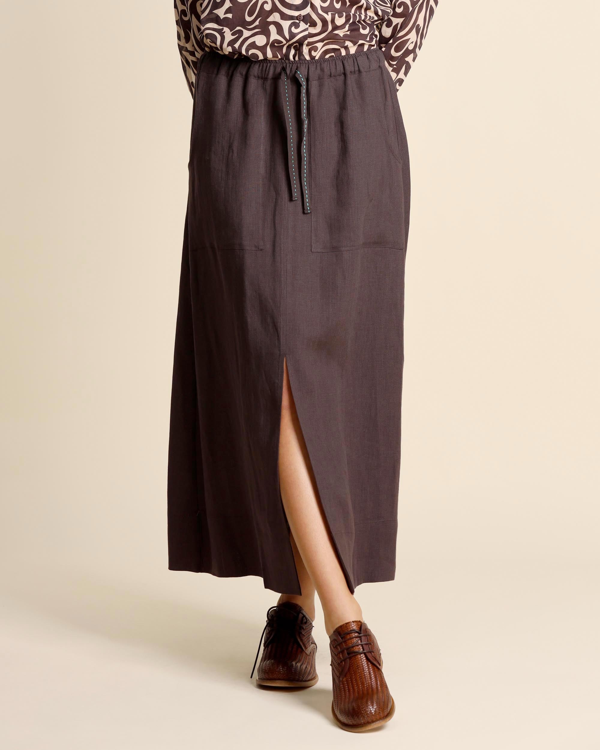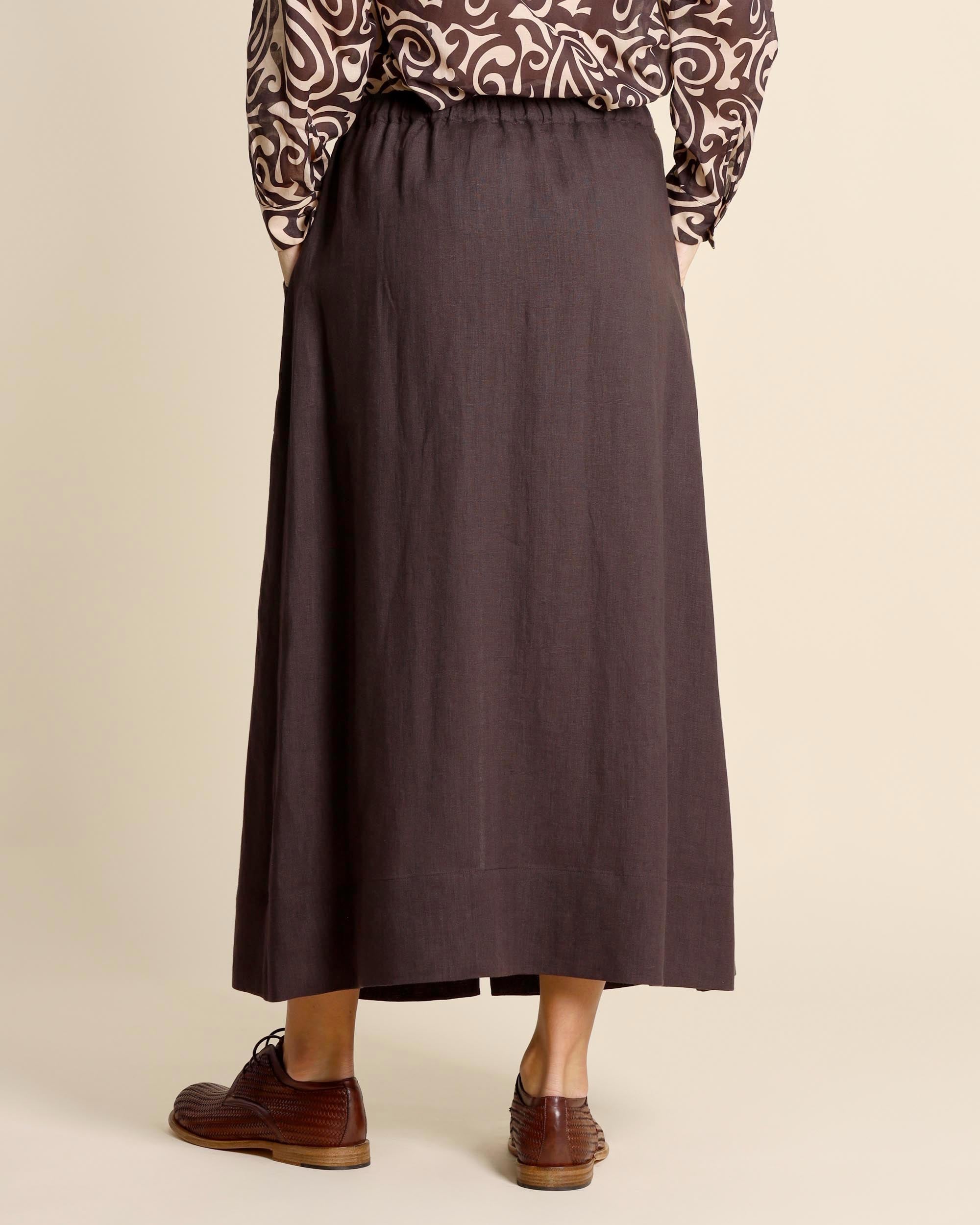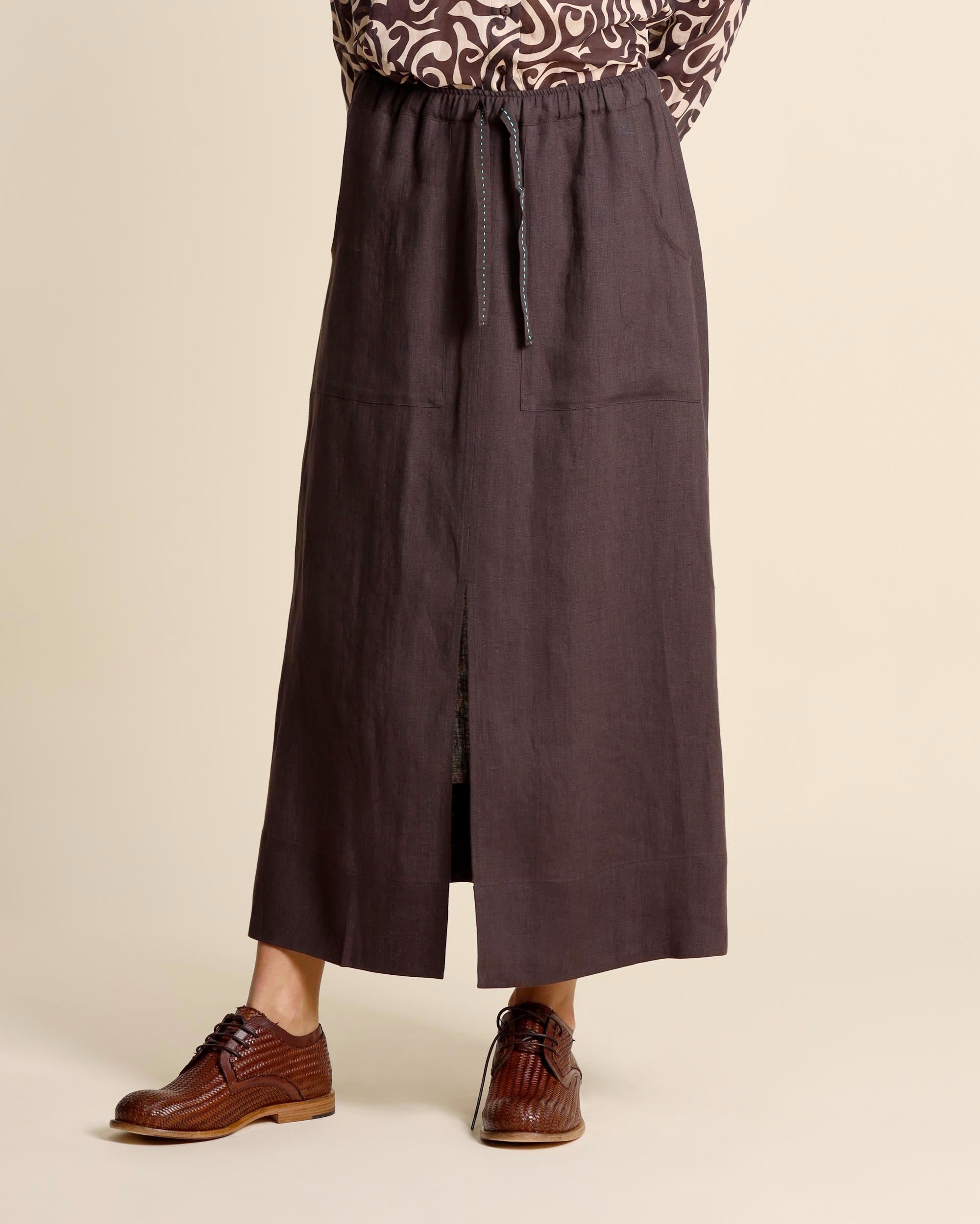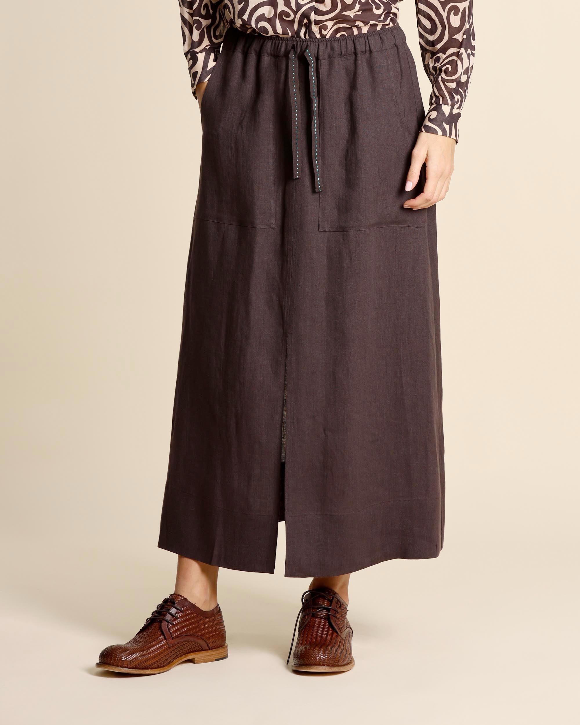 Gonna lunga marrone in lino, vita elastica con coulisse, tasche sul davanti, linea mobida, sfoderata, la modella indossa una tg.S, la modella ha le seguenti misure: altezza 177, seno 86,vita 65, fianchi 93, collezione donna Niù Primavera Estate 2026