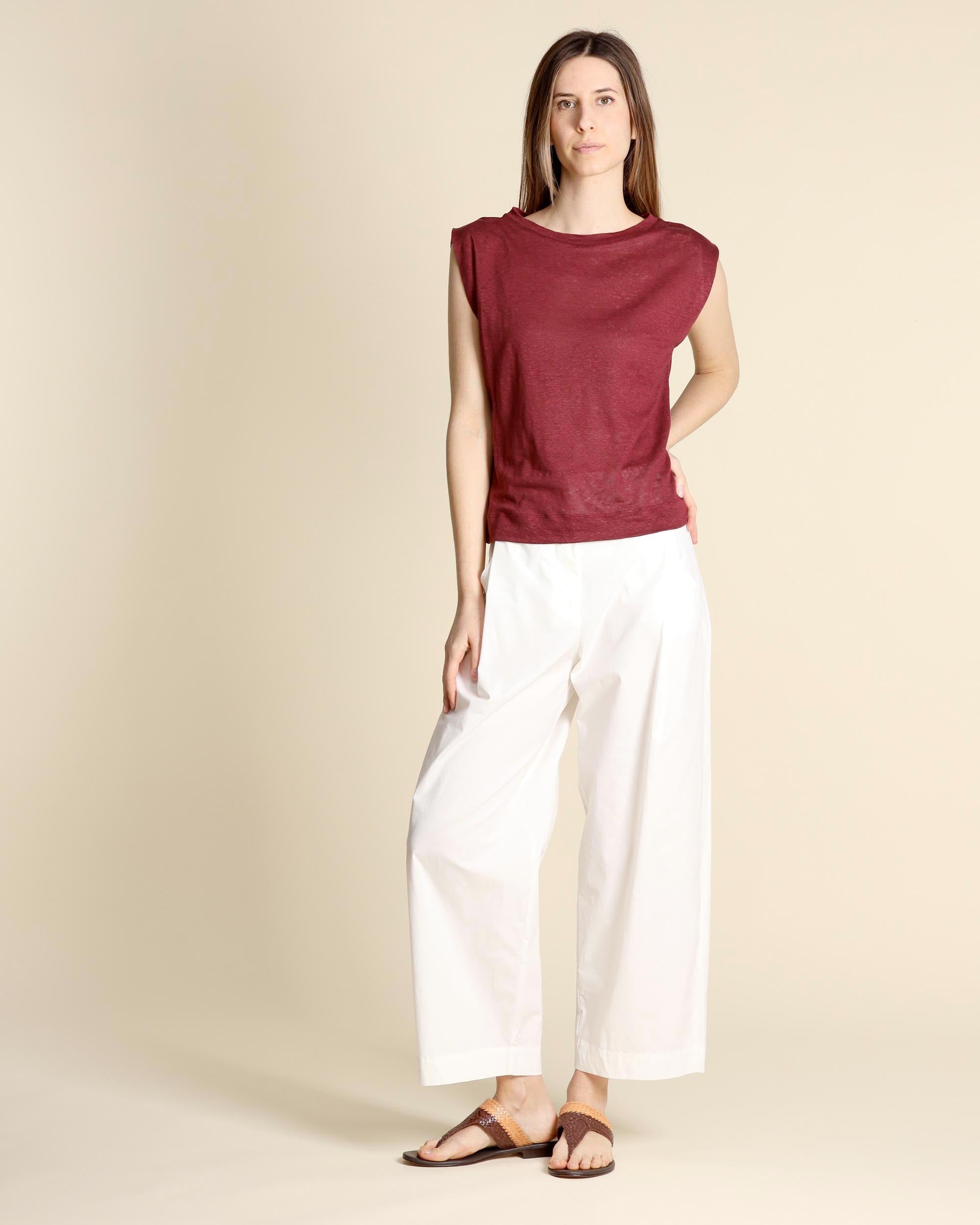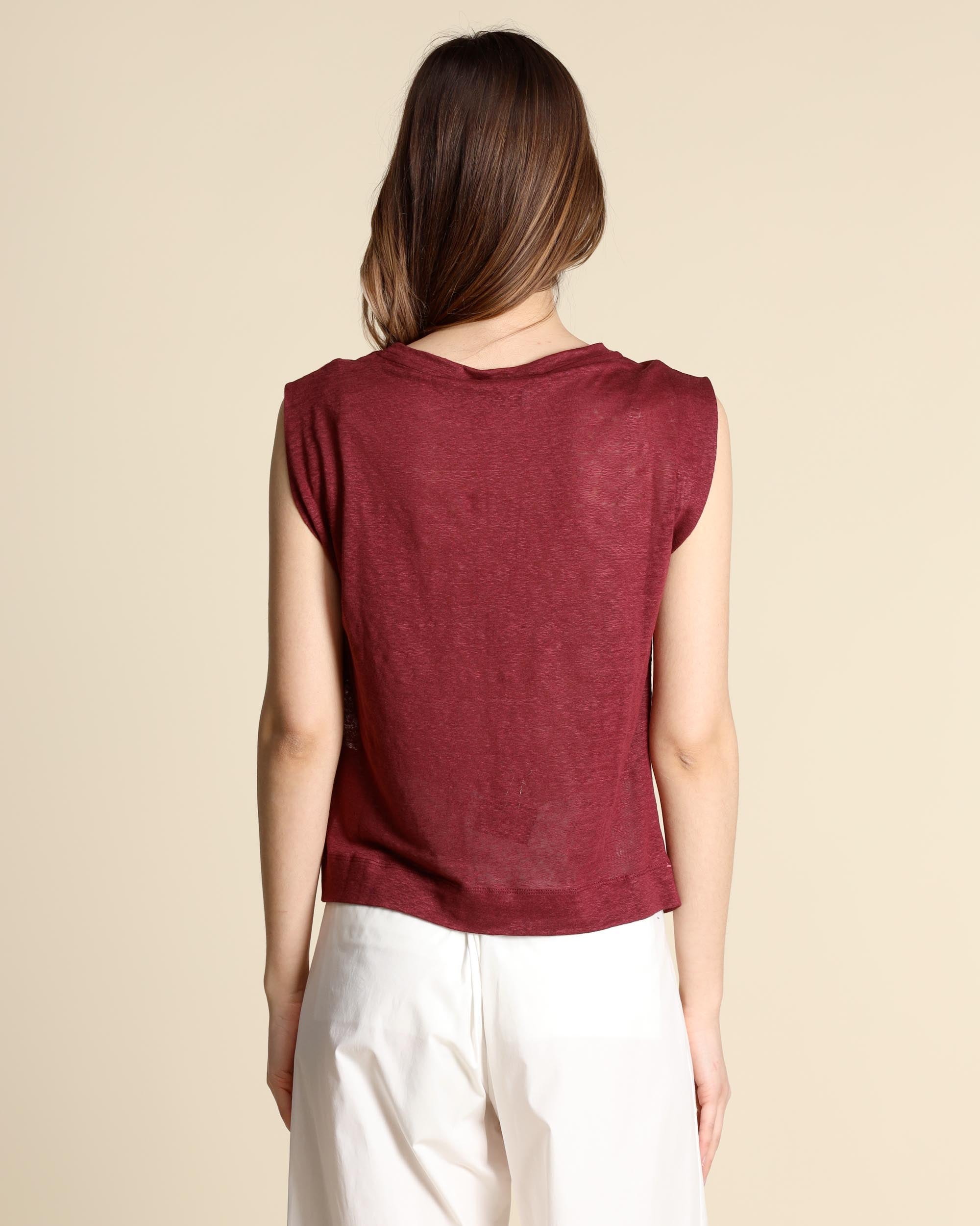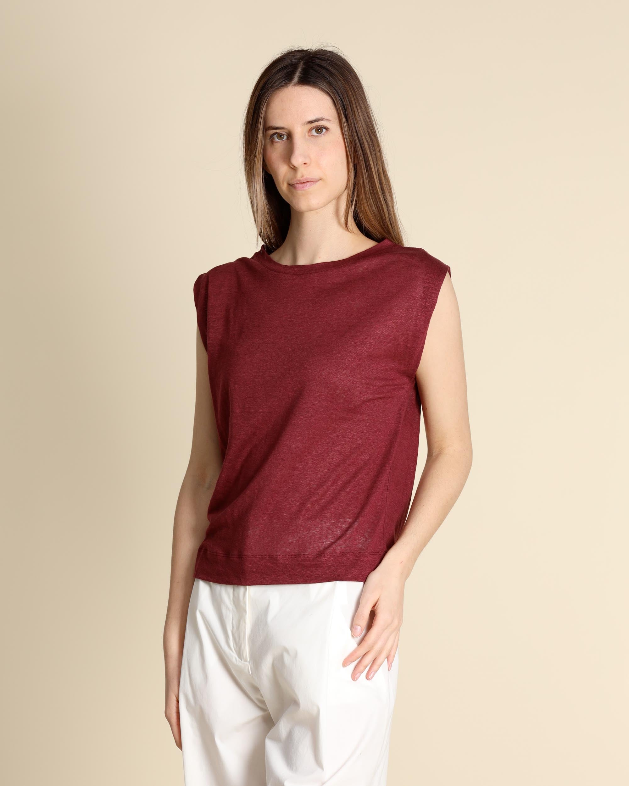 Maglia in jersey di lino bordeaux, senza maniche, scollo a barchetta, linea morbida, la modella indossa una tg.S, la modella ha le seguenti misure: altezza 177, seno 86,vita 65, fianchi 93, collezione donna Niù Primavera Estate 2026