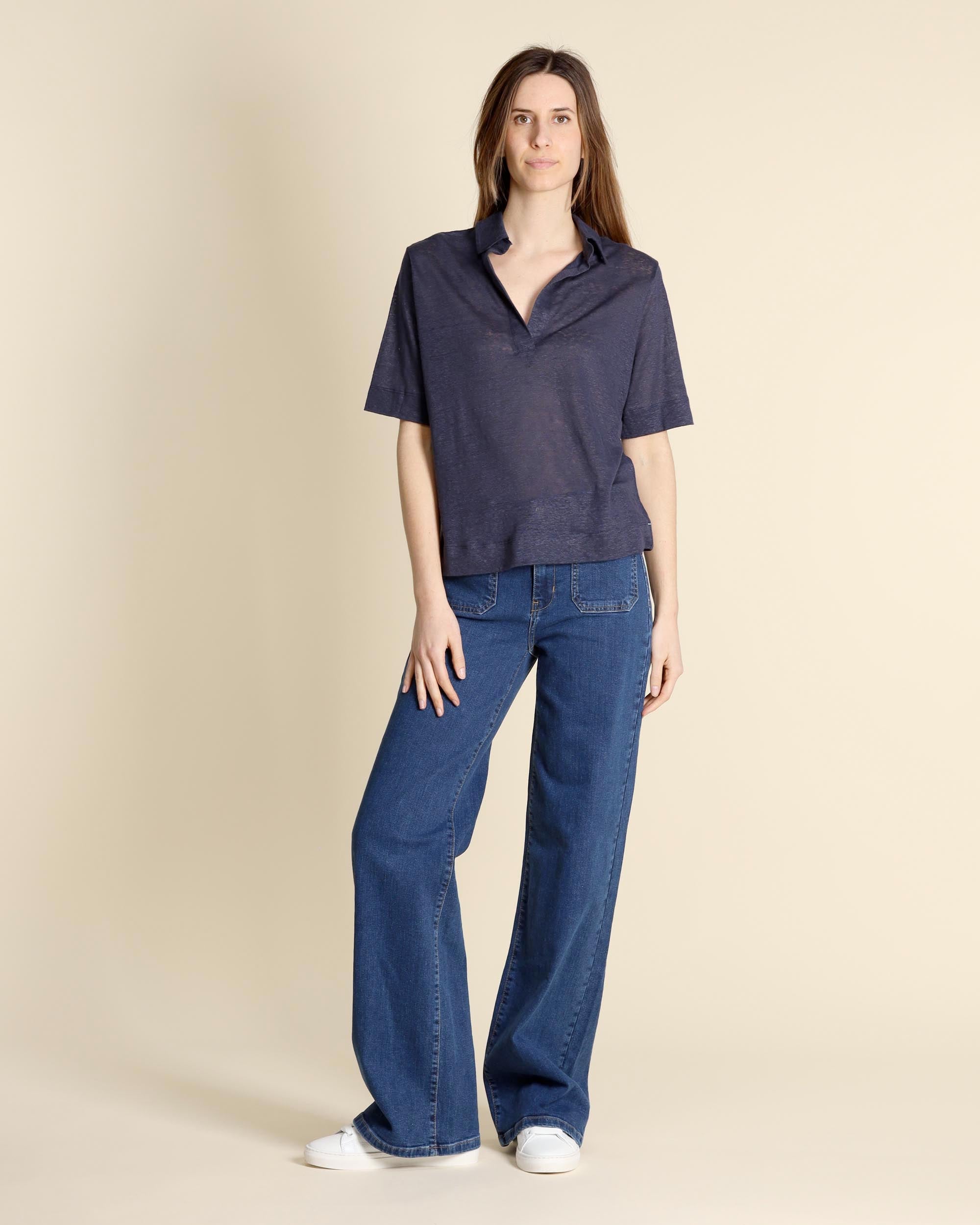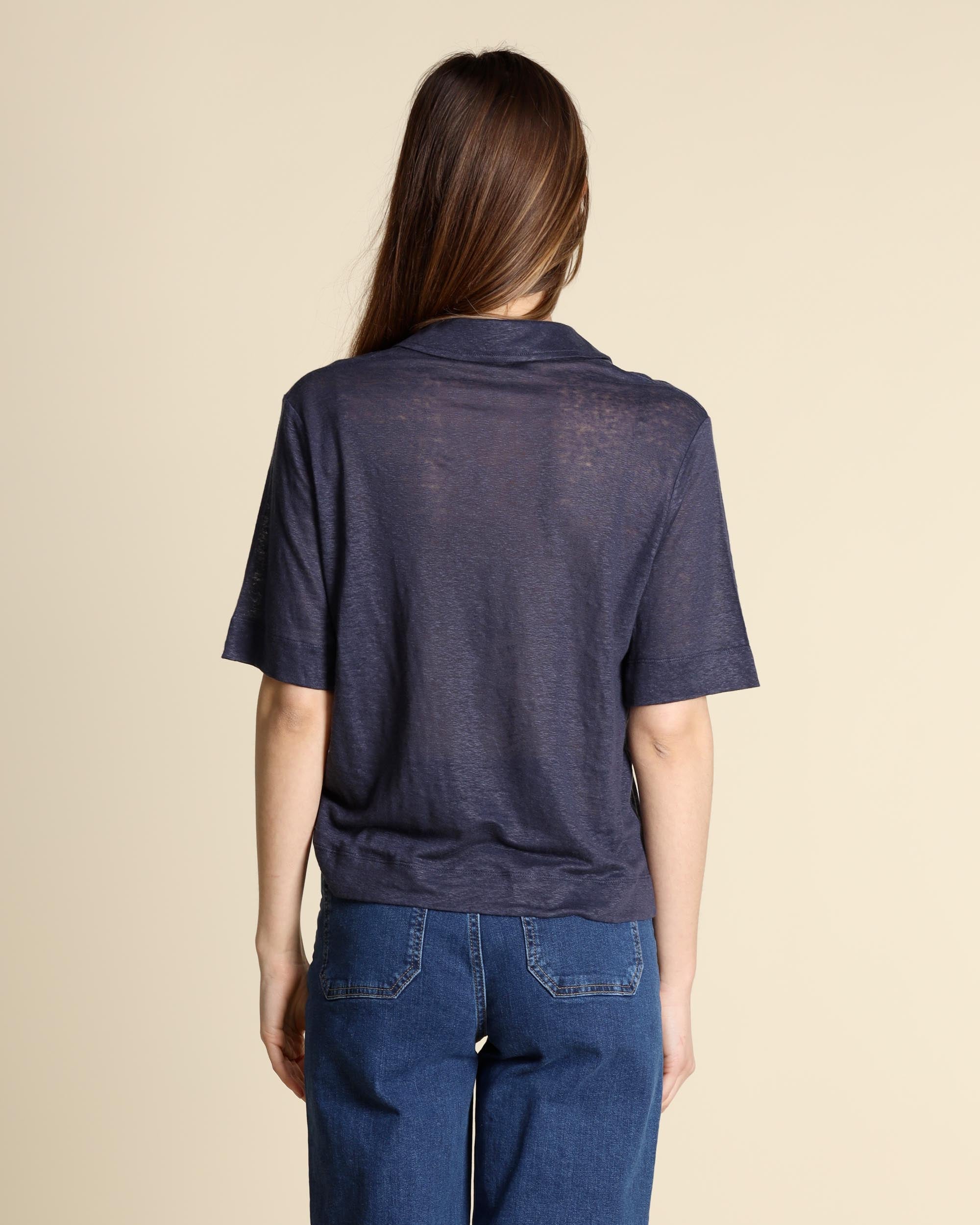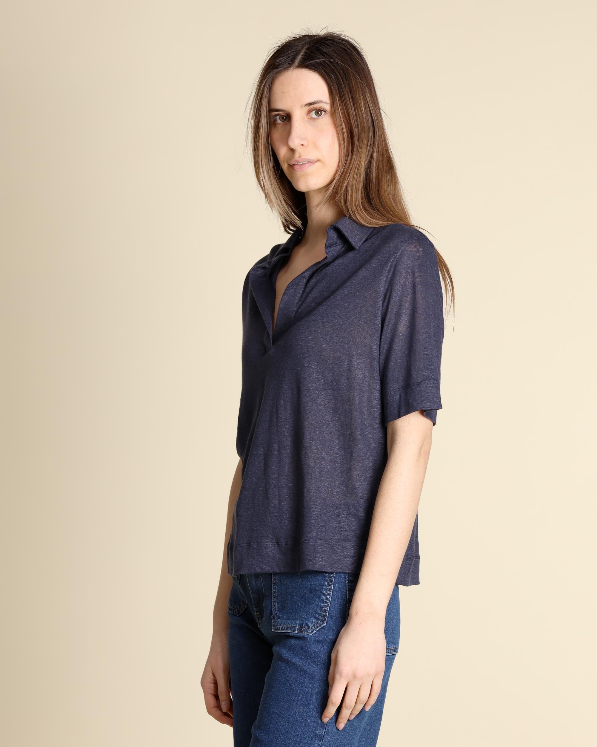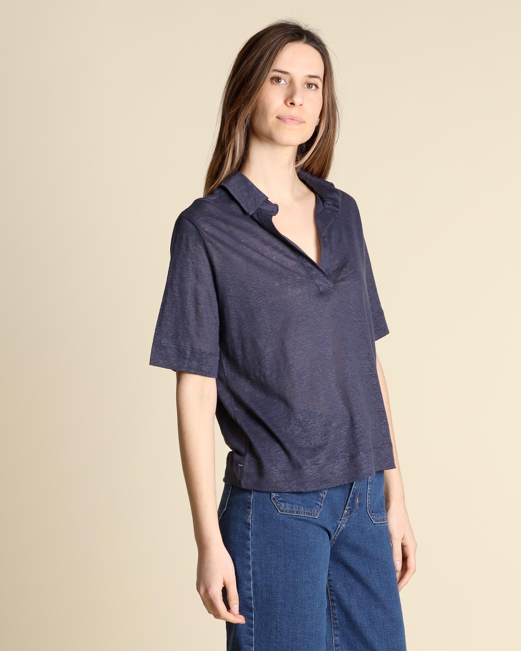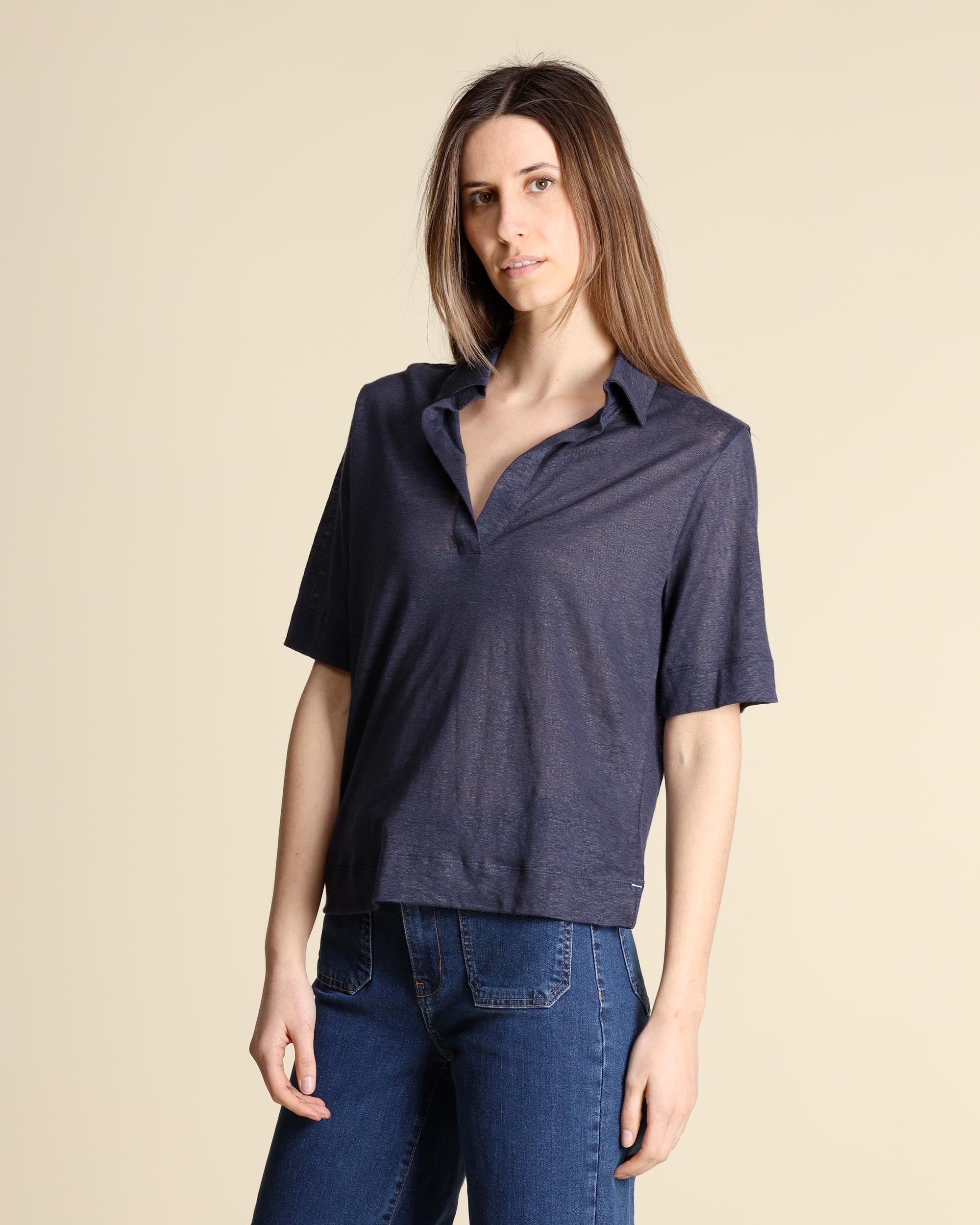 Maglia a polo in jersey di lino blu, maniche corte, linea morbida, la modella indossa una tg.S, la modella ha le seguenti misure: altezza 177, seno 86,vita 65, fianchi 93, collezione donna Niù Primavera Estate 2026