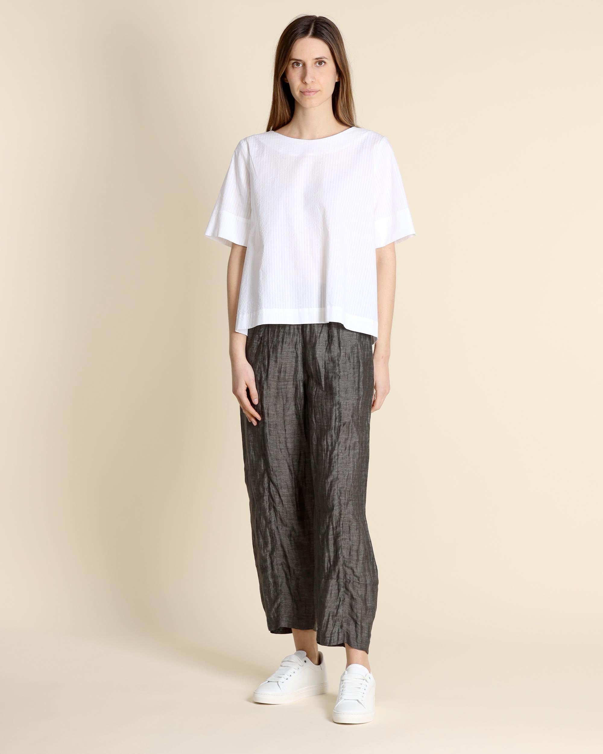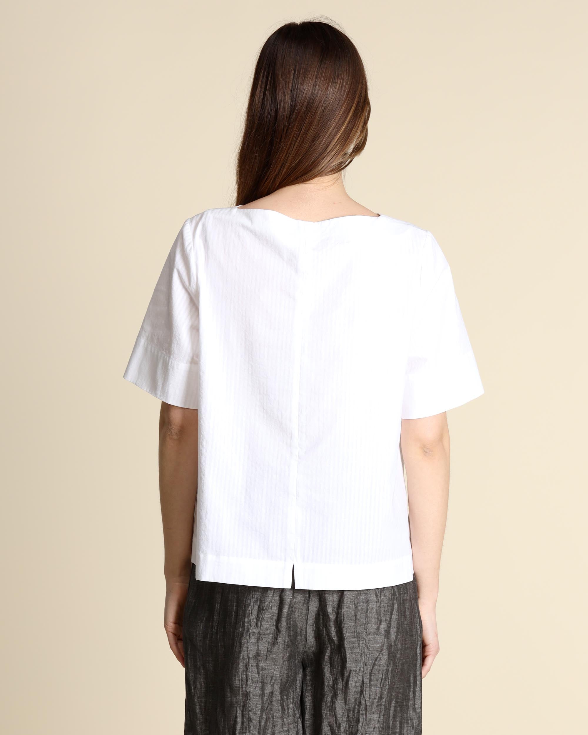 Blusa bianca in cotone, maniche corte, scollo tondo, linea morbida, piccolo spacco centrale sul dietro, la modella indossa una tg.S, la modella ha le seguenti misure: altezza 177, seno 86,vita 65, fianchi 93, collezione donna Niù Primavera Estate 2026