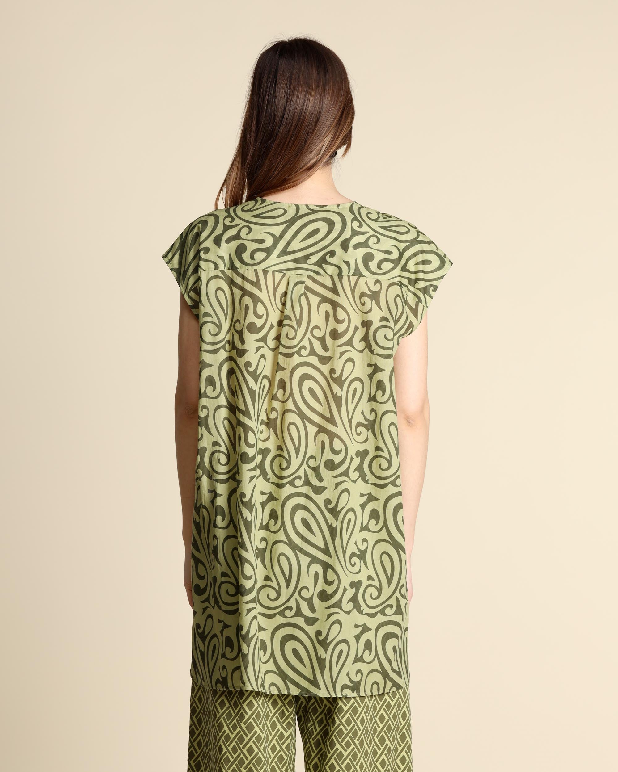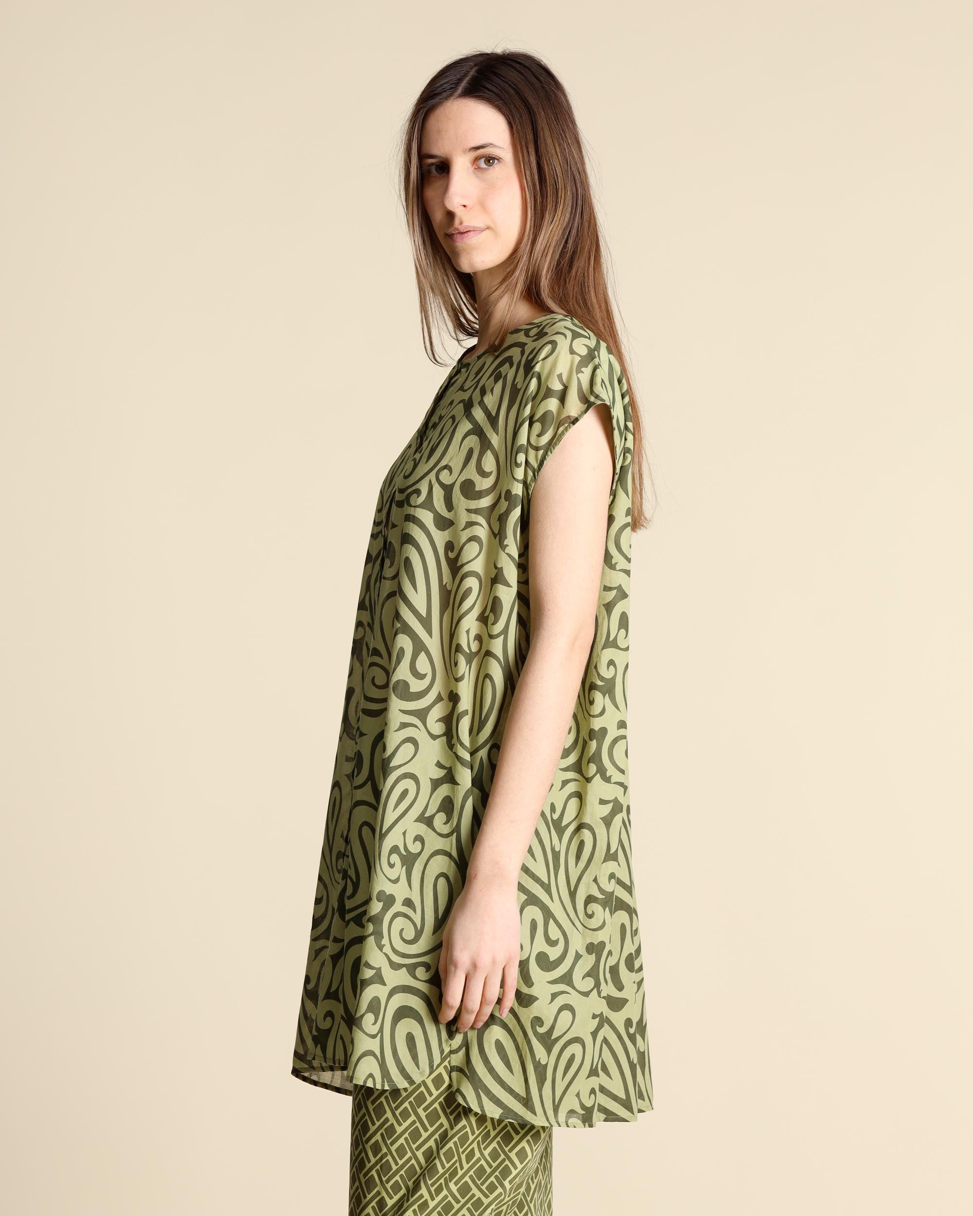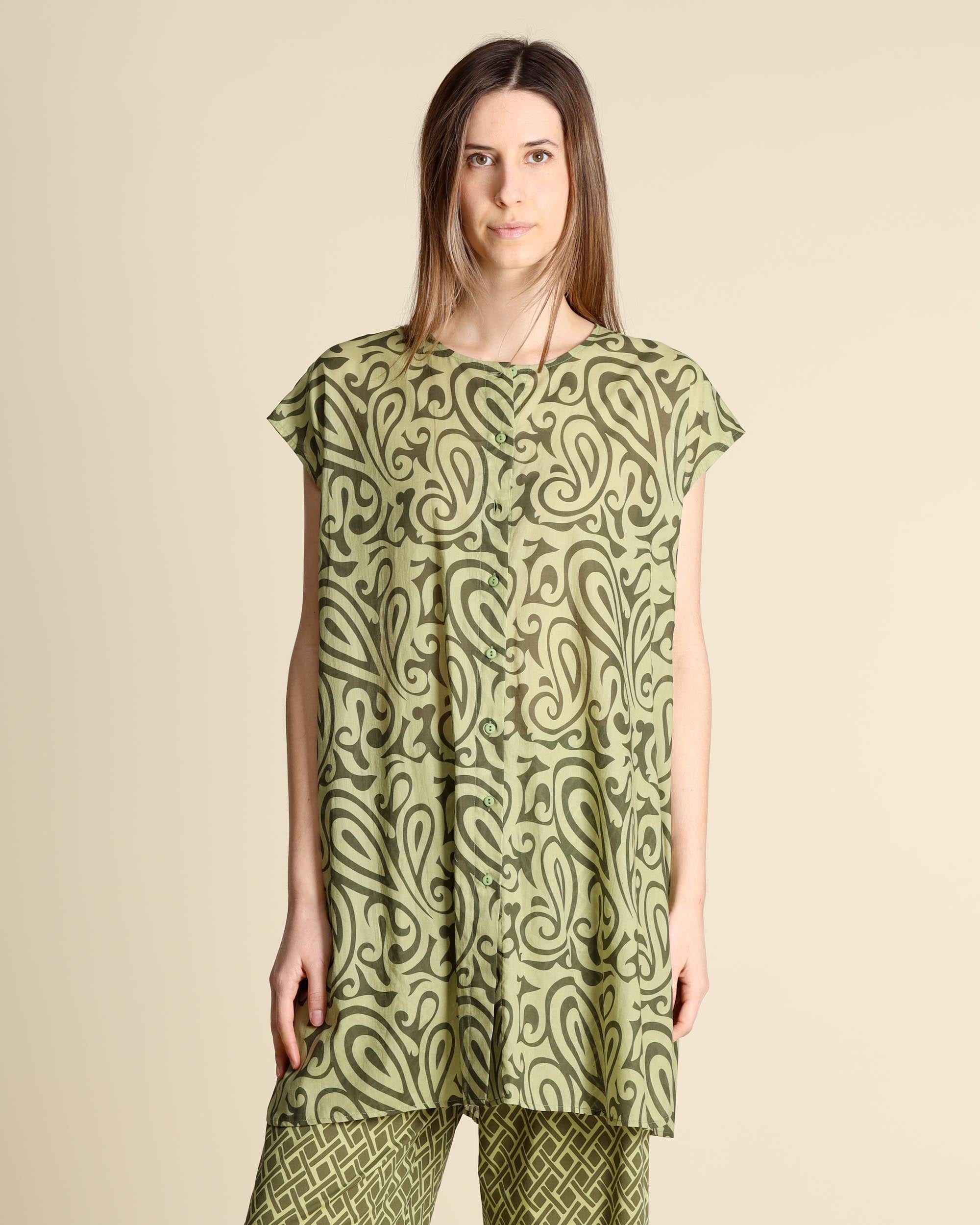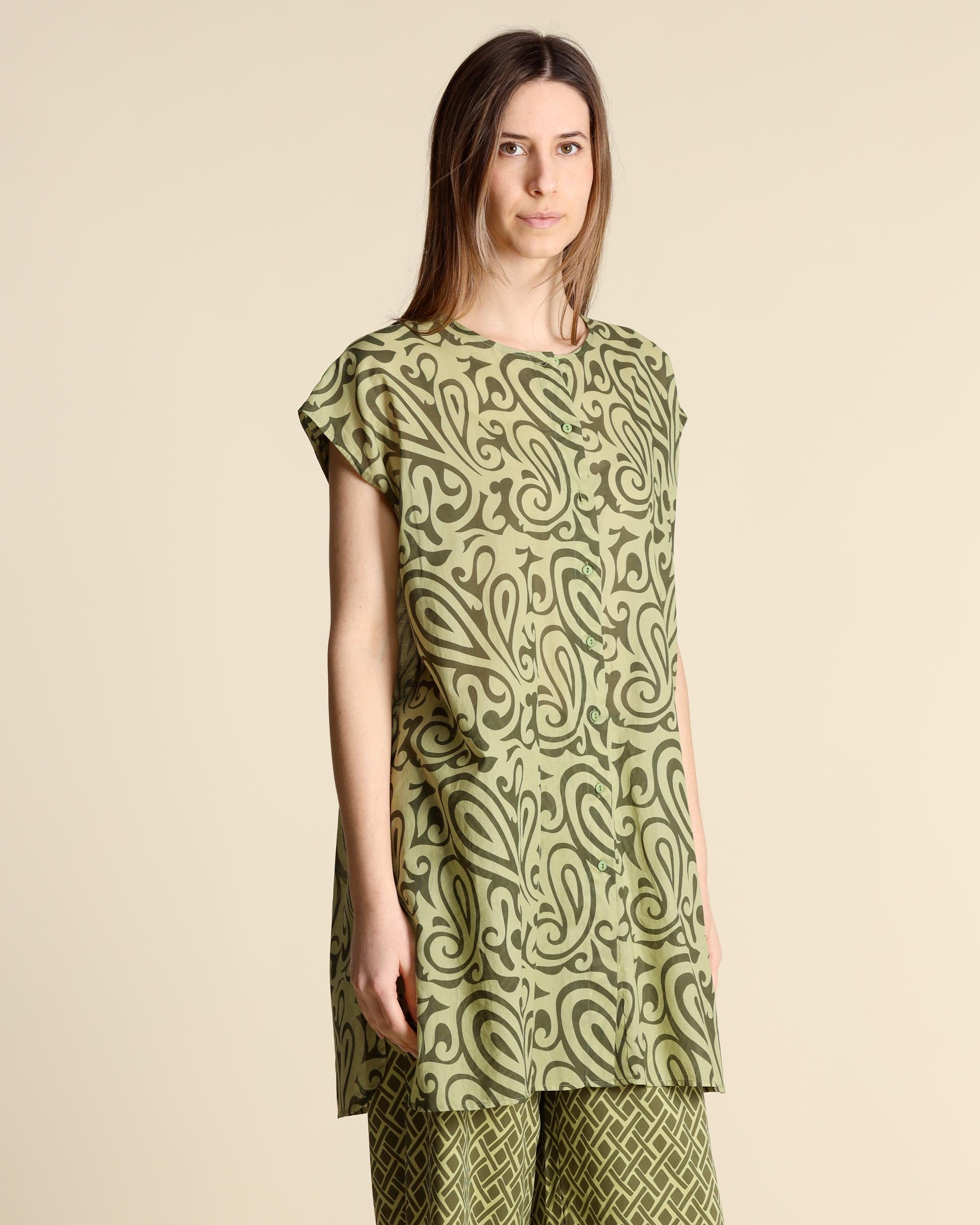 Camicia lunga in mussola di cotone a fantasia verde, maniche ad aletta, scollo tondo, spacchi laterali, chiusura con bottoni, linea morbida, la modella indossa una tg.S, la modella ha le seguenti misure: altezza 177, seno 86,vita 65, fianchi 93, collezione donna Niù Primavera Estate 2026