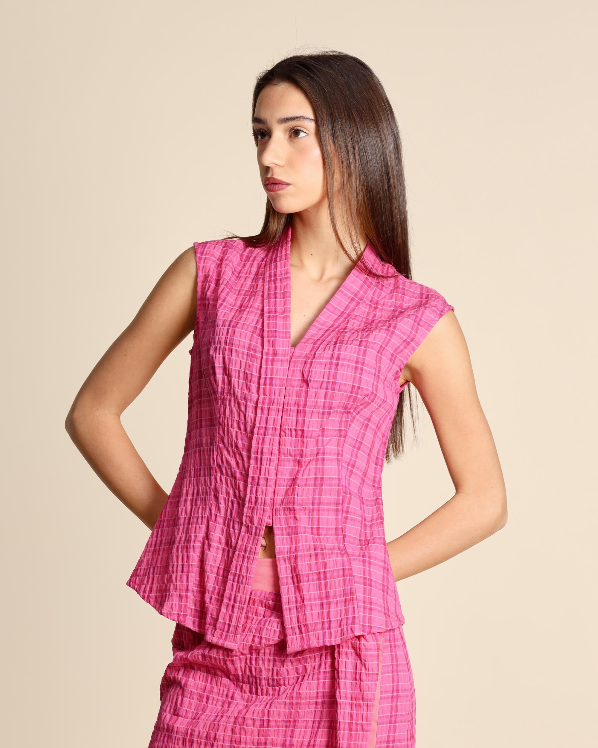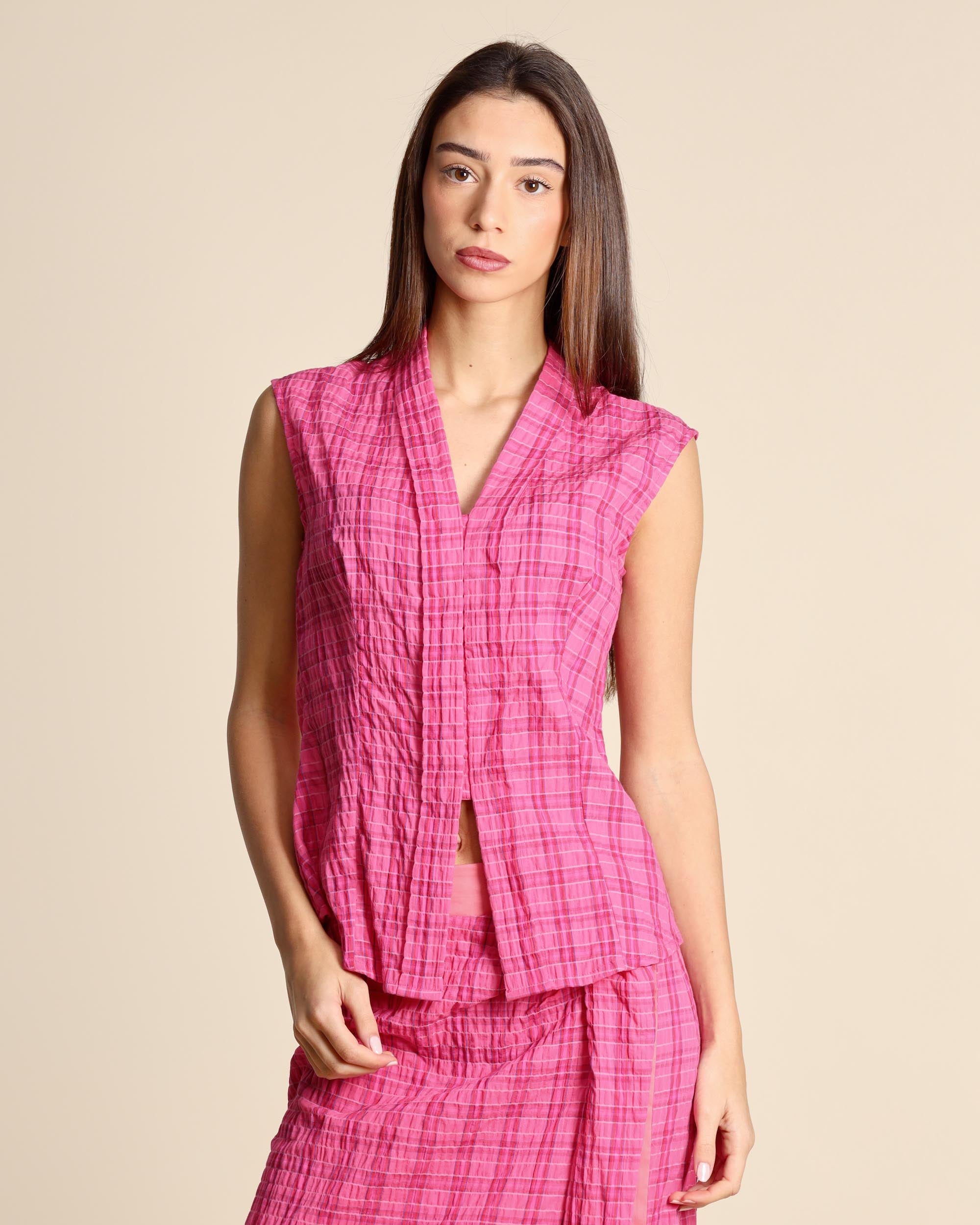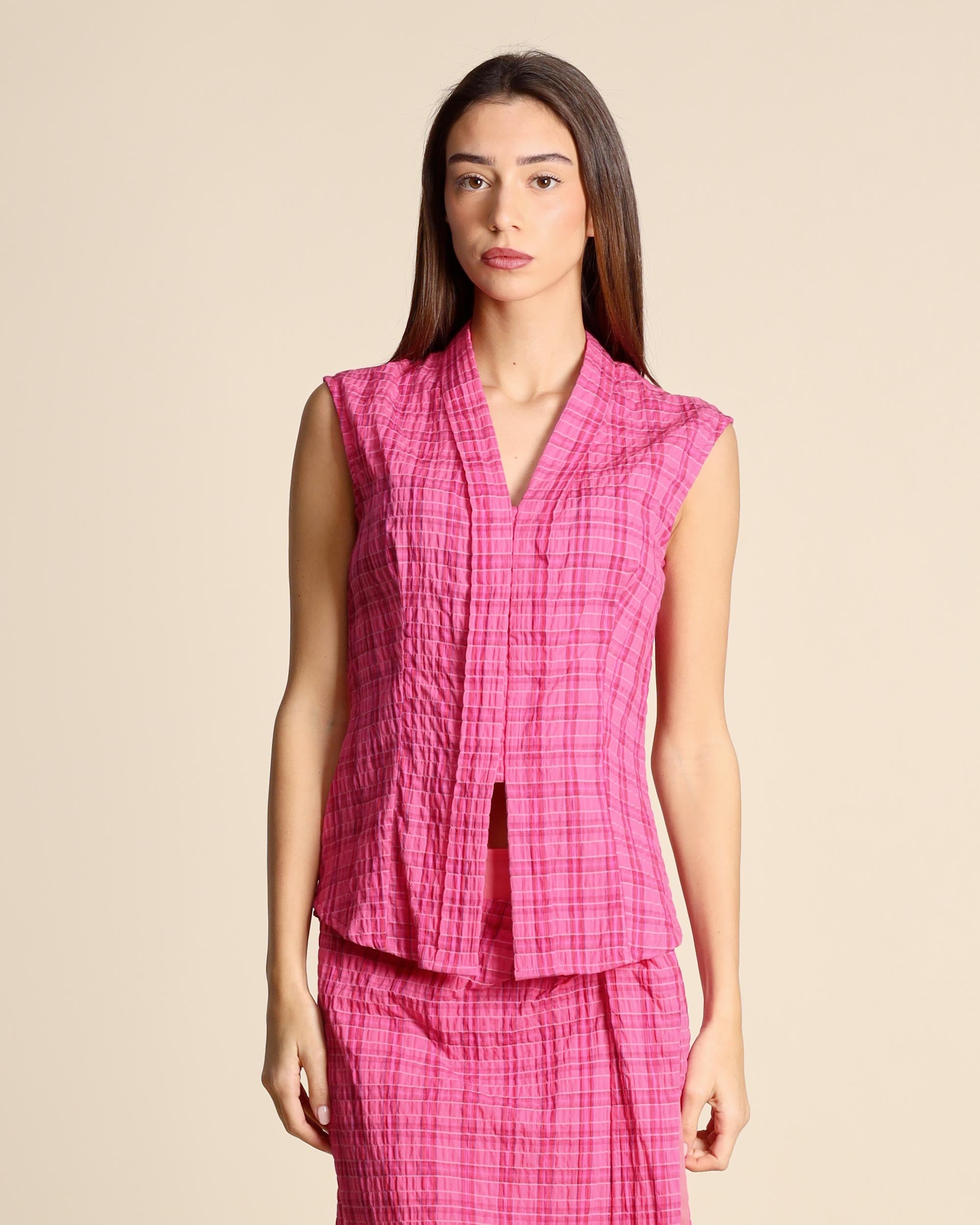 Camicia check fucsia in cotone goffrato, senza maniche, scollo a V, chiusura con bottoni nascosti, linea semiaderente, la modella indossa una tg.S, la modella ha le seguenti misure: altezza 177, seno 86,vita 65, fianchi 93, collezione donna Niù Primavera Estate 2026
