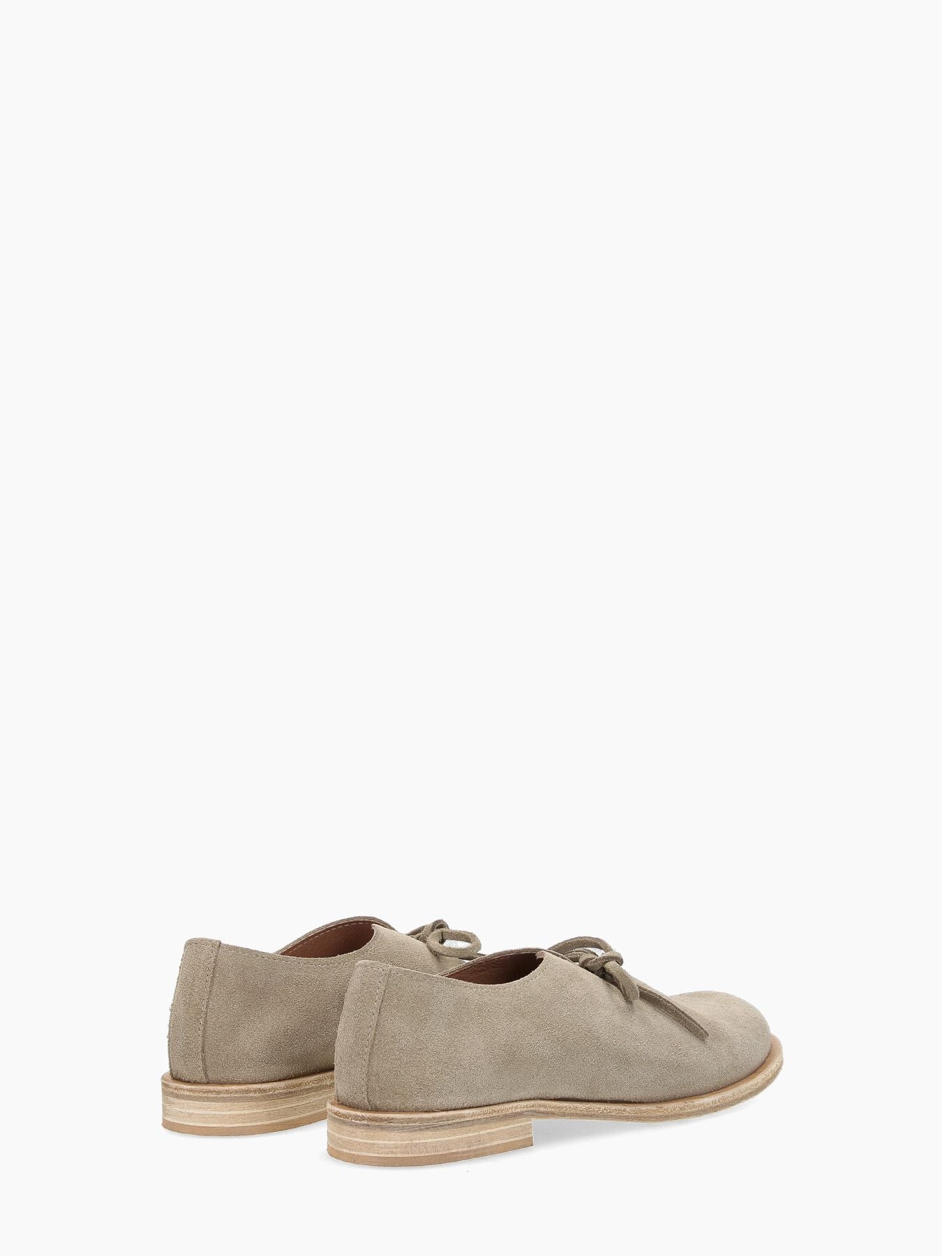 Scarpe basse in pelle scamosciata taupe, tacco 20 mm, lacci inpelle scamosciata taupe, sottopiede in pelle, suola in cuoio, punta tonda, made in Italy, lavorazione artigianale, collezione donna B-Essential Primavera Estate 2020