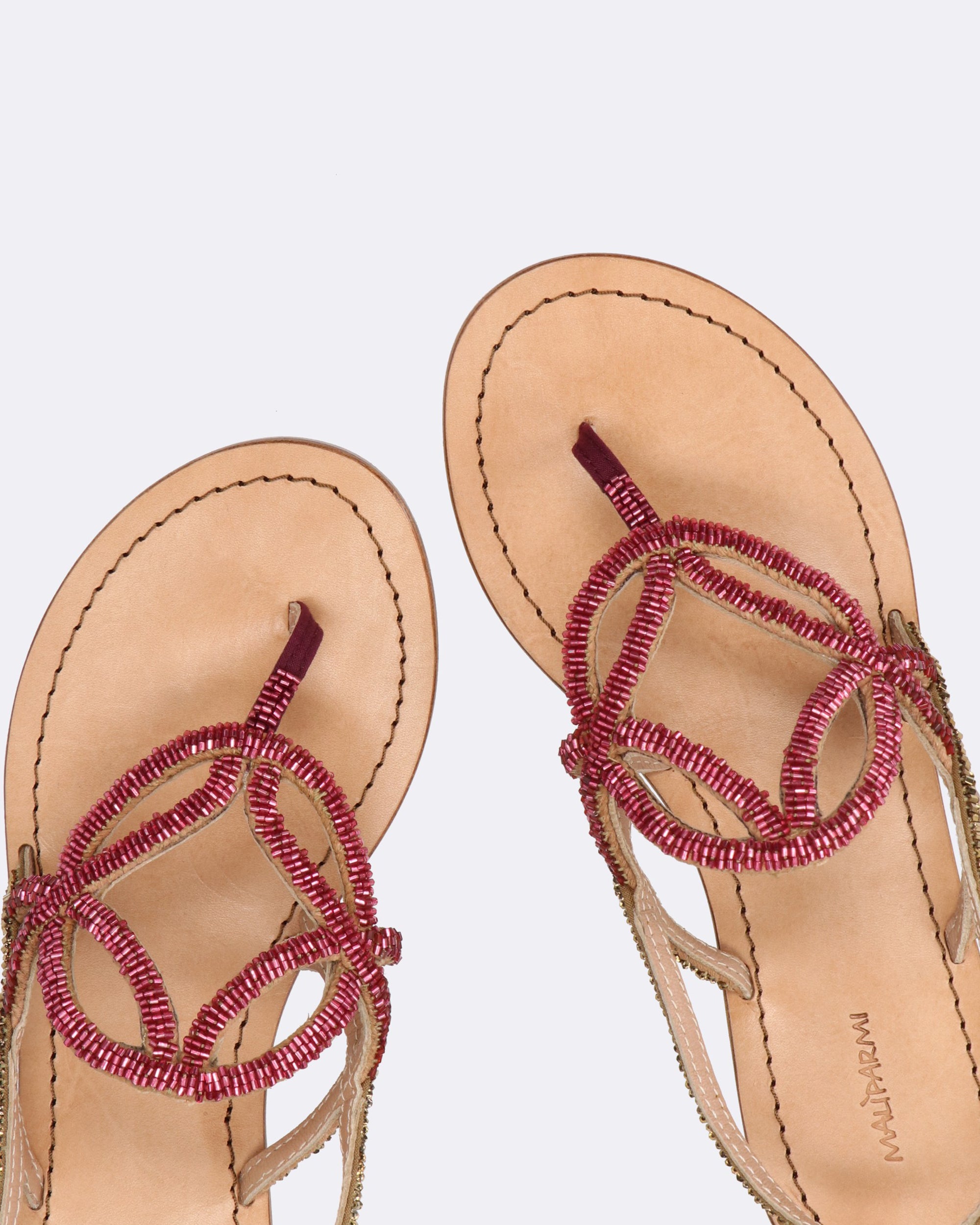 Sandali bassi gioiello rosa e bronzo, ricami fatti a mano con perline, sottopiede in pelle, suola in cuoio con logo Maliparmi, punta tonda, tacco 10mm, cinturino regolabile con fibbia, collezione donna Maliparmi Primavera Estate 2025