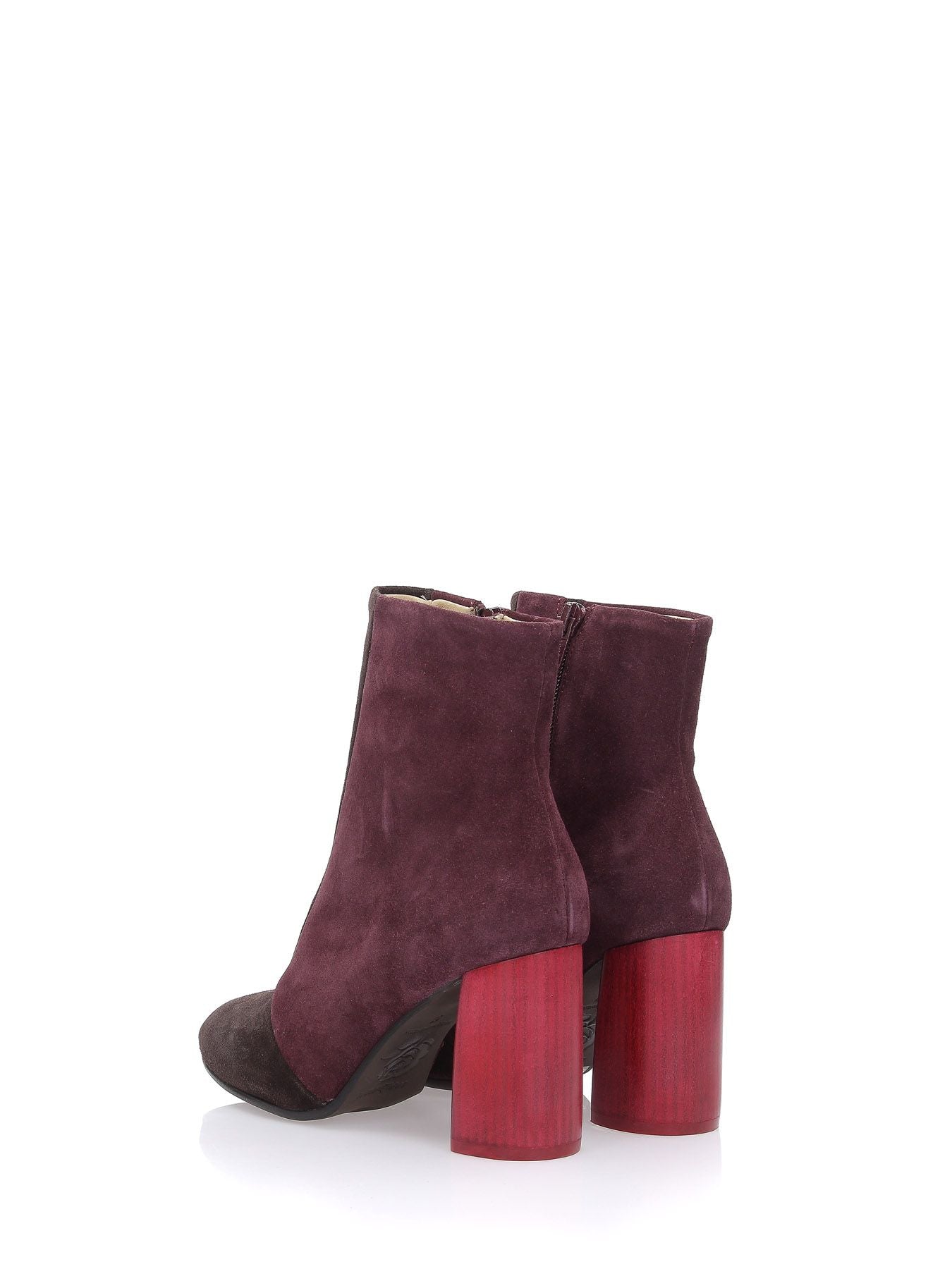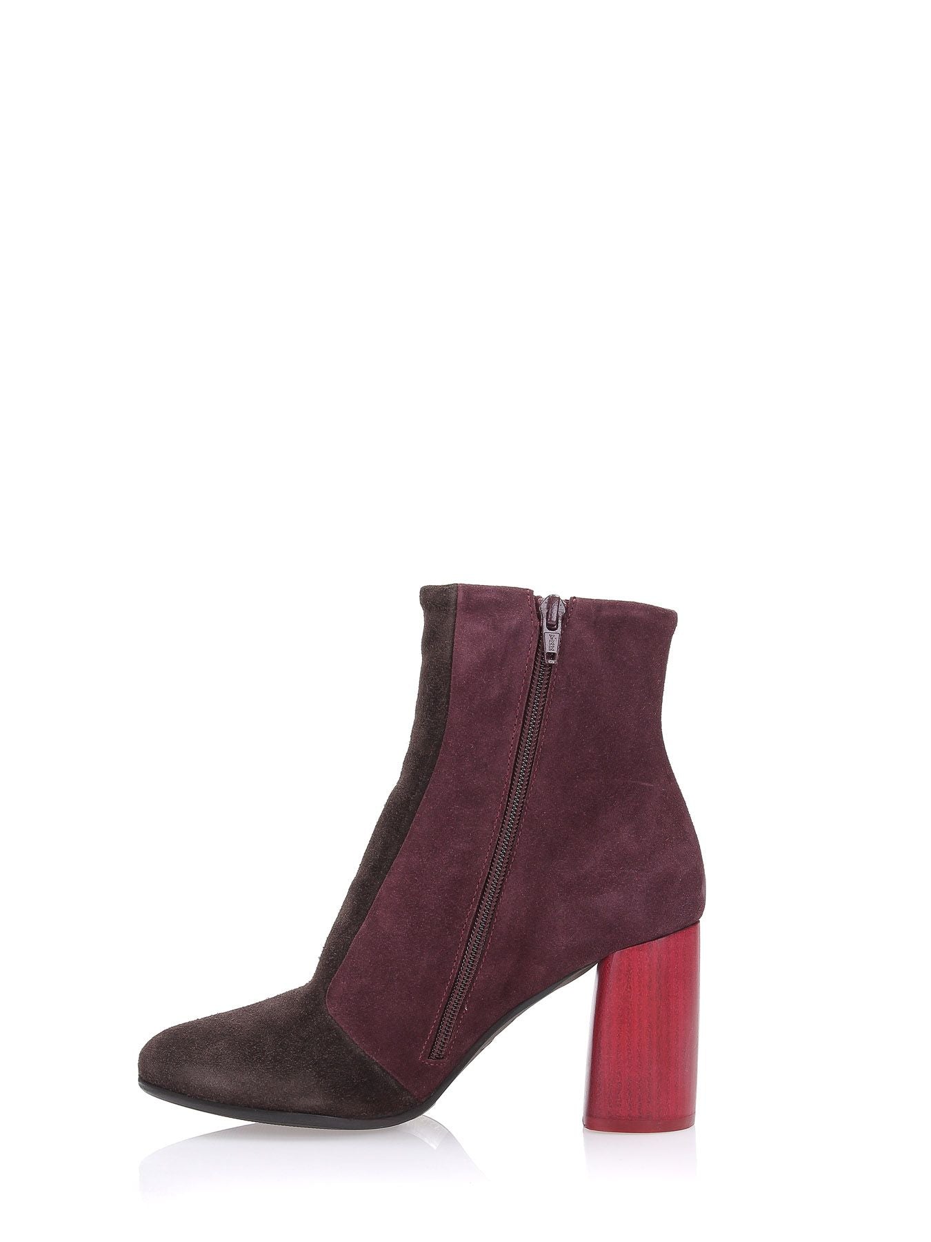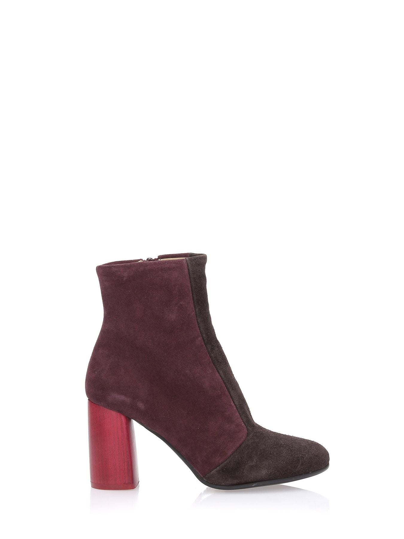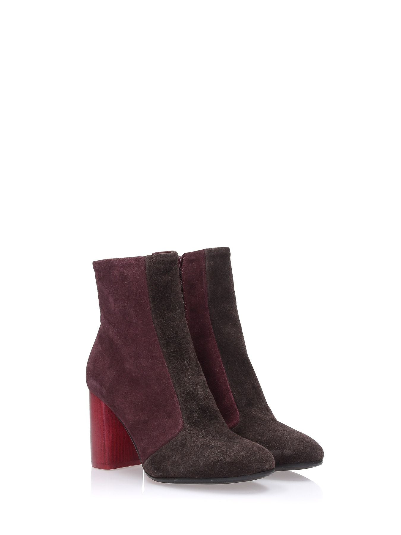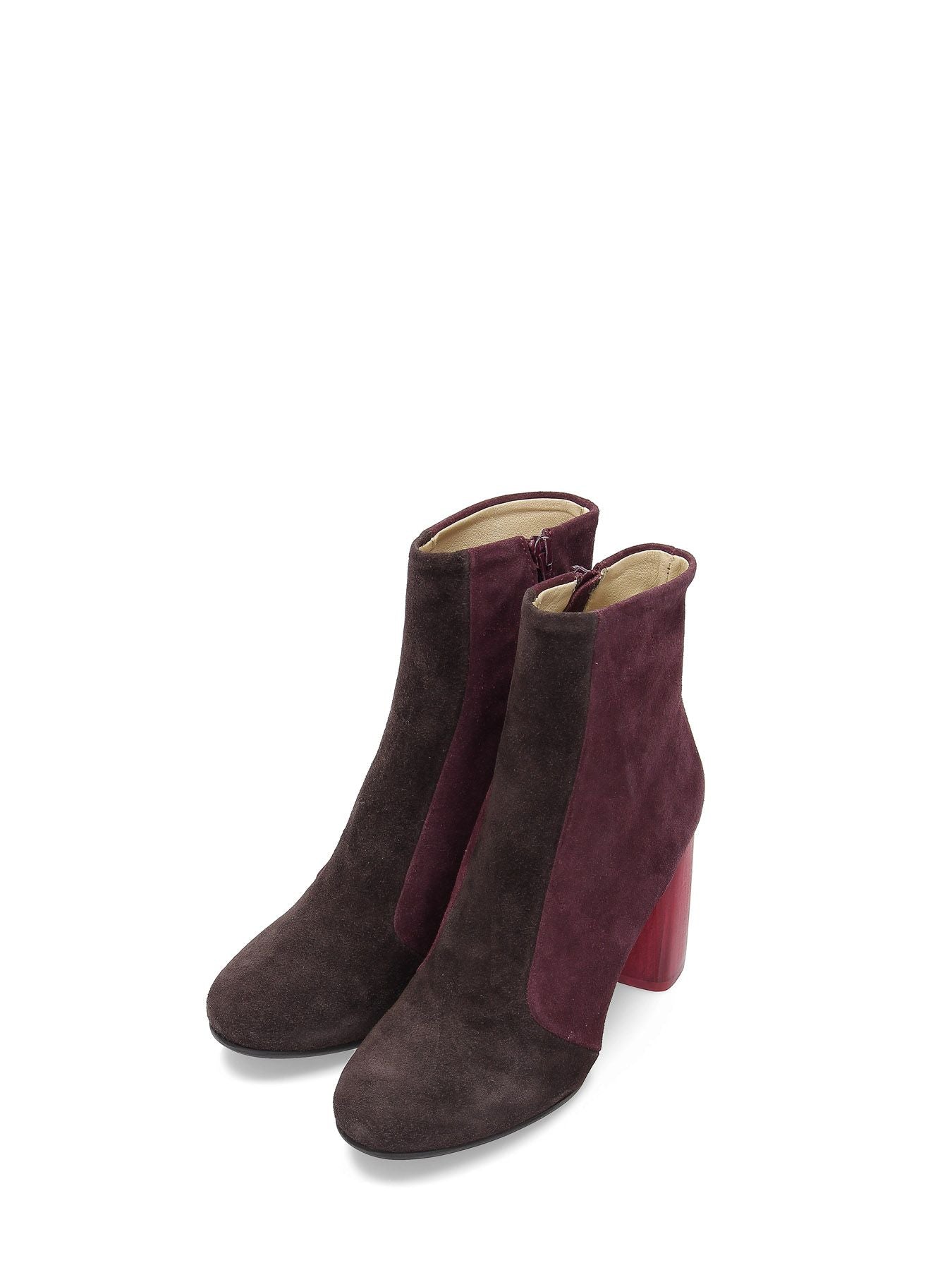 Stivaletti in suede patch bordeaux e marrone, fodera in pelle, suola in gomma con logo Maliparmi, tacco rosso in cuoio semilucido a contrasto 80mm, chiusura con zip laterale, punta tonda, sottopiede in pelle, collezione donna Maliparmi Autunno Inverno 2019