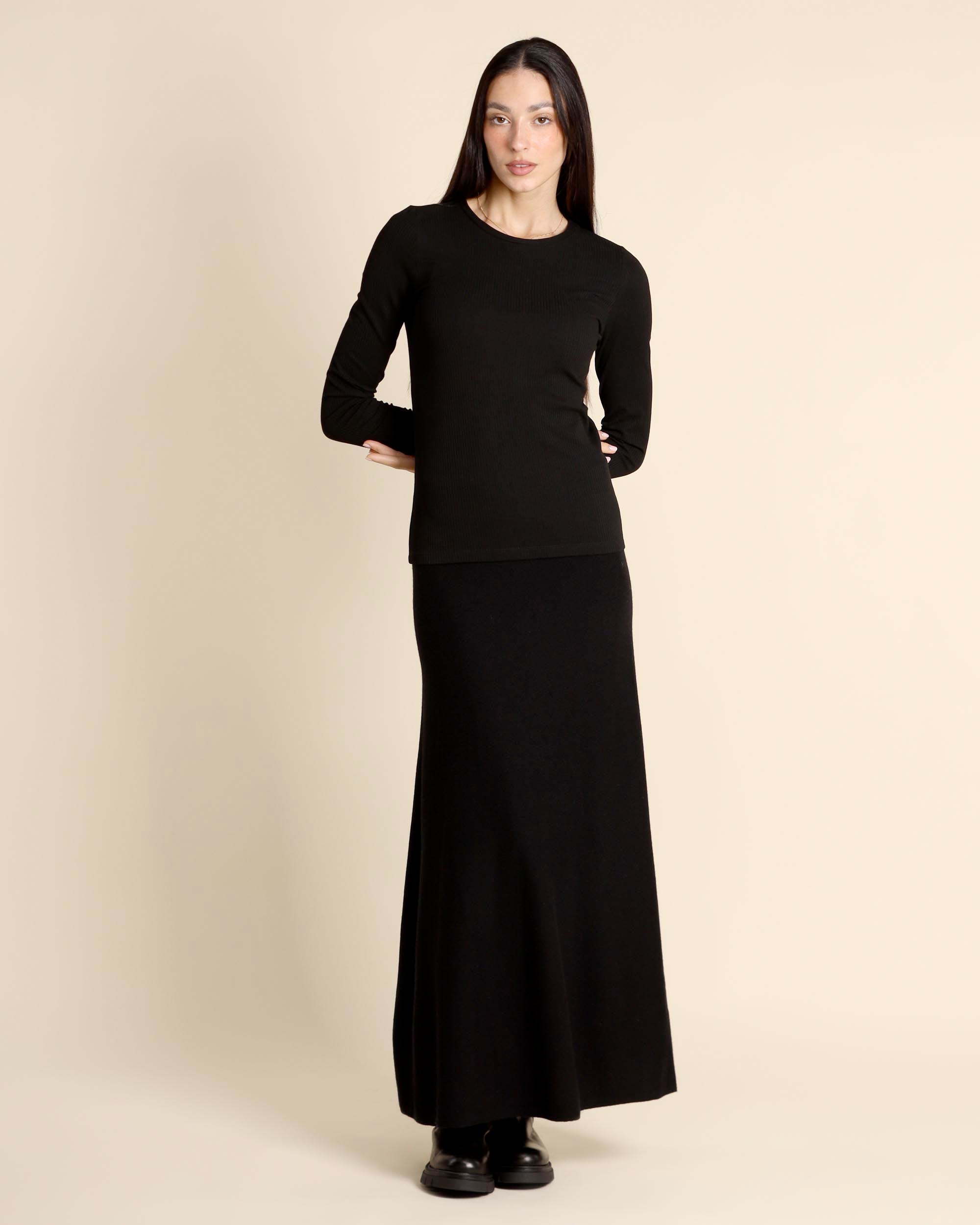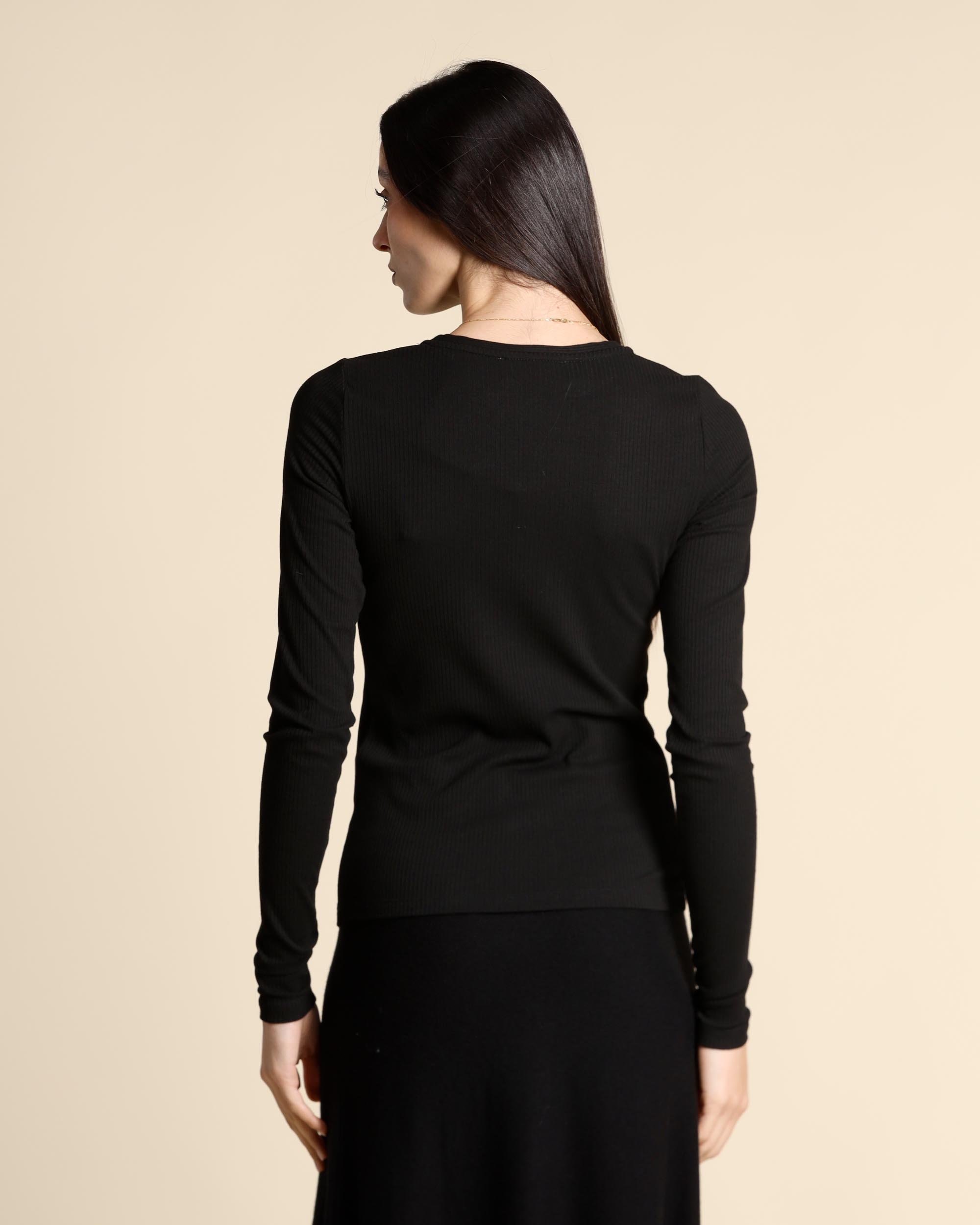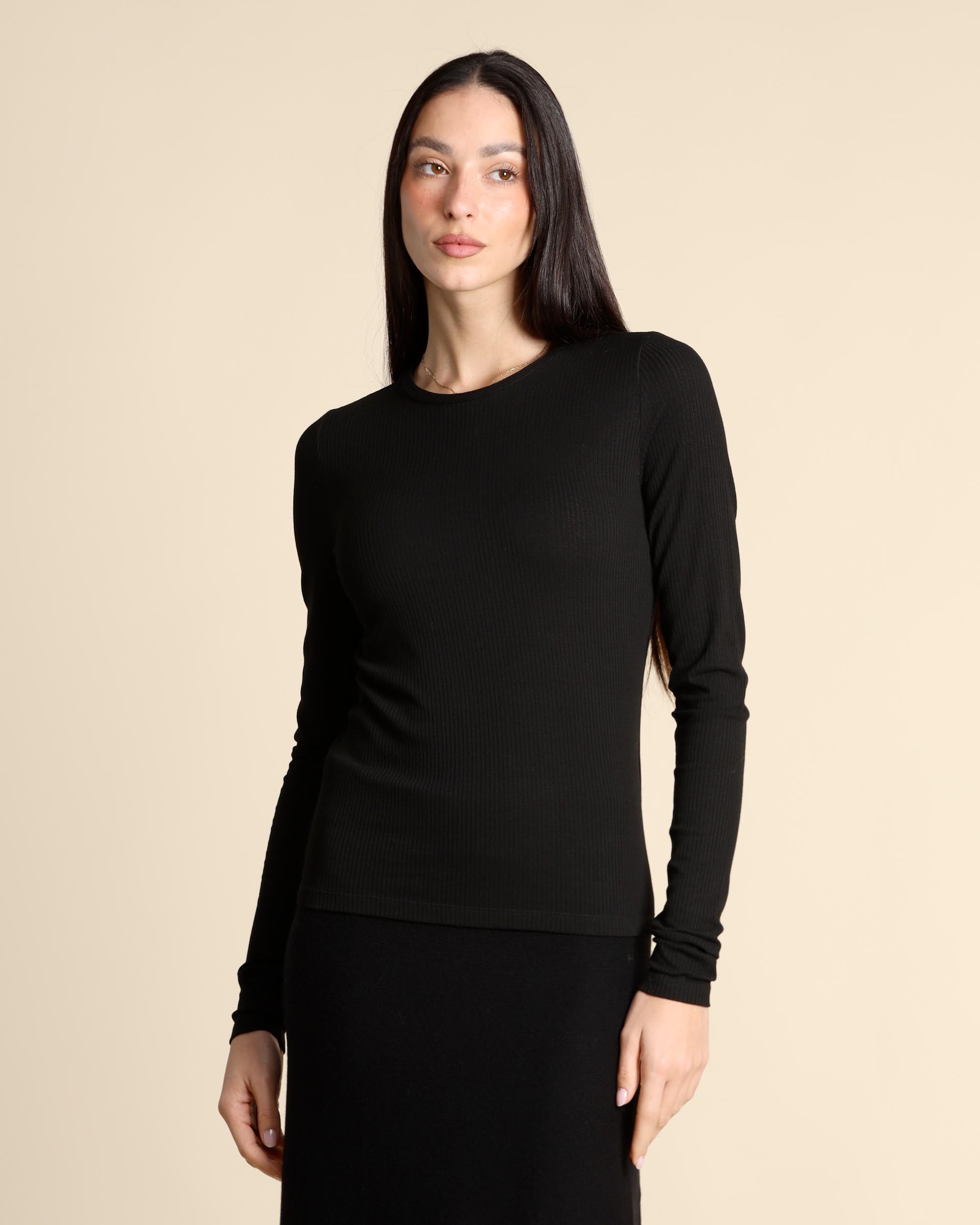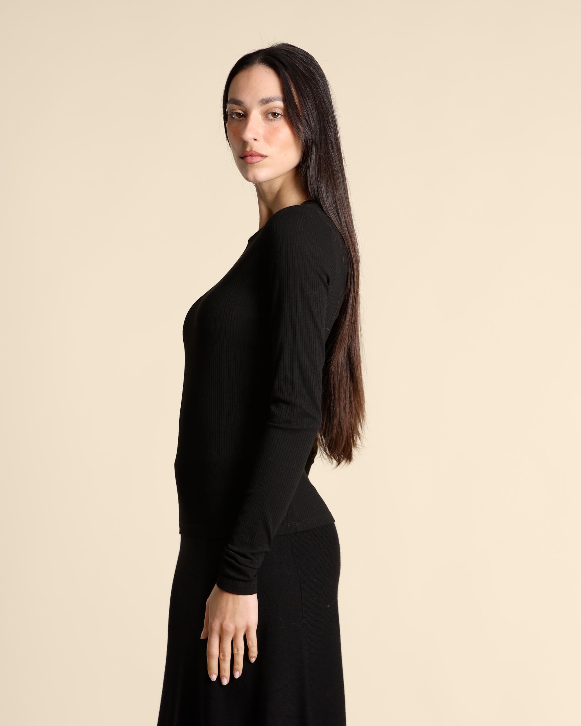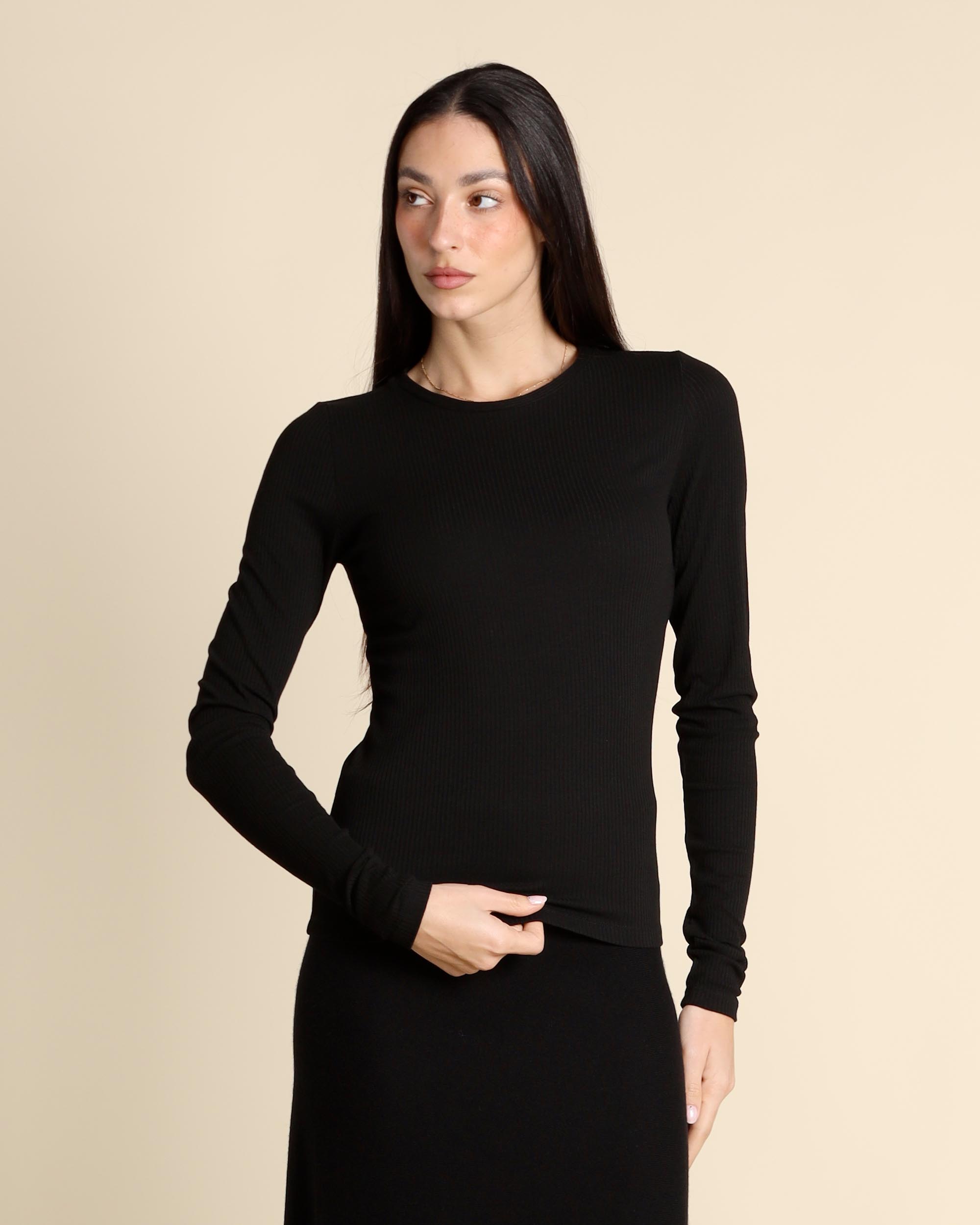 T shirt nera in jersey di viscosa stretch con lavorazione a costine, scollo tondo, maniche lunghe, linea aderente, la modella indossa una tg.S, la modella ha le seguenti misure: altezza 173, seno 84, vita 63, fianchi 94, collezione donna I Blues Autunno Inverno 2025/26
