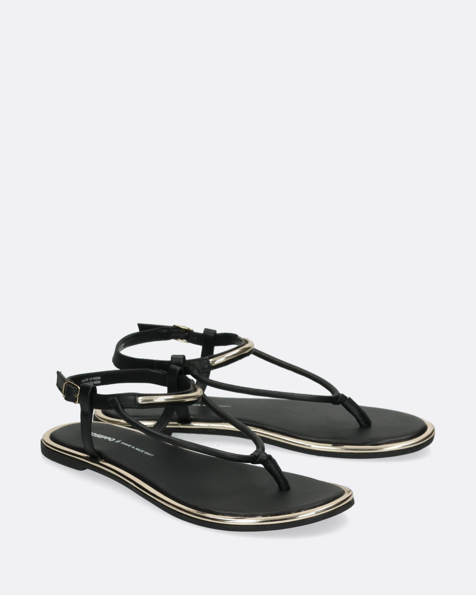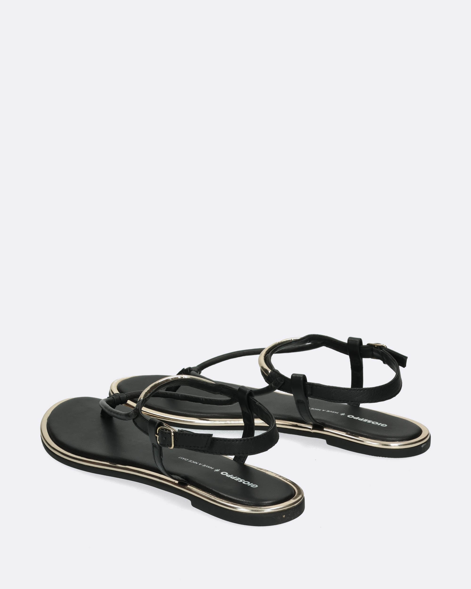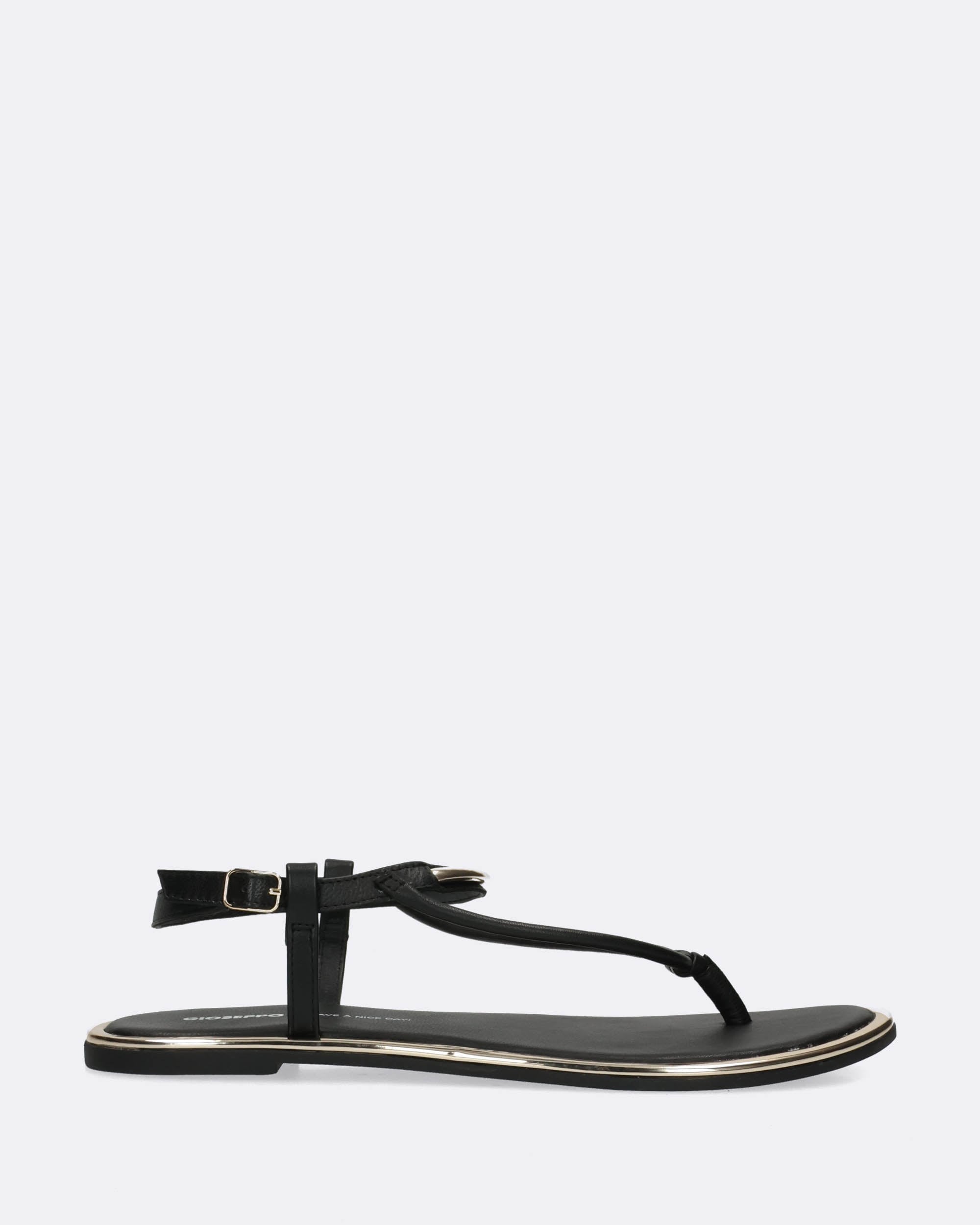 Sandali bassi neri in pelle, tacco 10mm, infradito, dettagli metallici dorati, suola flessibile in TPR, sottopiede in pelle imbottito, cinturino regolabile con fibbia, collezione donna Gioseppo Primavera estate 2025