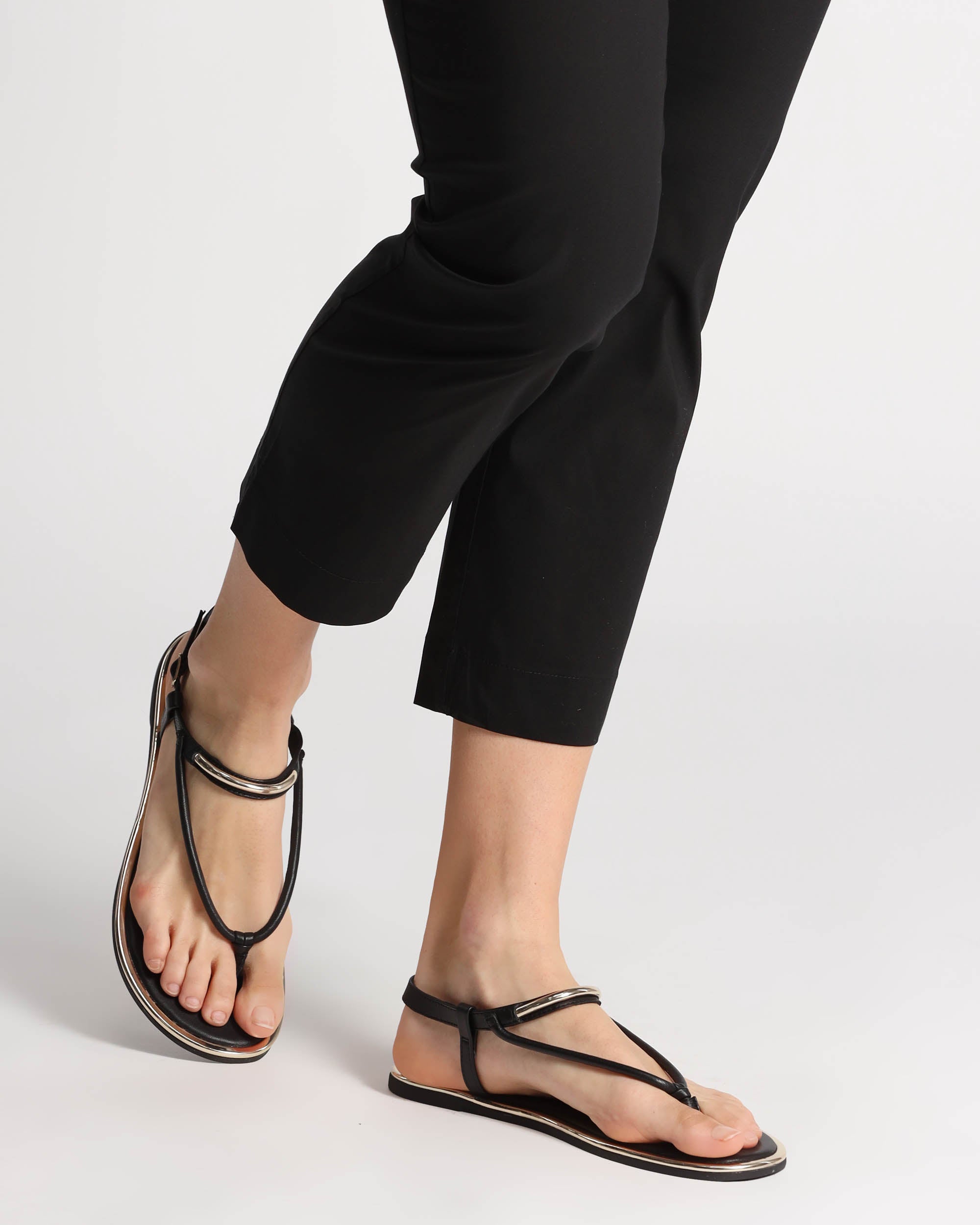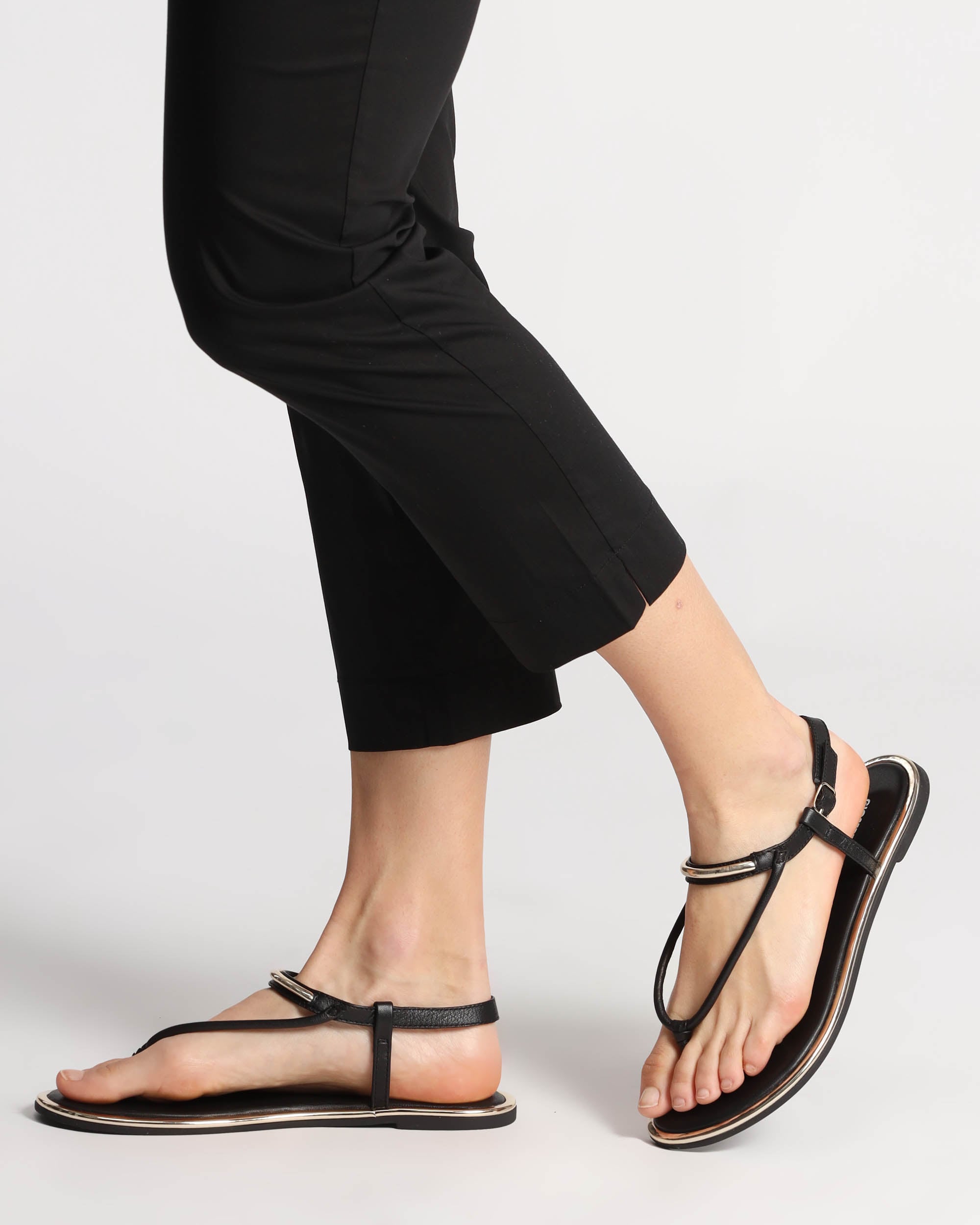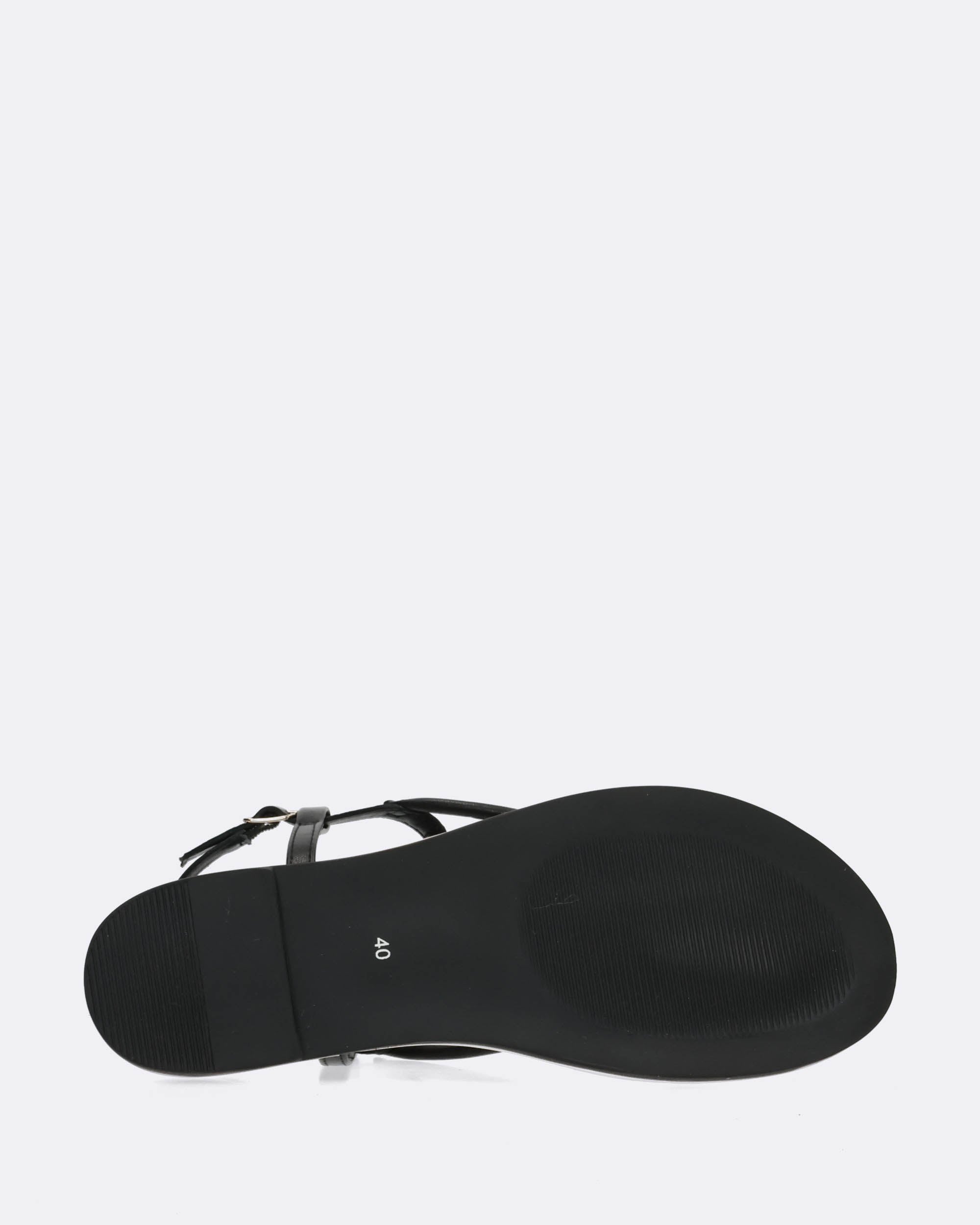 Sandali bassi neri in pelle, tacco 10mm, infradito, dettagli metallici dorati, suola flessibile in TPR, sottopiede in pelle imbottito, cinturino regolabile con fibbia, collezione donna Gioseppo Primavera estate 2025