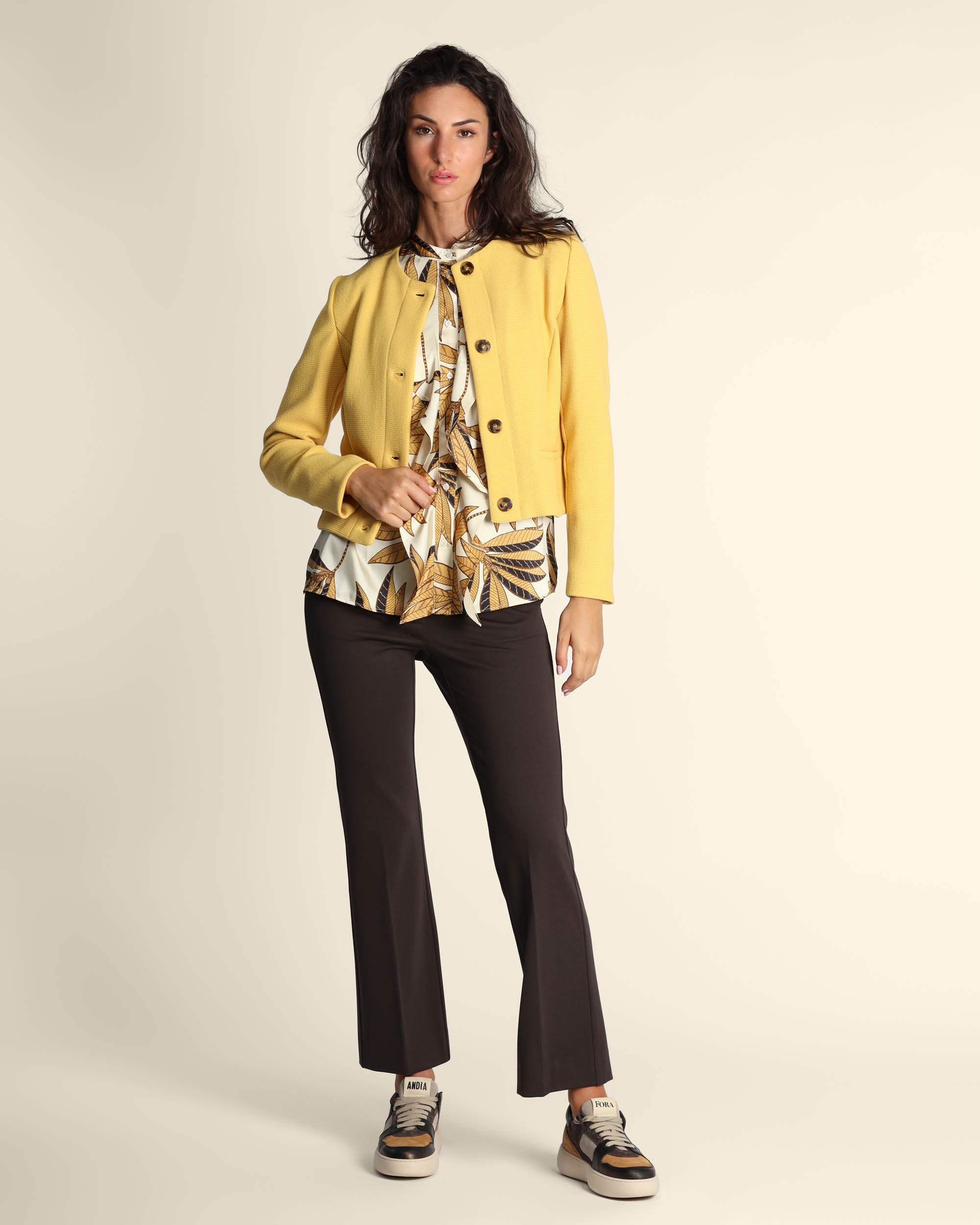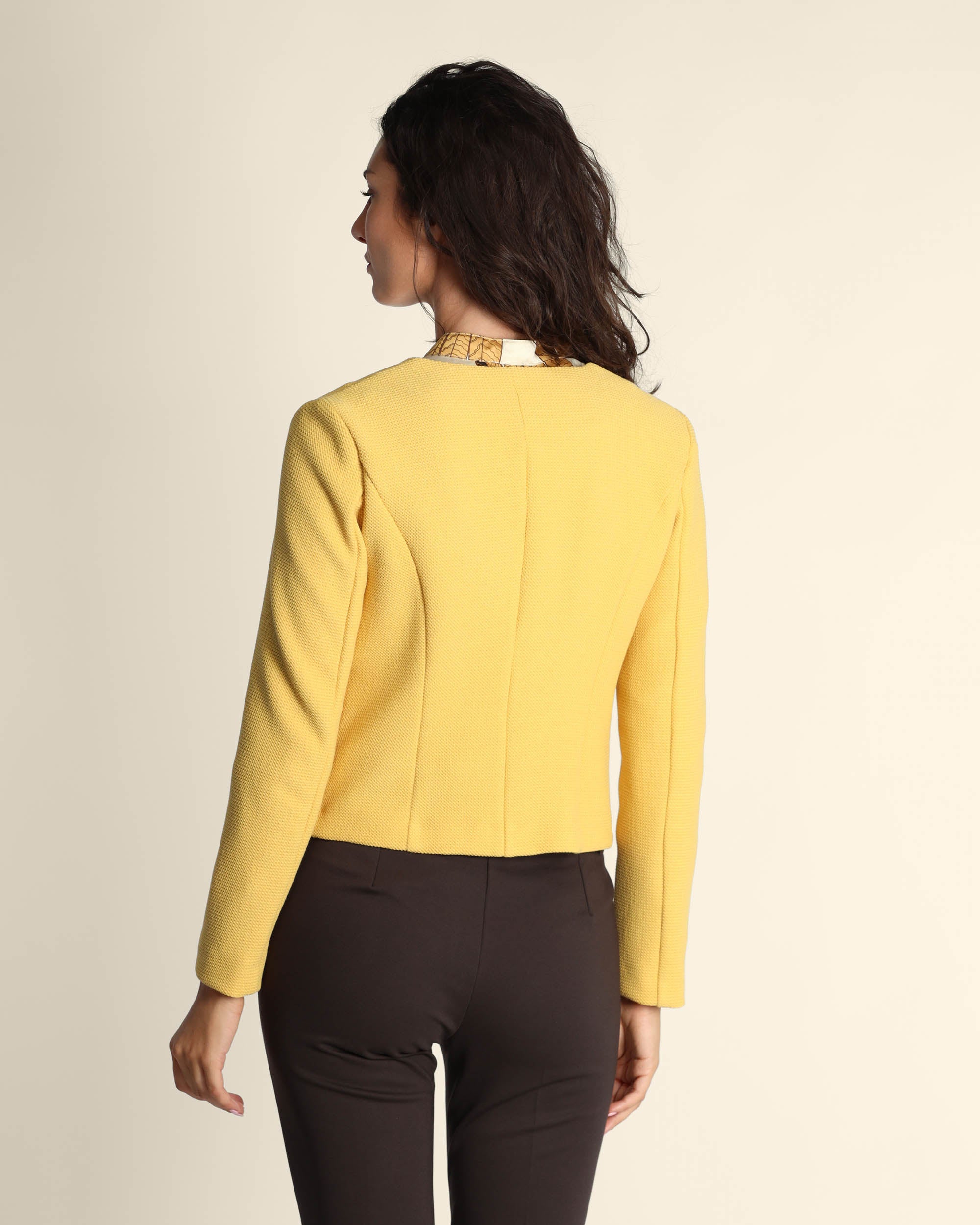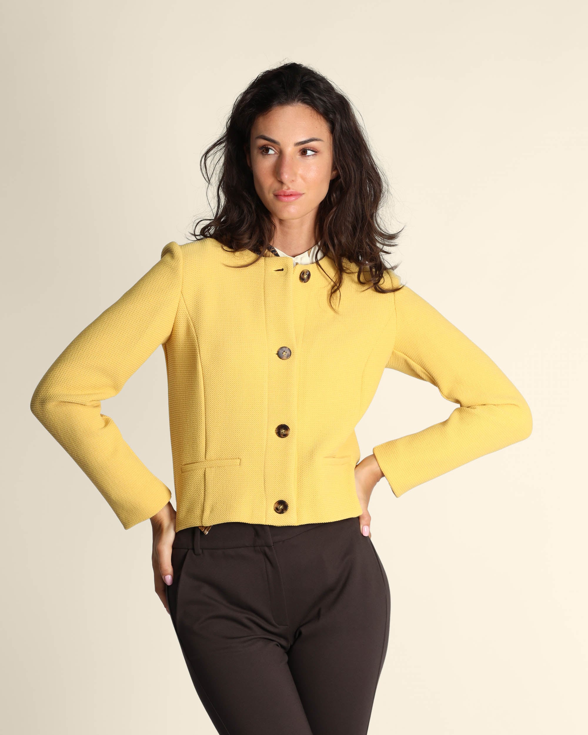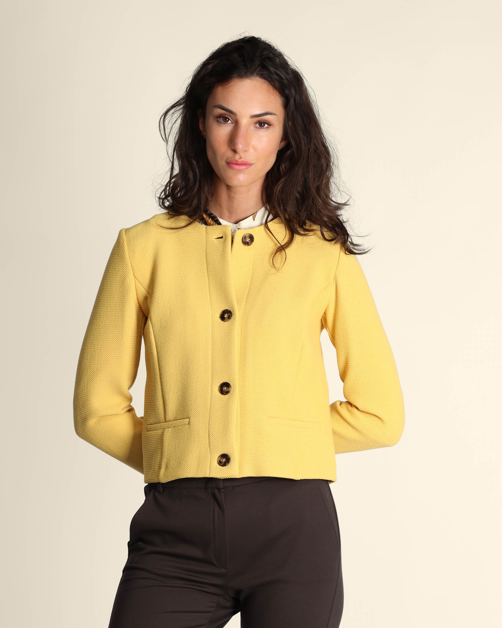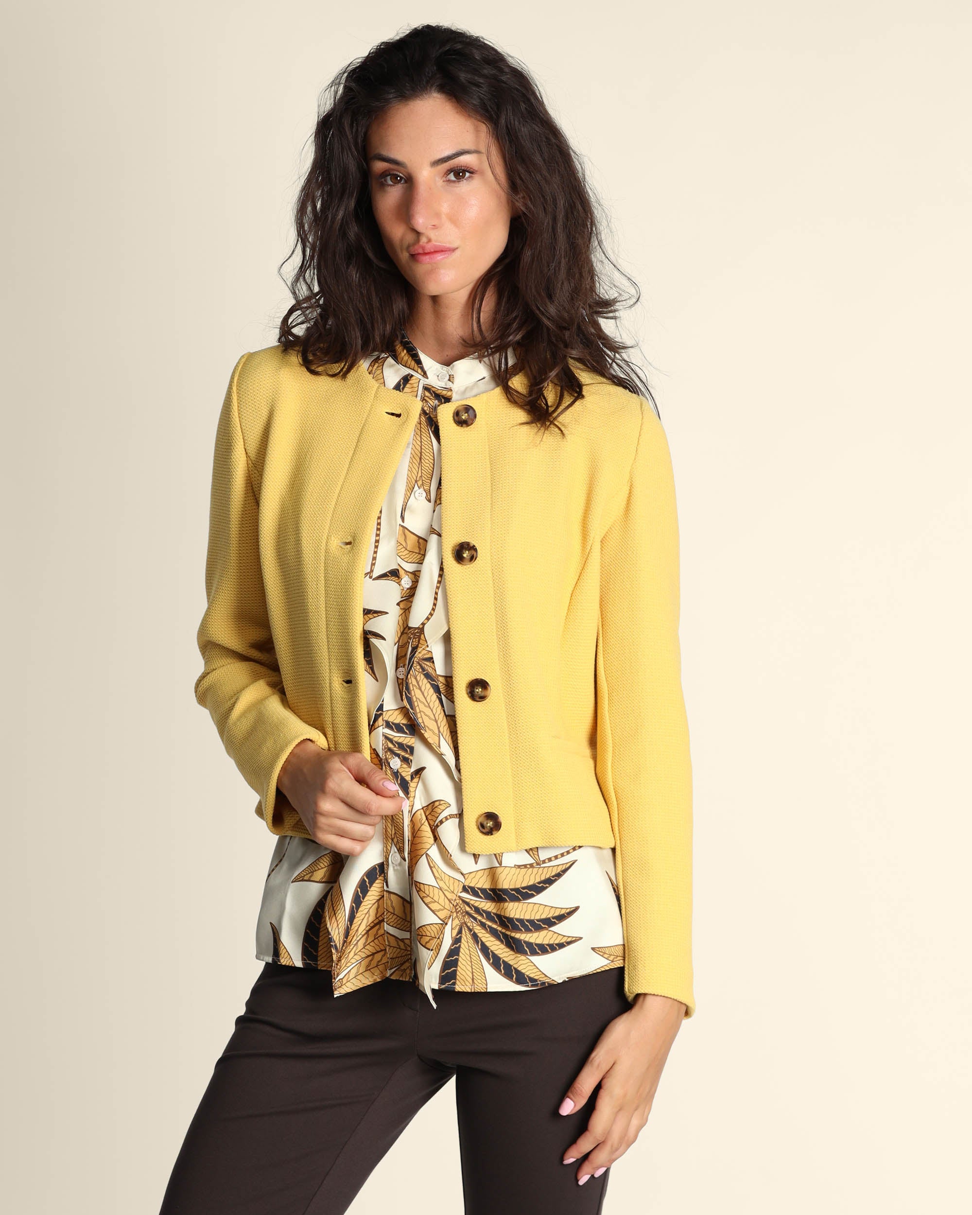 Giacca ocra in stuoia armaturata, scollo tondo, maniche lunghe, chiusura con bottoni, linea semiaderente, tasche a filetto, sfoderata, la modella indossa una tg.42, la modella ha le seguenti misure: altezza 178, seno 86,vita 65, fianchi 93, collezione donna Emme by Marella Autunno Inverno 2025/26
