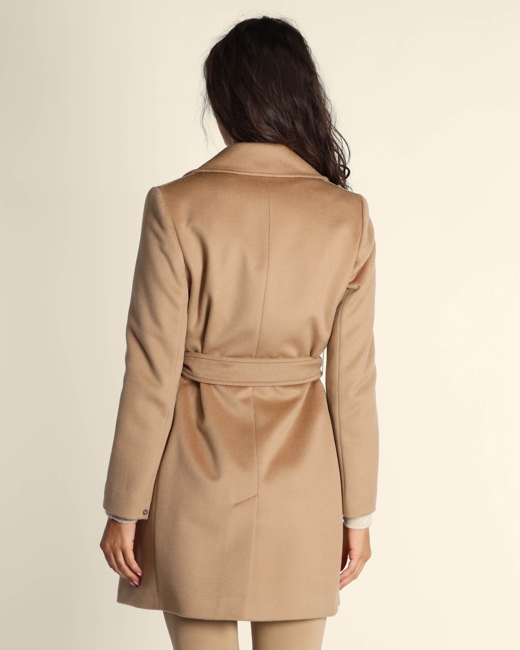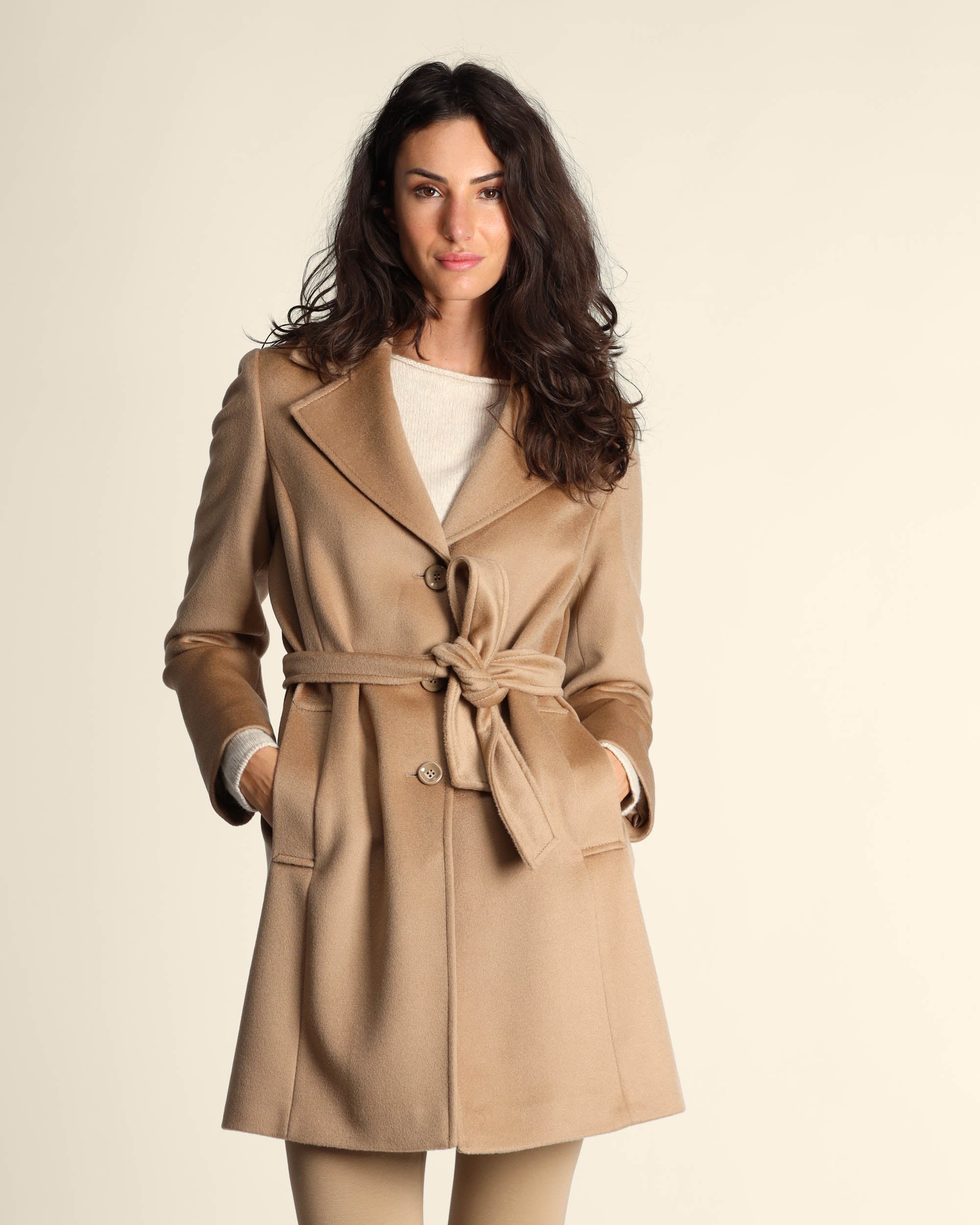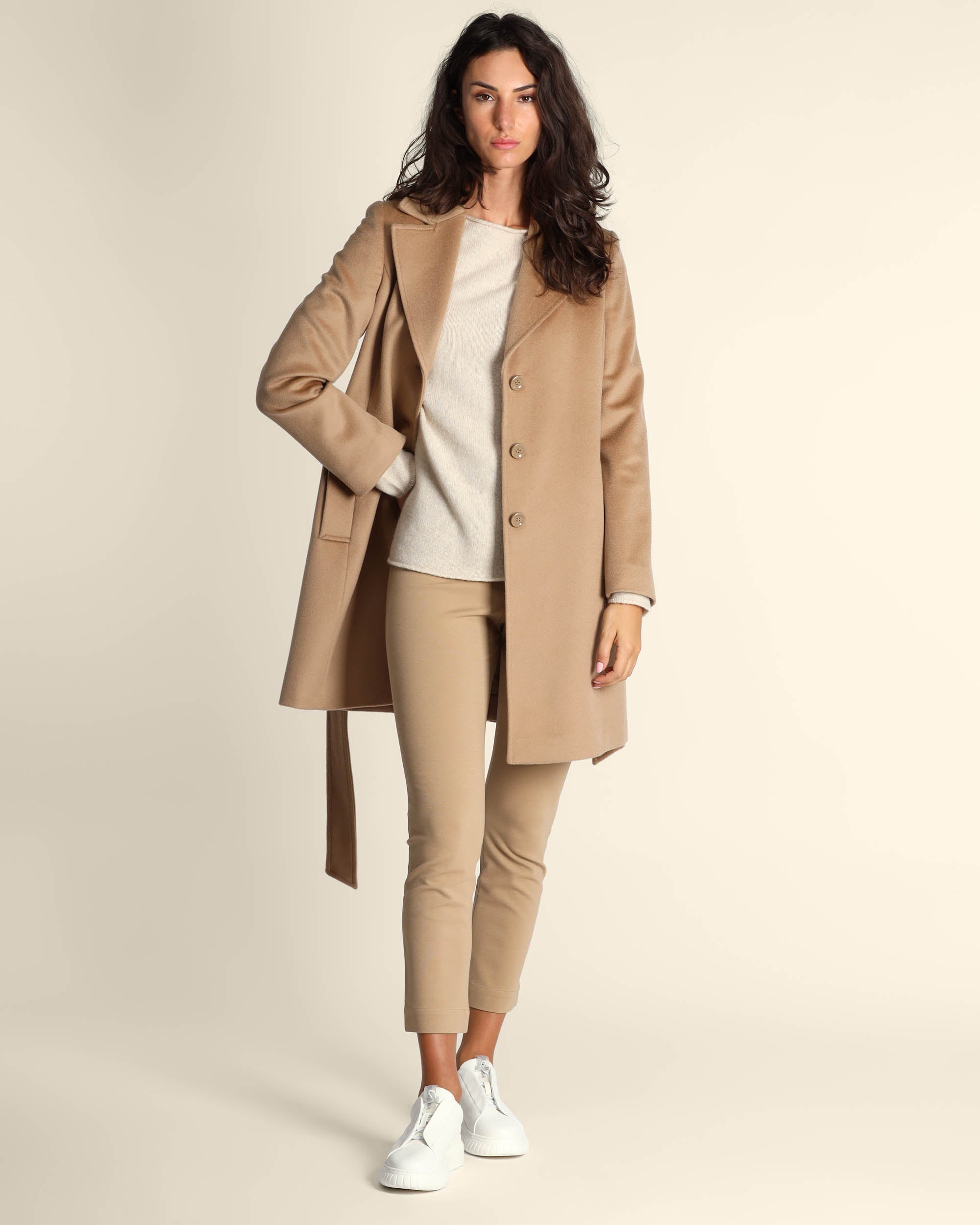 Cappotto color cammello in velour di lana, collo a rever, maniche lunghe, chiusura con bottoni, linea dritta, tasche a filetto, cintura coordinata, foderato, la modella indossa una tg.42, la modella ha le seguenti misure: altezza 178, seno 86,vita 65, fianchi 93, collezione donna Pennyblack Autunno Inverno 2025