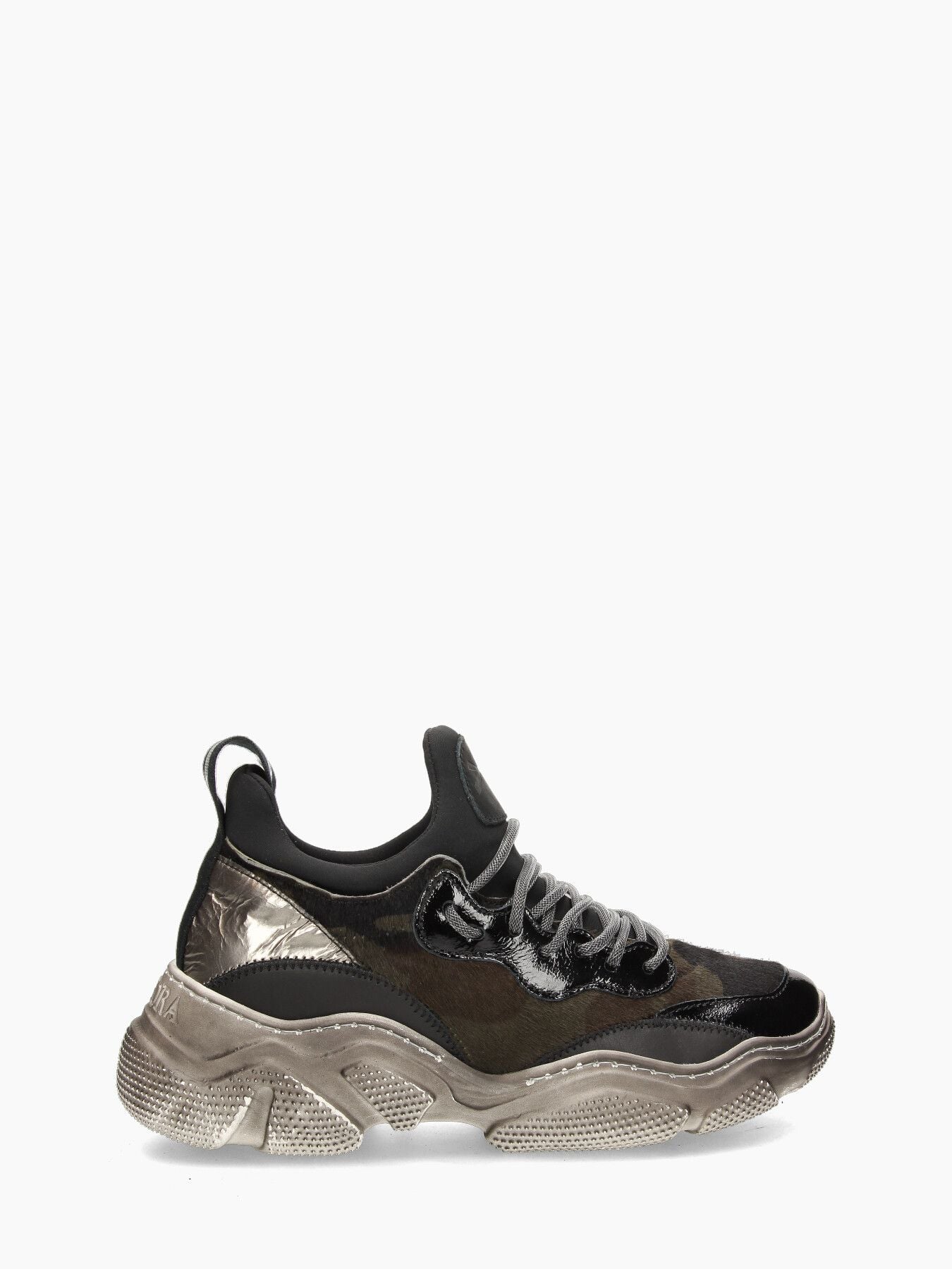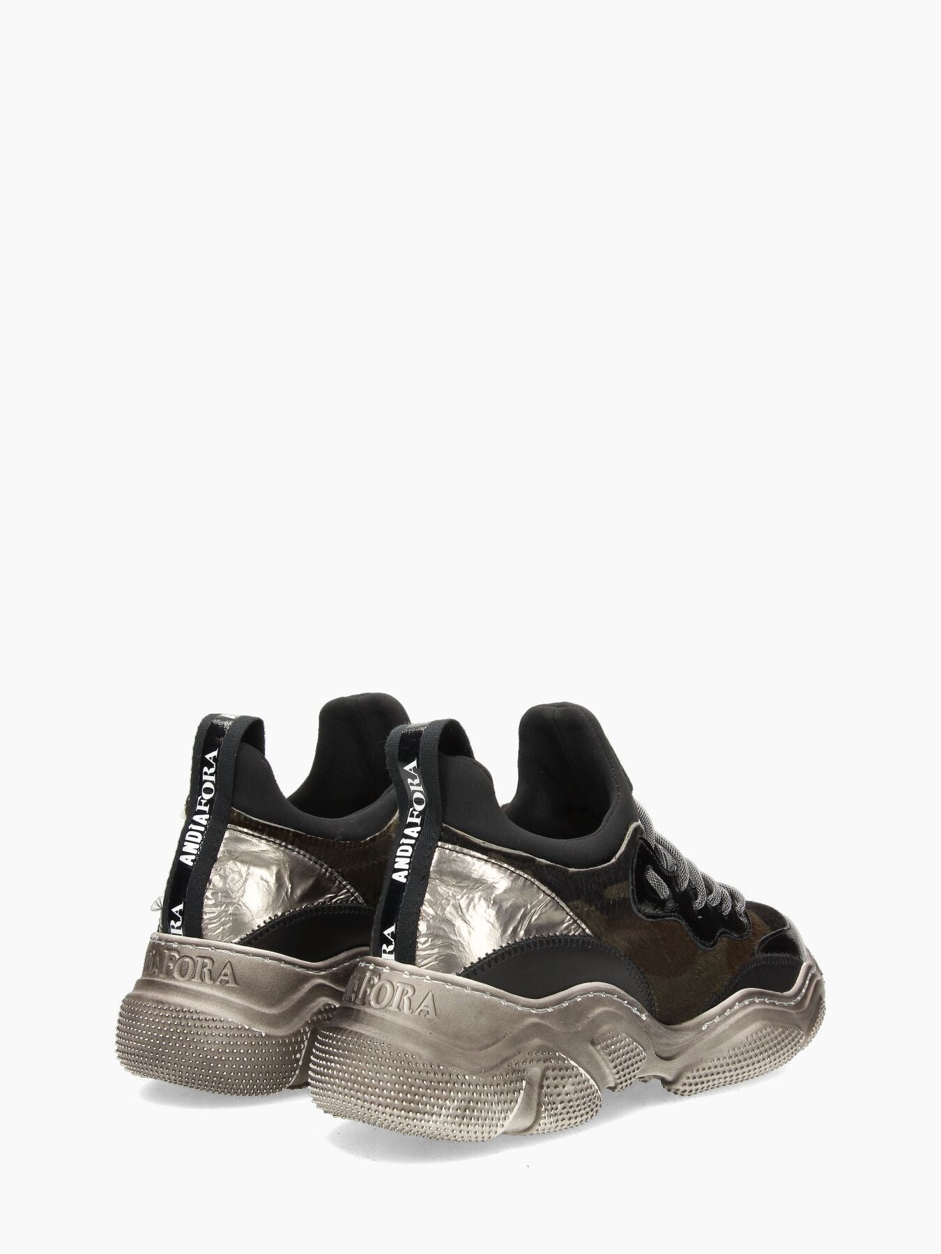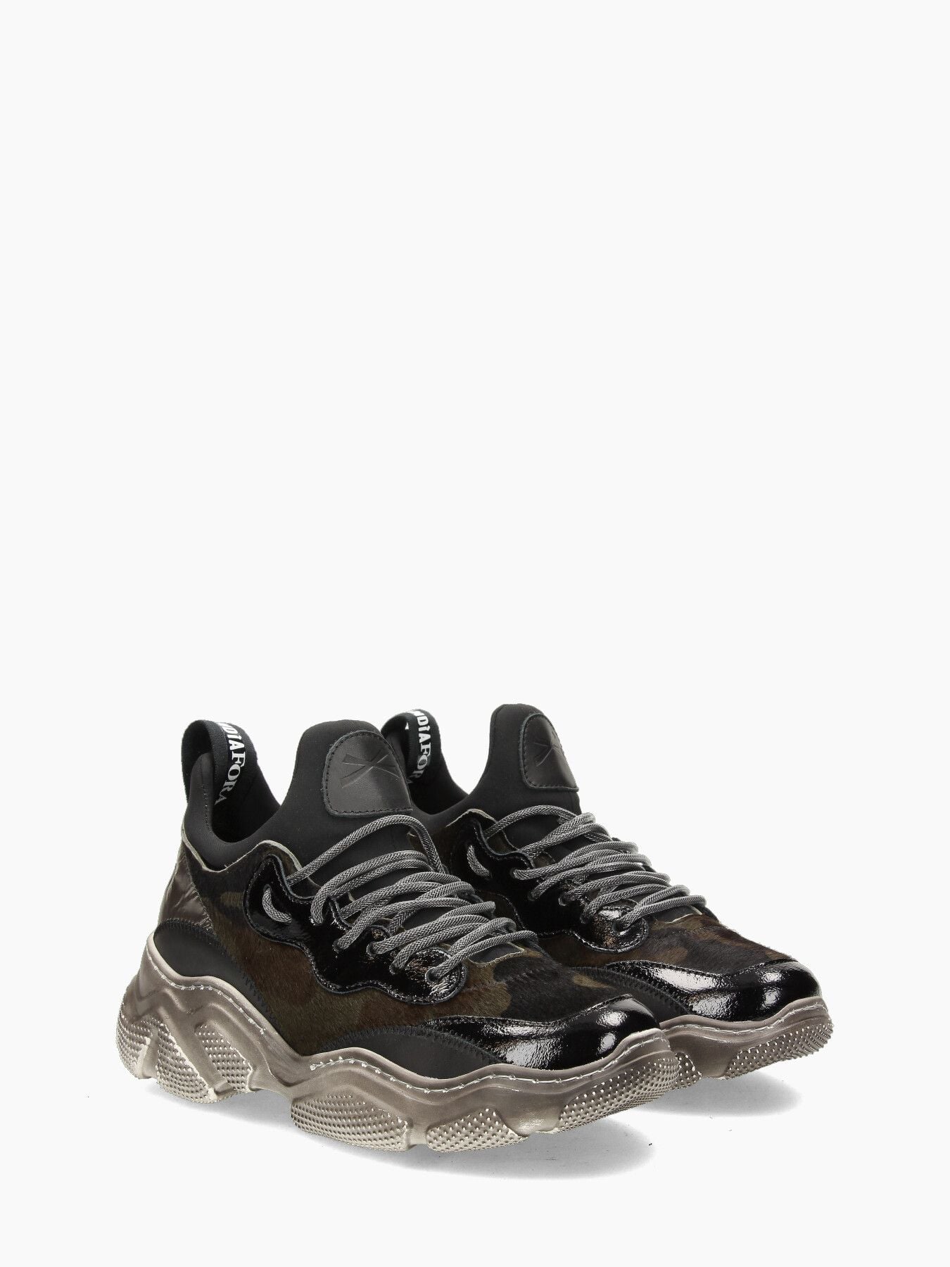 Sneakers in pelle camouflage, vernice nera, pelle laminata e tessuto tecnico nero, chiusura con lacci grigi laminati, fodera in pelle e tessuto, suola in gomma ultralight 40mm, punta tonda, sottopiede in pelle estraibile, tirante posteriore con logo, lavorazione artigianale, made in Italy, collezione donna Andiafora Autunno Inverno 2020/2021
