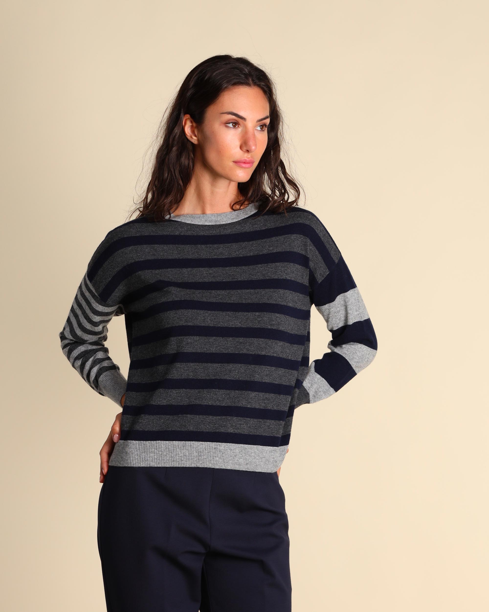 Maglia grigia e blu a righe in lana e cashmere, scollo tondo, maniche lunghe con polsino doppiato, giro sceso, linea morbida, spacchi laterali, la modella indossa una tg.42, la modella ha le seguenti misure: altezza 179, seno 84, vita 63, fianchi 94, collezione donna Quilisia Autunno Inverno 2025/26