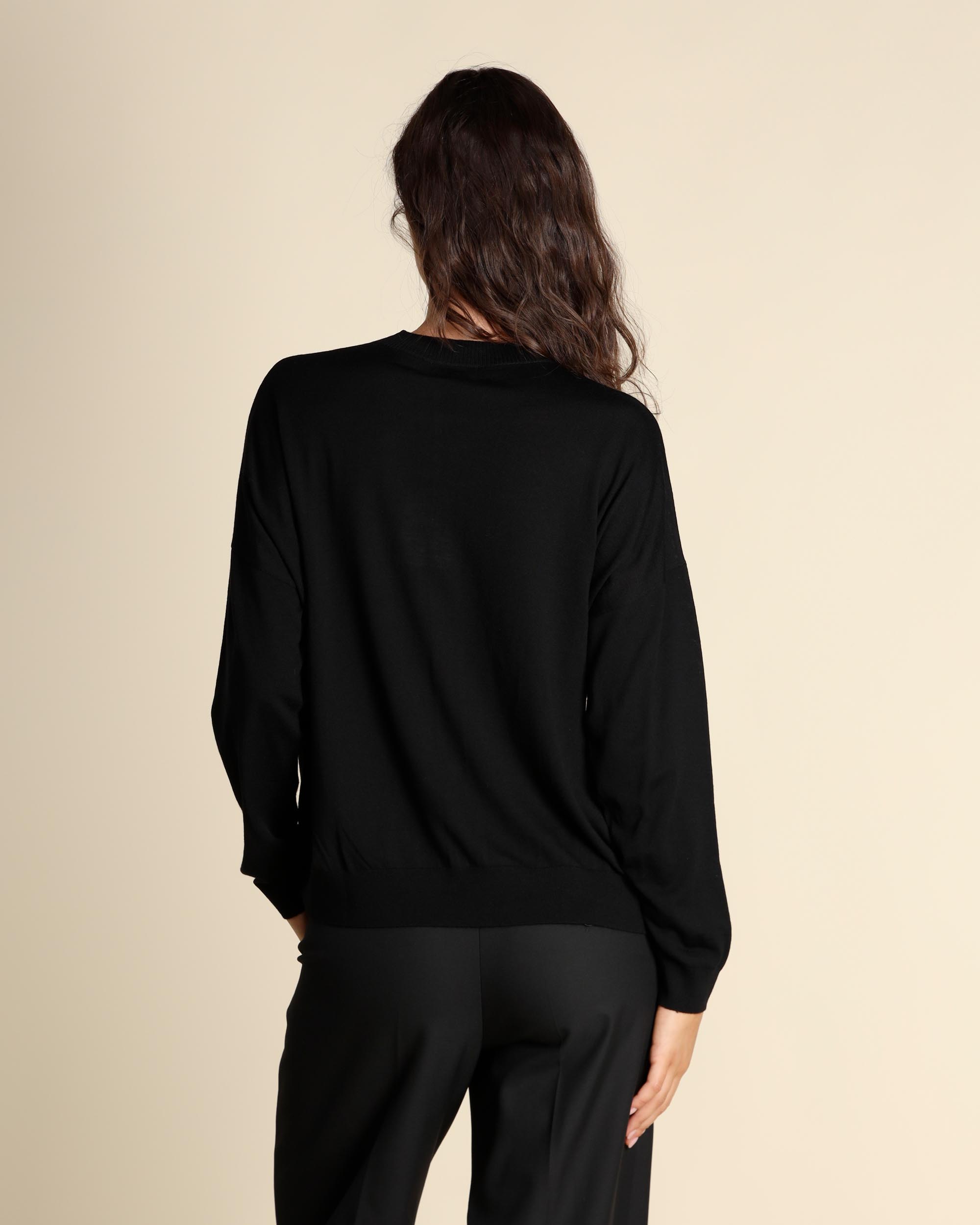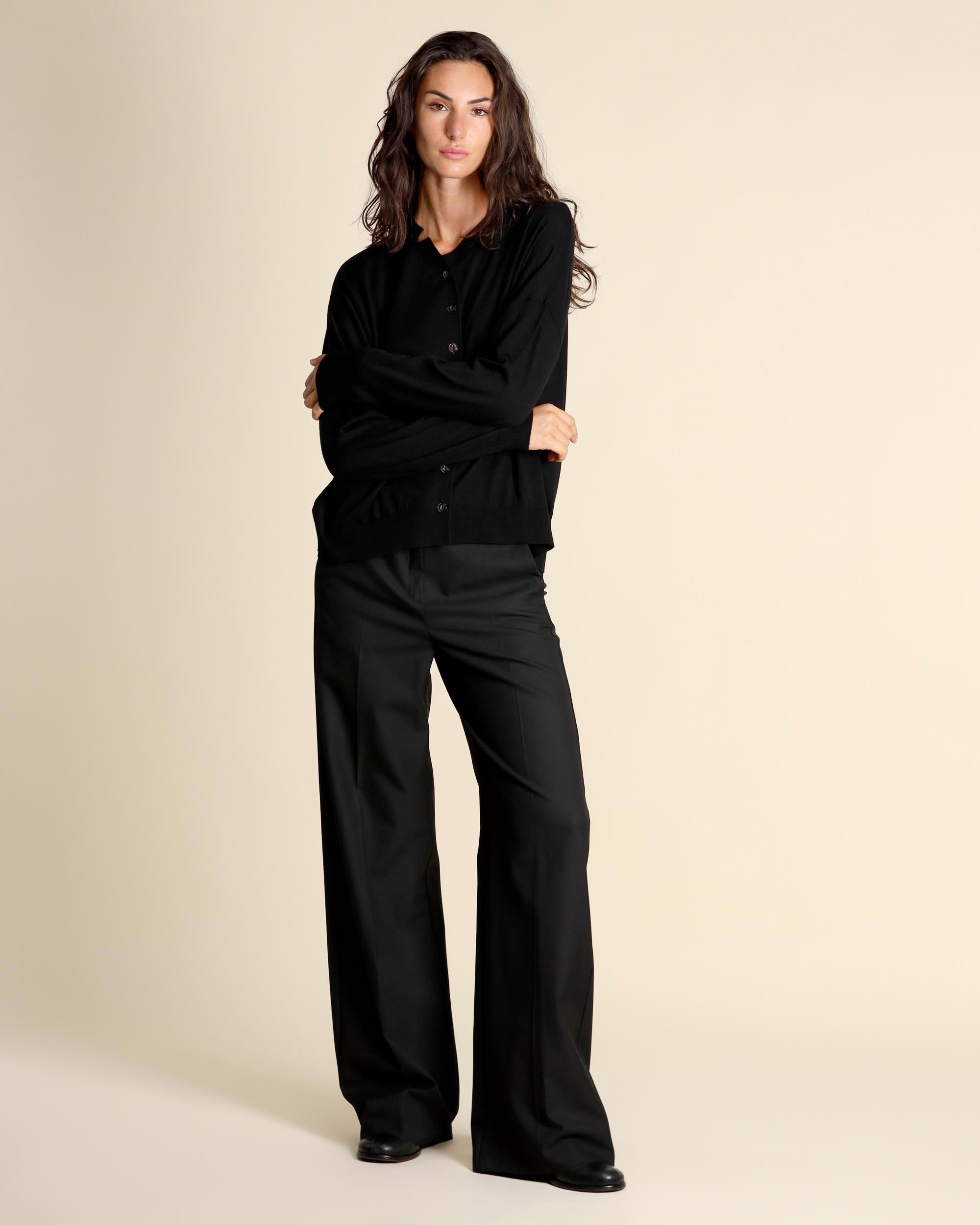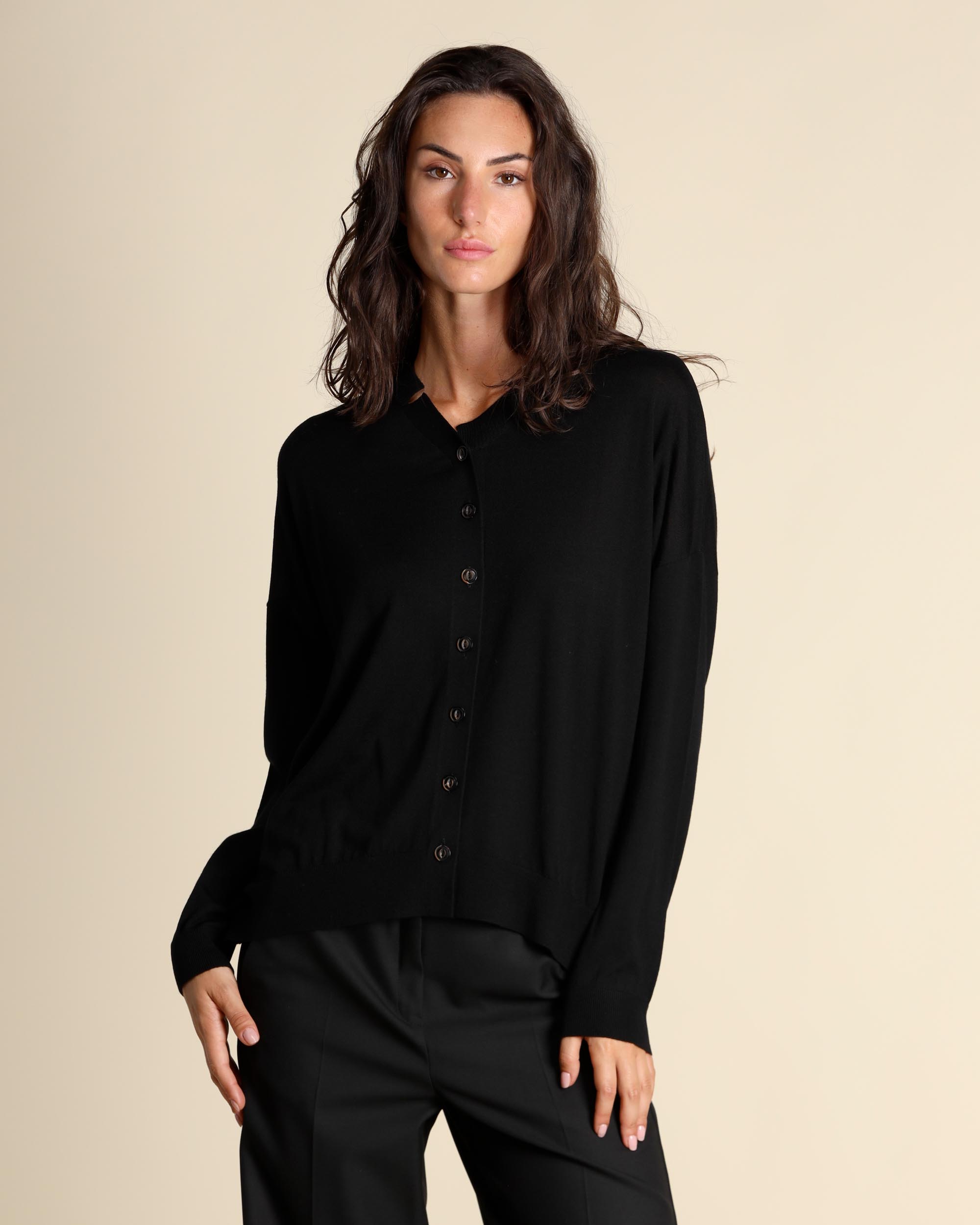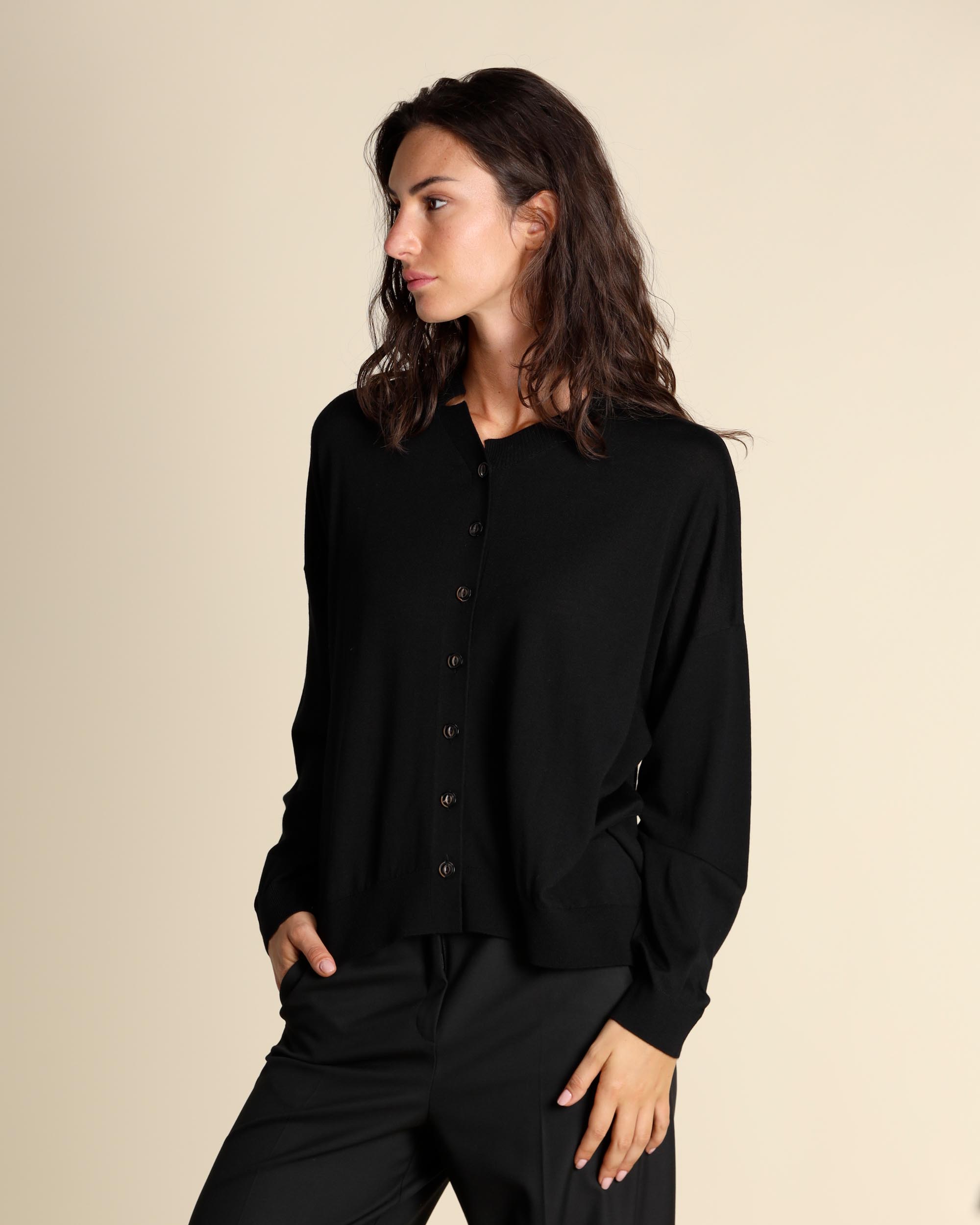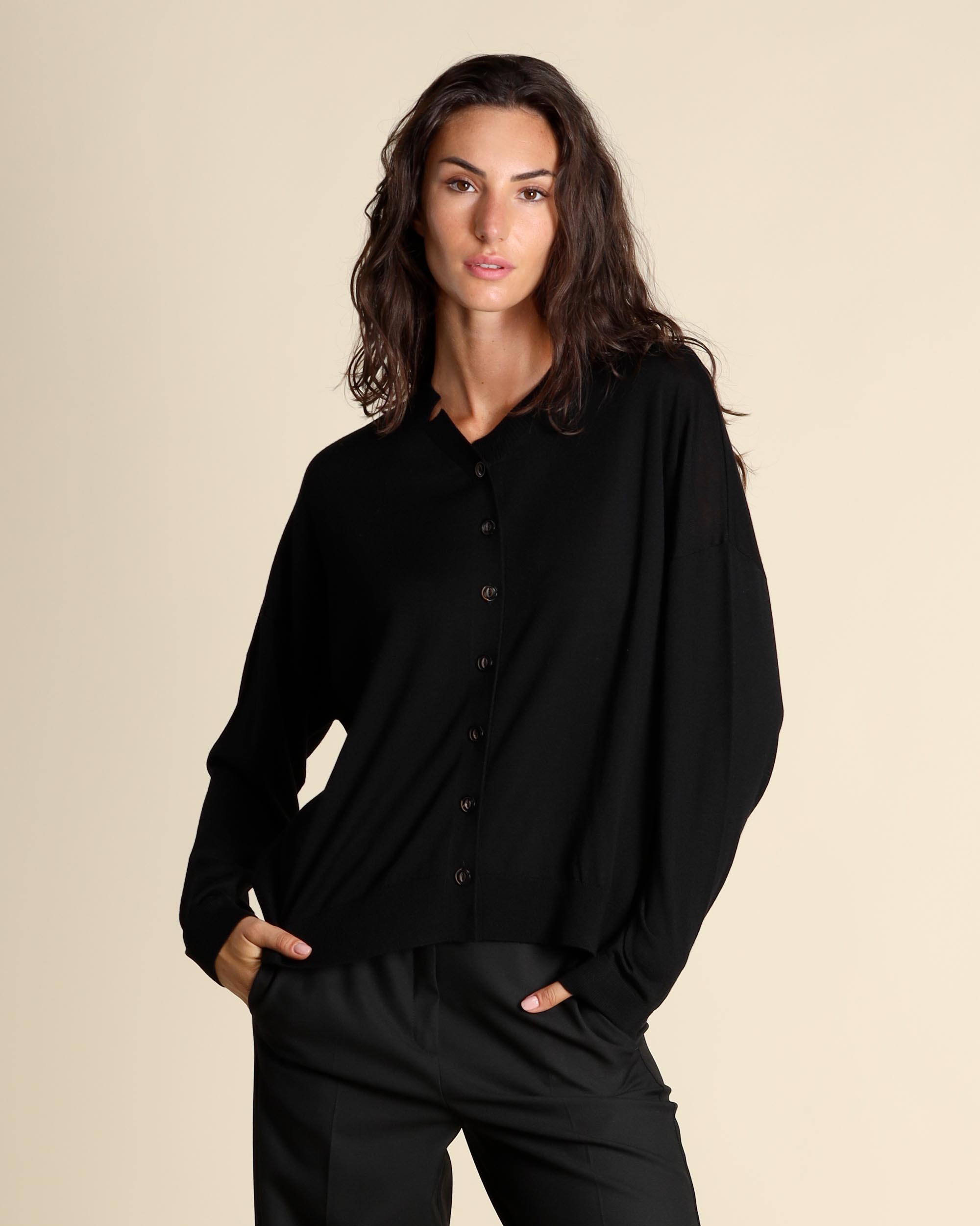 Cardigan blu in lana merinos extrafine, maniche lunghe con polsino, giro sceso, linea ampia, chiusura con bottoni, scollo asimmetrico, la modella indossa una tg.42, la modella ha le seguenti misure: altezza 177, seno 84, vita 63, fianchi 94, collezione donna Quilisia Autunno Inverno 2025/26