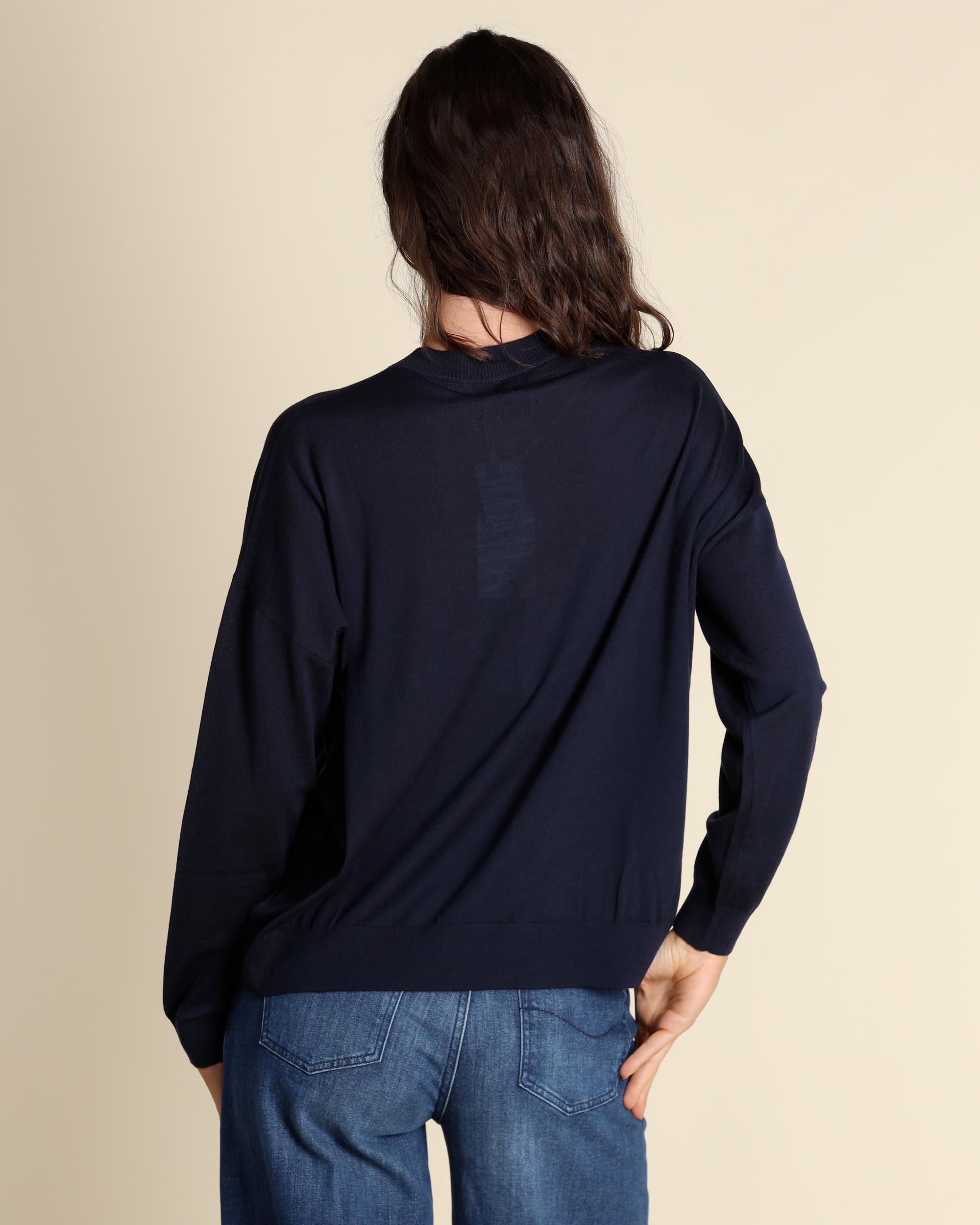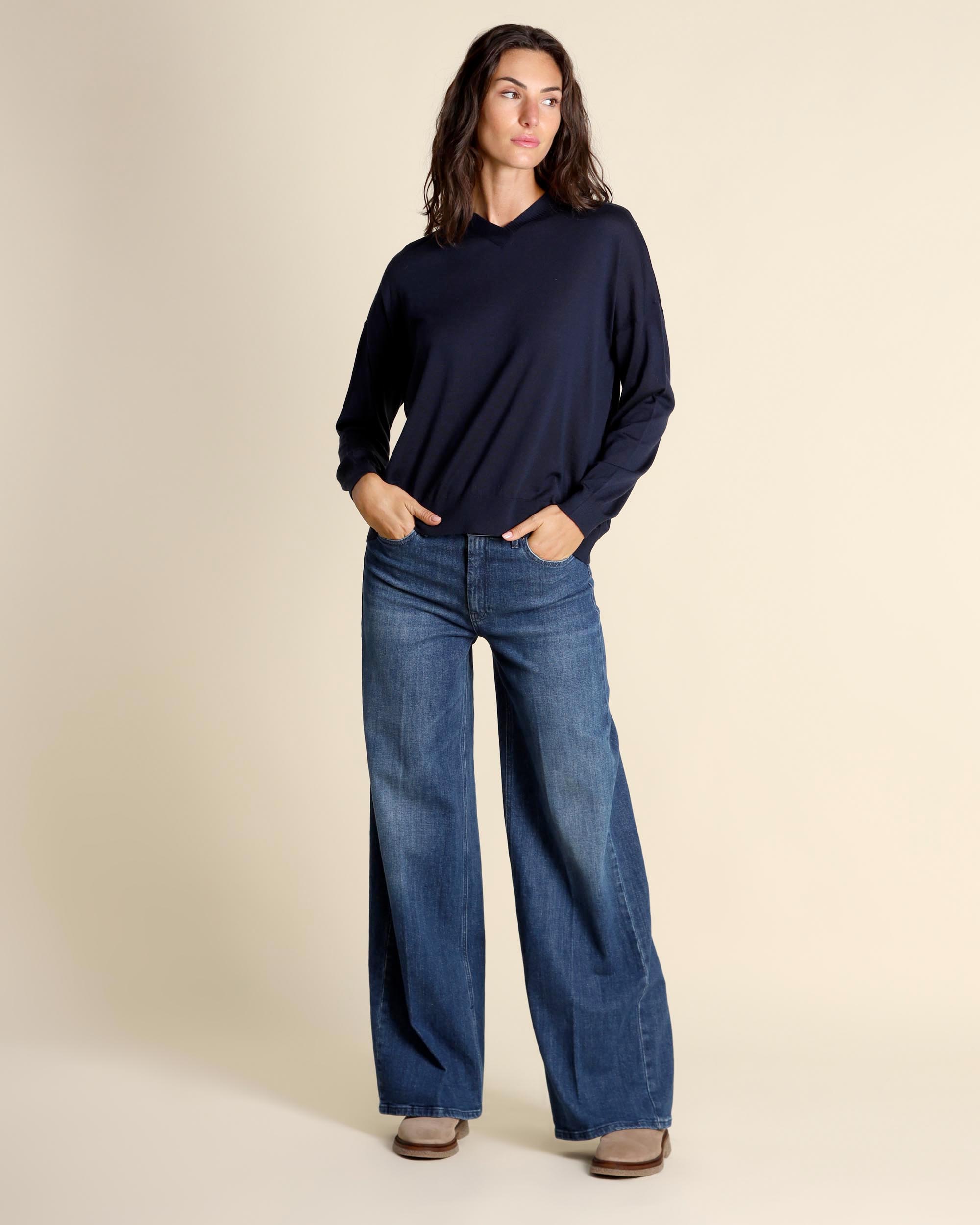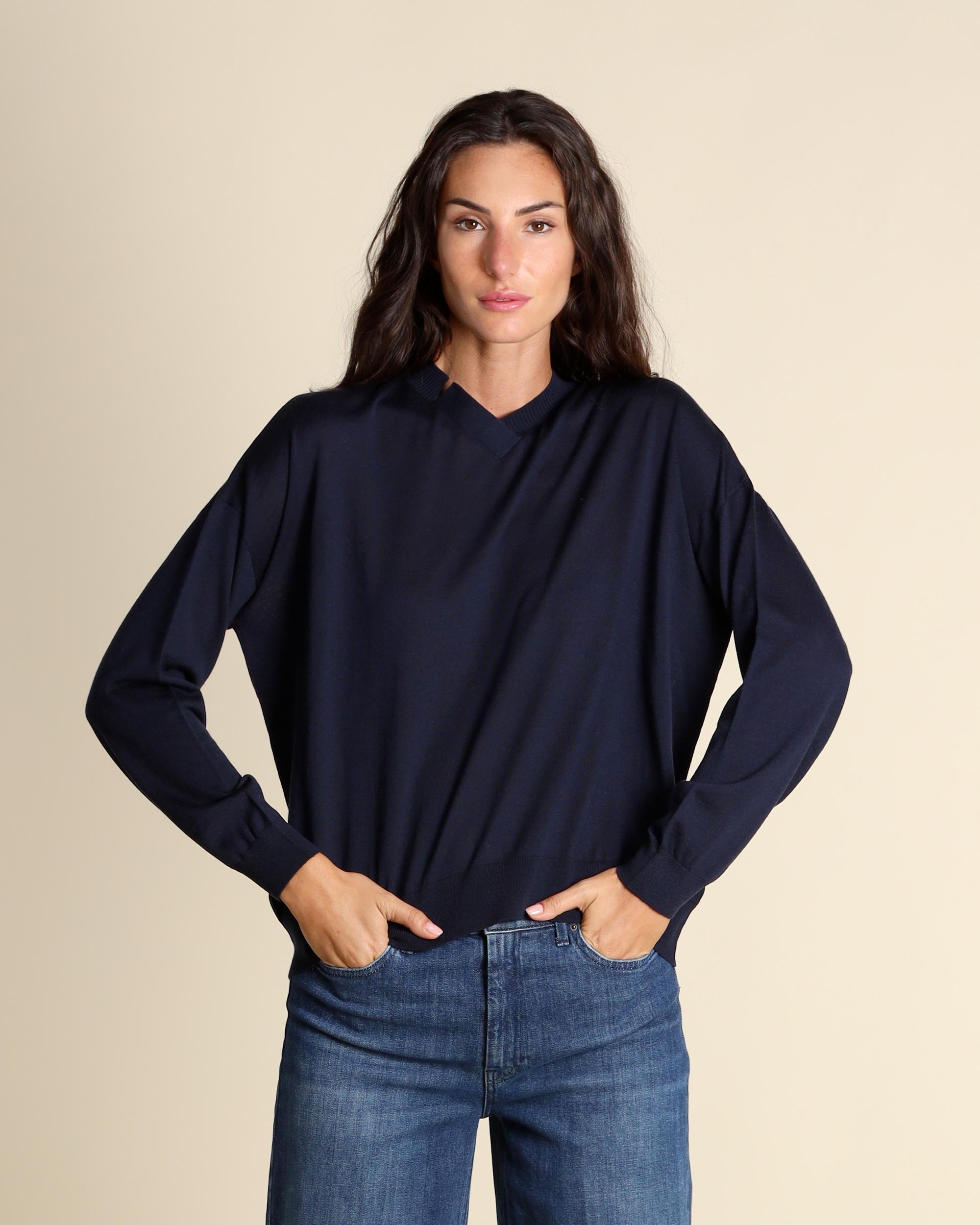 Maglia blu in lana merinos extrafine, scollo a V, maniche lunghe con polsino, giro sceso, linea morbida, la modella indossa una tg.42, la modella ha le seguenti misure: altezza 179, seno 84, vita 63, fianchi 94, collezione donna Quilisia Autunno Inverno 2025/26