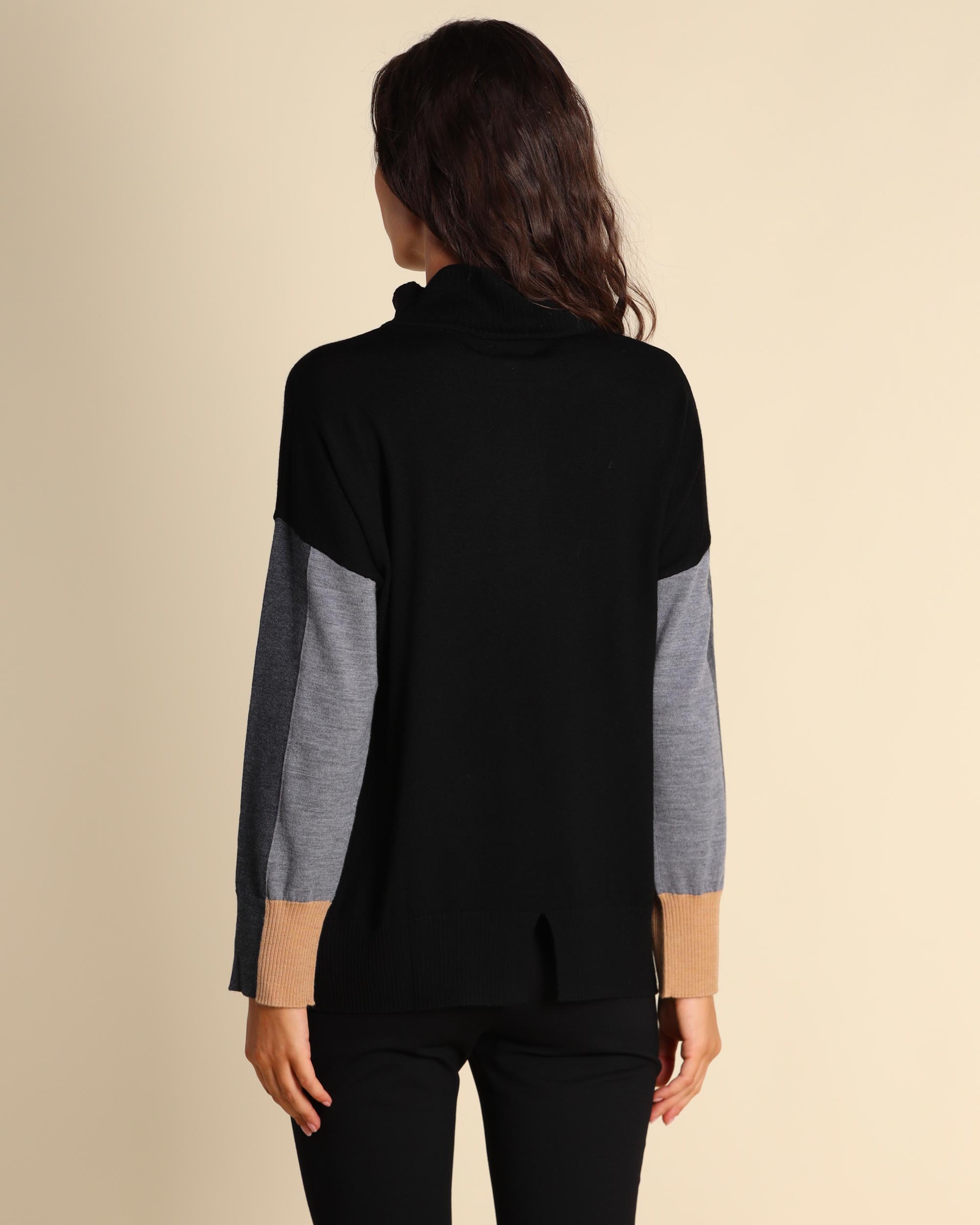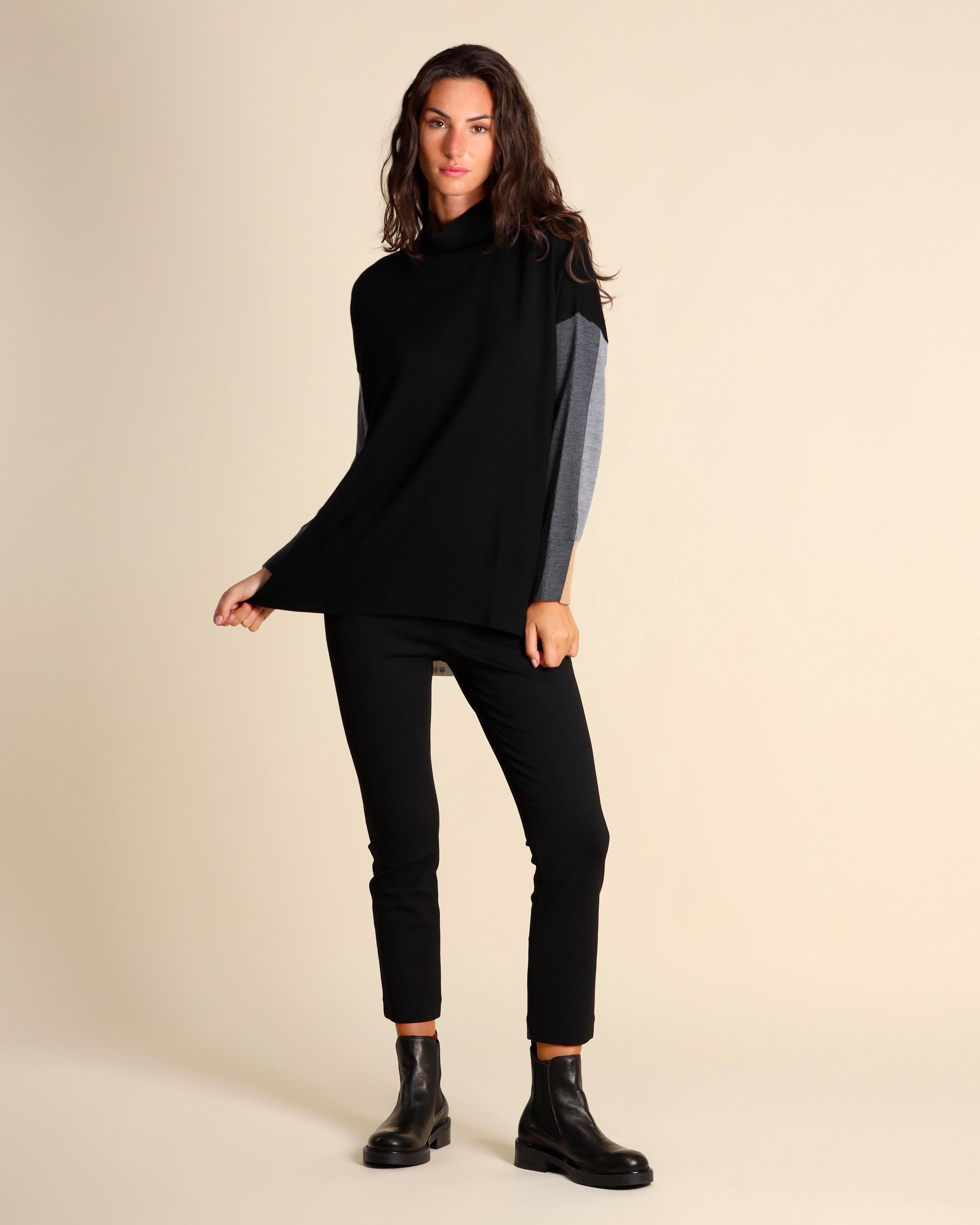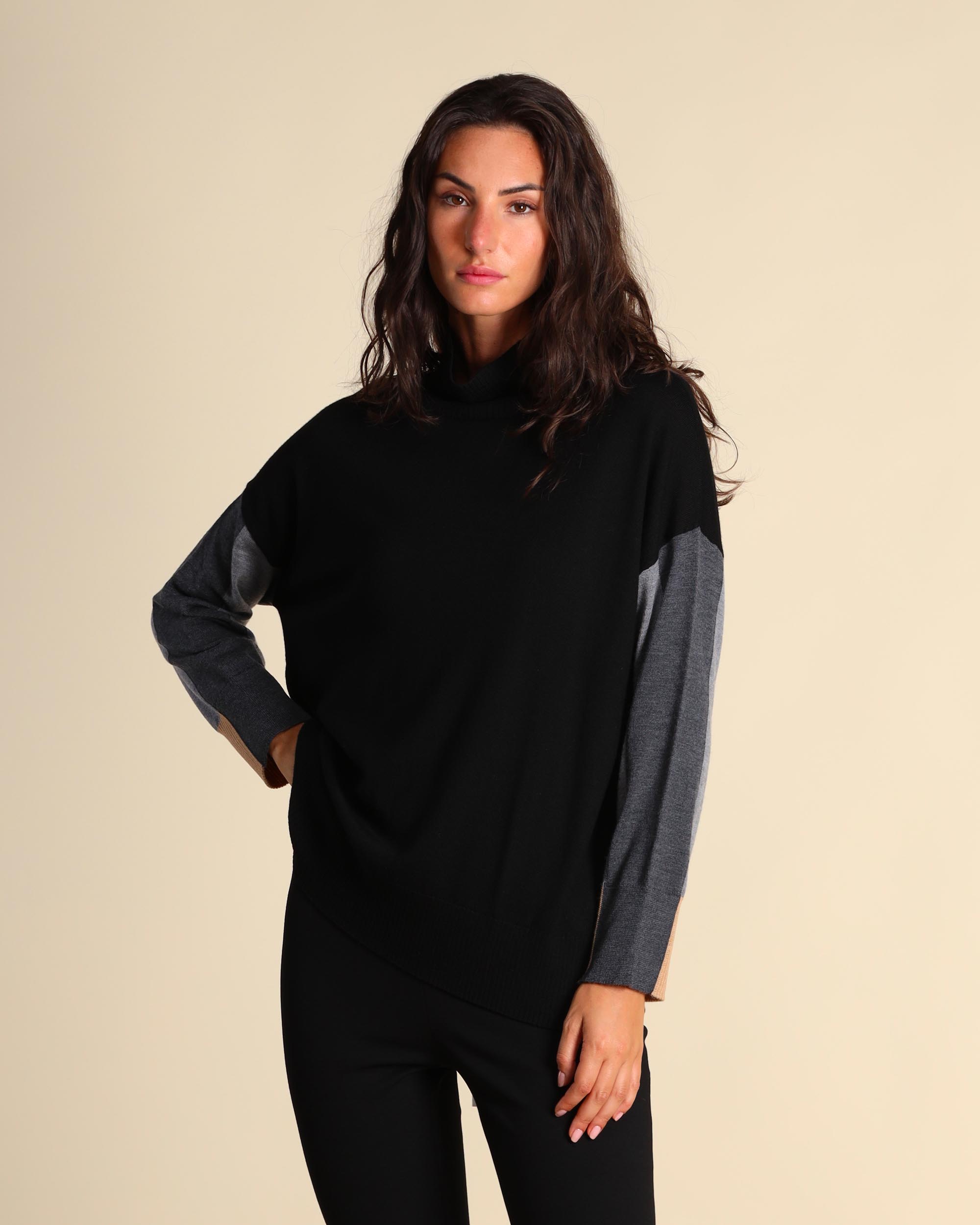 Maglia nera e grigia in lana merinos extrafine, maniche lunghe con polsino, giro sceso, collo alto, linea ampia, la modella indossa una tg.42, la modella ha le seguenti misure: altezza 179, seno 84, vita 63, fianchi 94, collezione donna Quilisia Autunno Inverno 2025/26