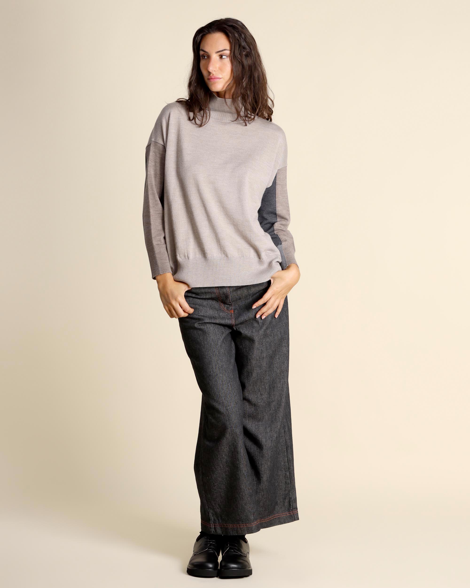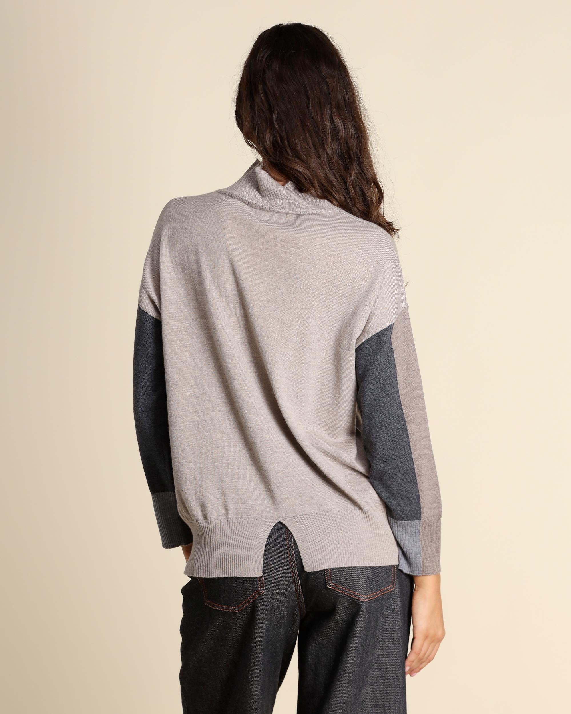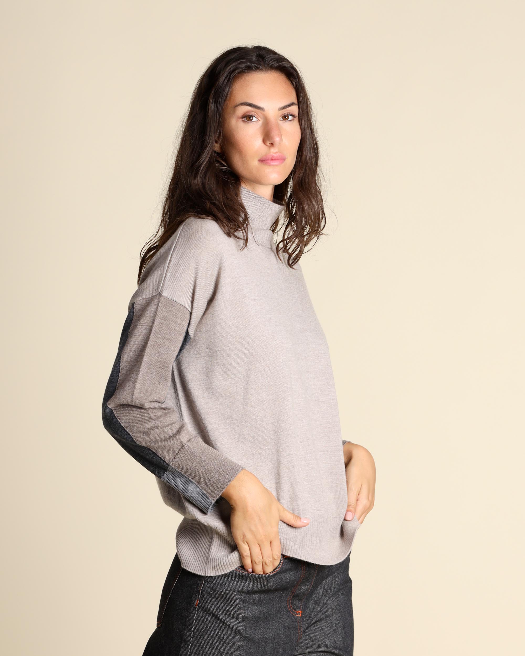 Maglia tortora e grigia in lana merinos extrafine, maniche lunghe con polsino, giro sceso, collo alto, linea ampia, la modella indossa una tg.42, la modella ha le seguenti misure: altezza 179, seno 84, vita 63, fianchi 94, collezione donna Quilisia Autunno Inverno 2025/26