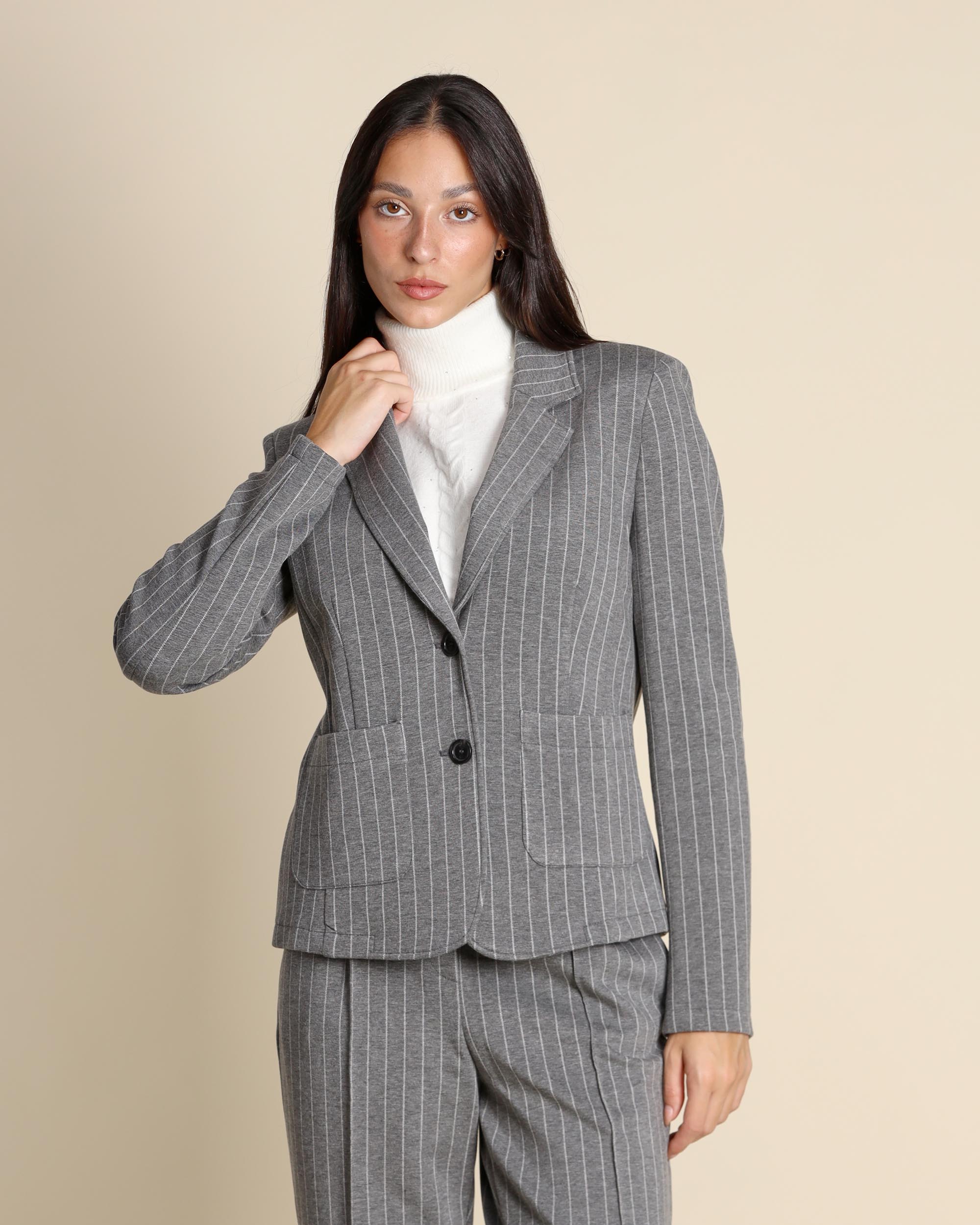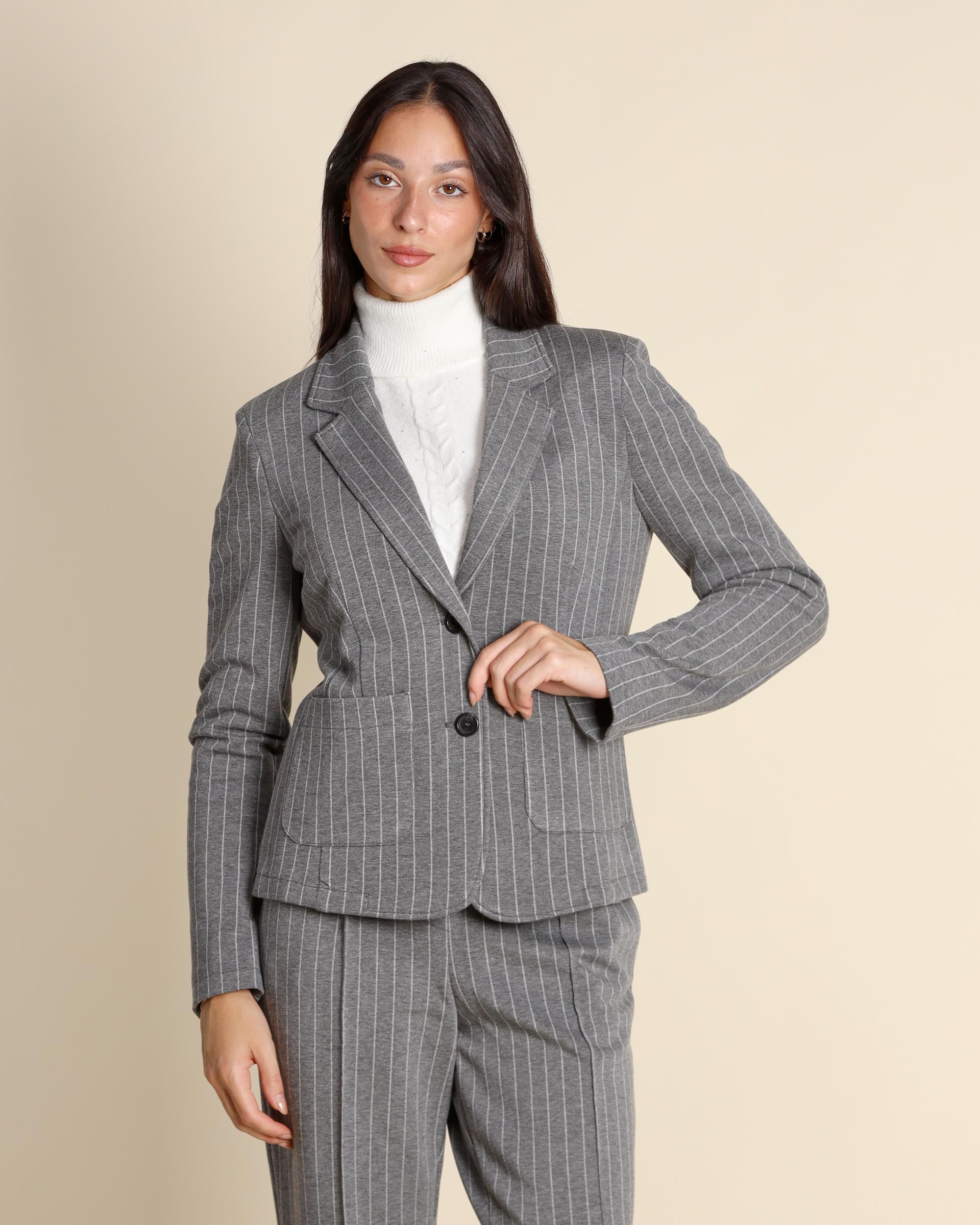 Giacca gessata grigia in jersey di misto viscosa stretch, collo a revers, maniche lunghe, chiusura con bottoni, linea dritta, tasche applicate, sfoderata, la modella indossa una tg.42, la modella ha le seguenti misure: altezza 173, seno 86,vita 65, fianchi 93, collezione donna Pennyblack Autunno Inverno 2025/26