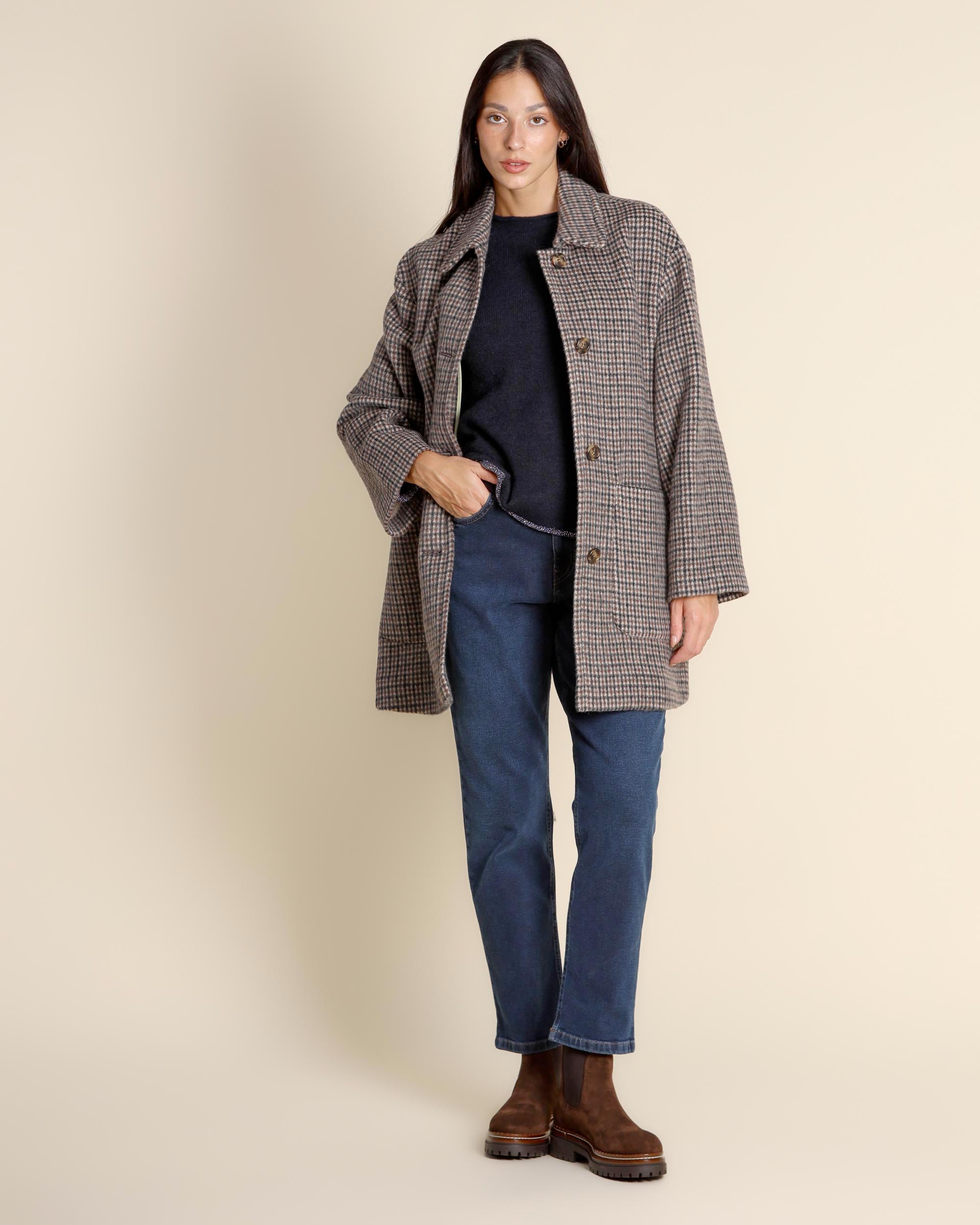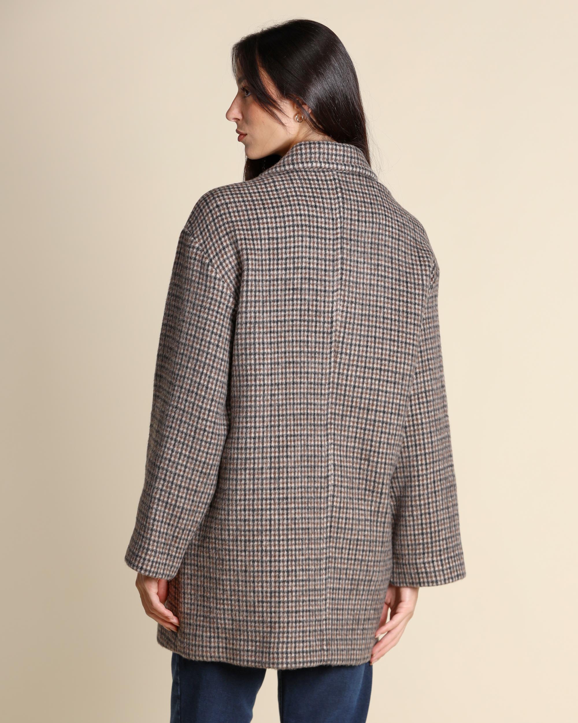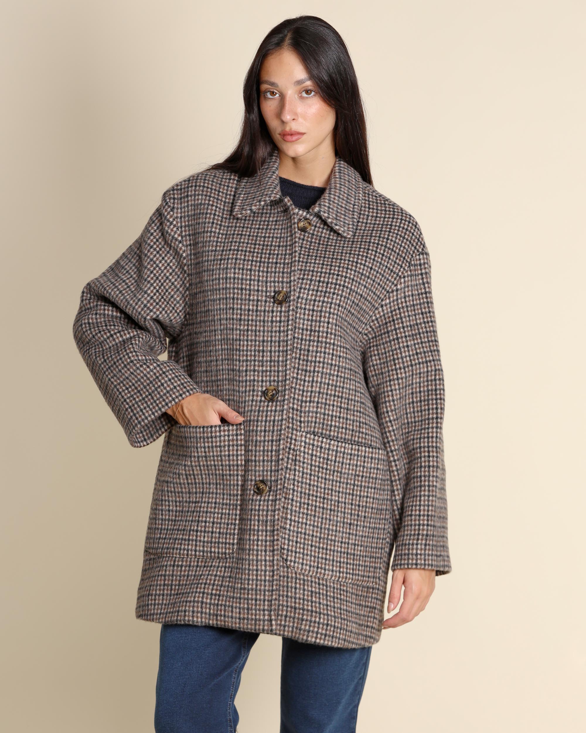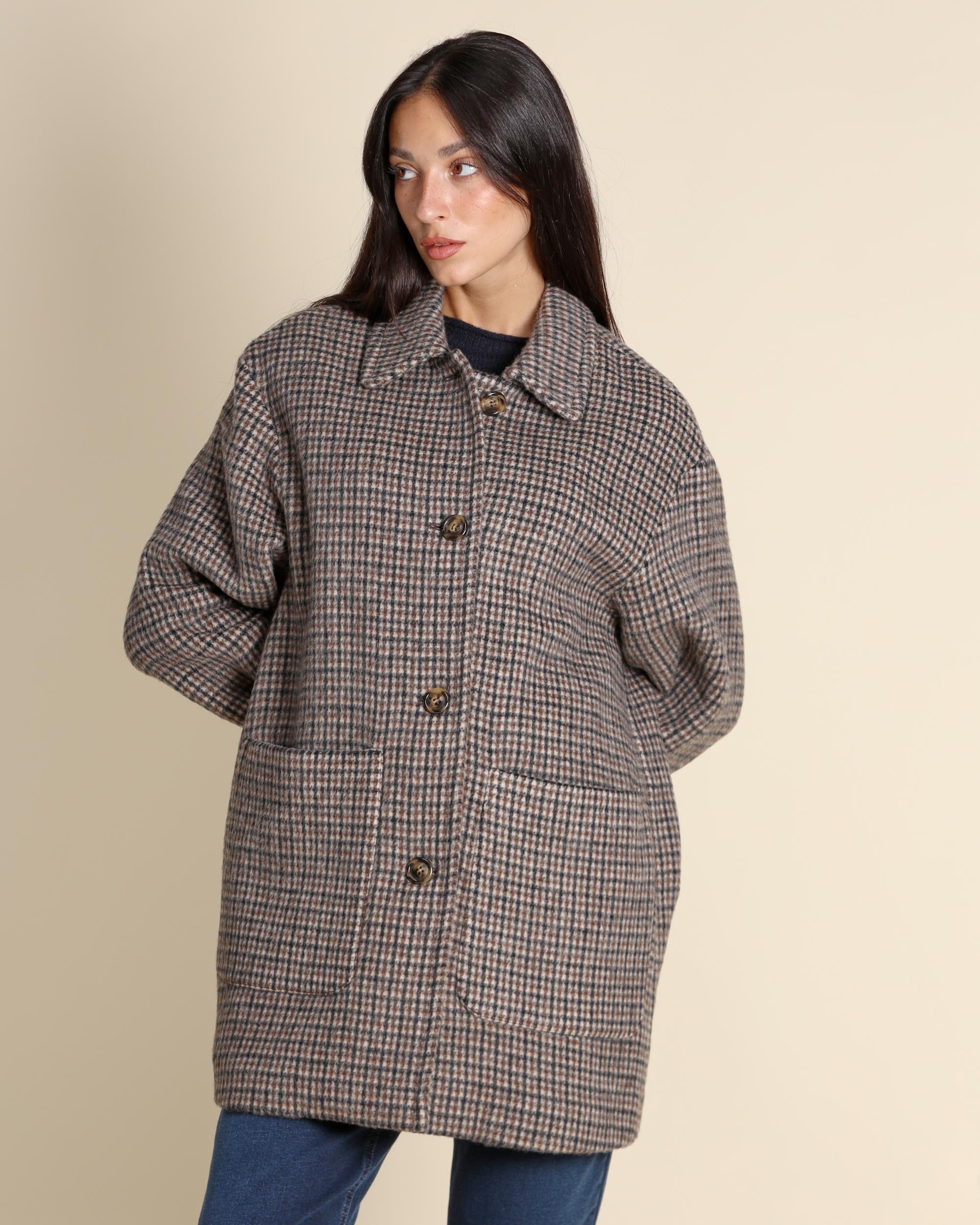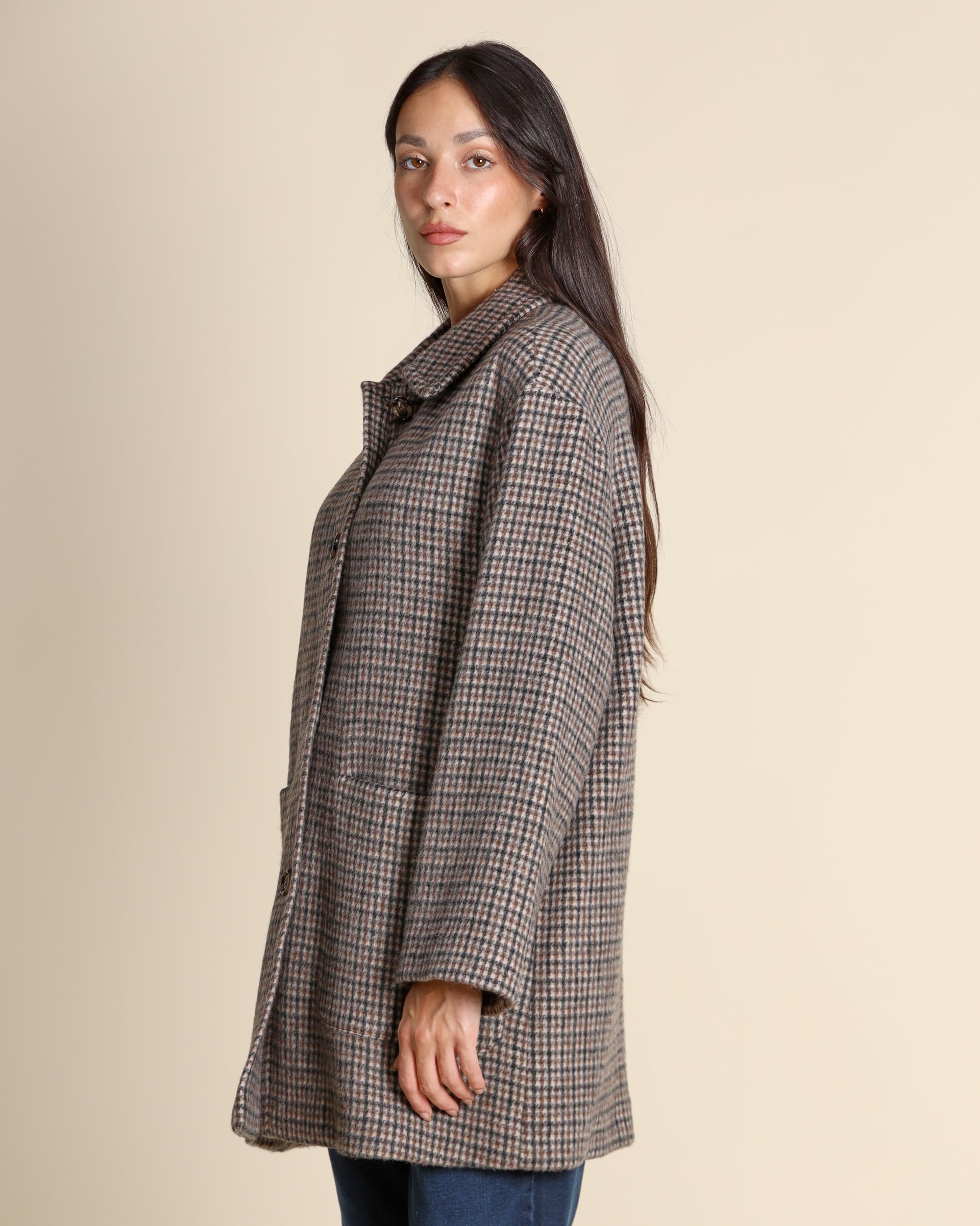 Giaccone check in misto lana stretch testa moro, collo a camicia, maniche lunghe, giro sceso, chiusura con bottoni, linea ampia, tasche applicate, sfoderato, la modella indossa una tg.40, la modella ha le seguenti misure: altezza 173, seno 86,vita 65, fianchi 93, collezione donna Emme by Marella Autunno Inverno 2025/26