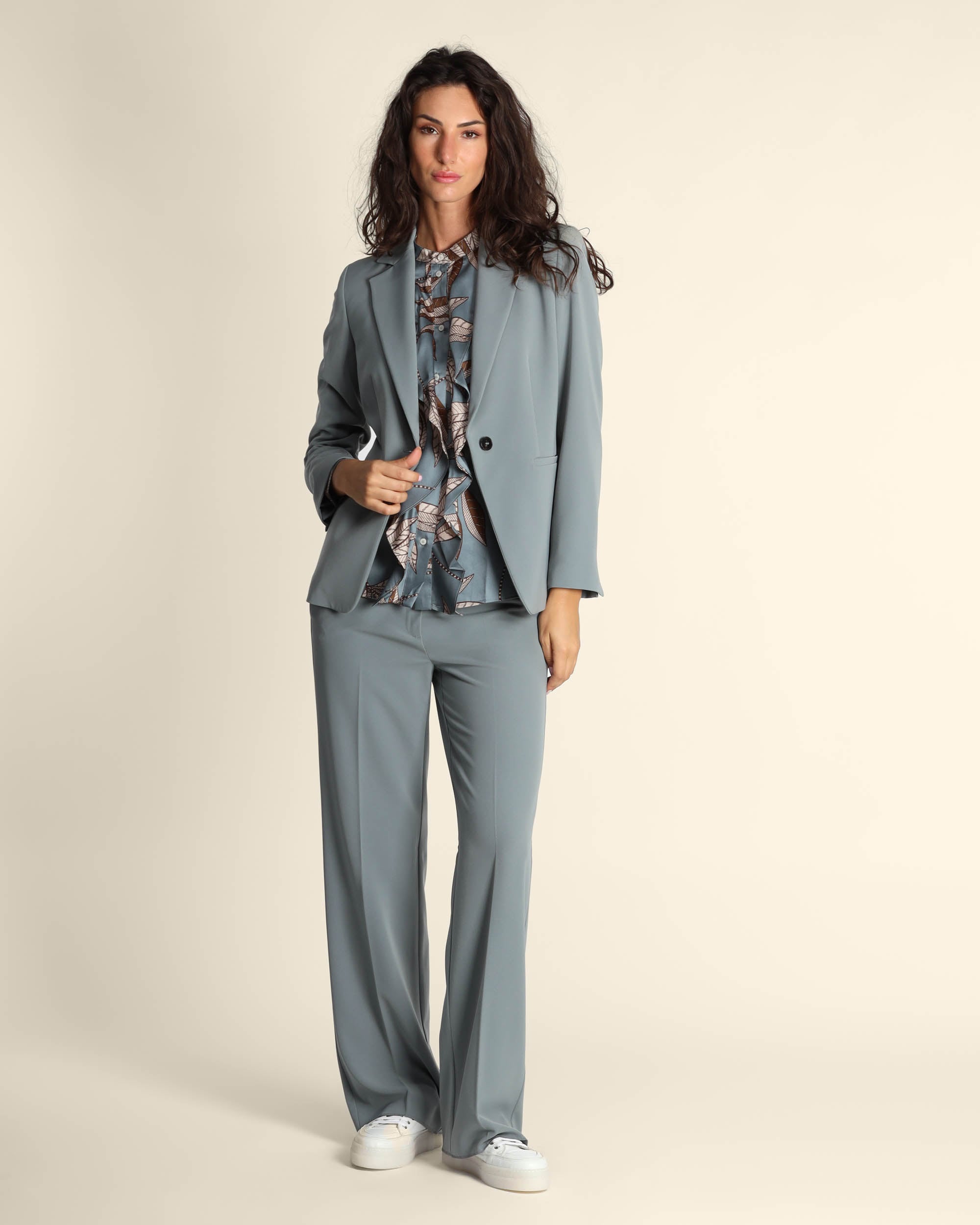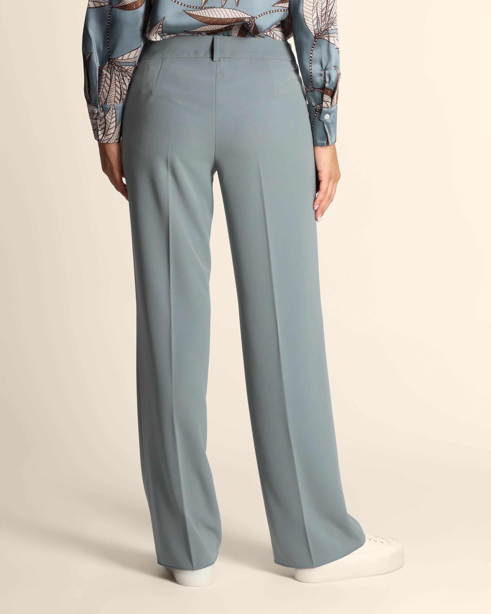 Pantaloni azzurro polvere in twill fluido, chiusura con gancio e zip nascosti, linea morbida, tasche alla francese, piega stirata danti e dietro, la modella indossa una tg.42, la modella ha le seguenti misure: altezza 178, seno 86,vita 65, fianchi 93, collezione donna Emme by Marella Autunno Inverno 2025/26